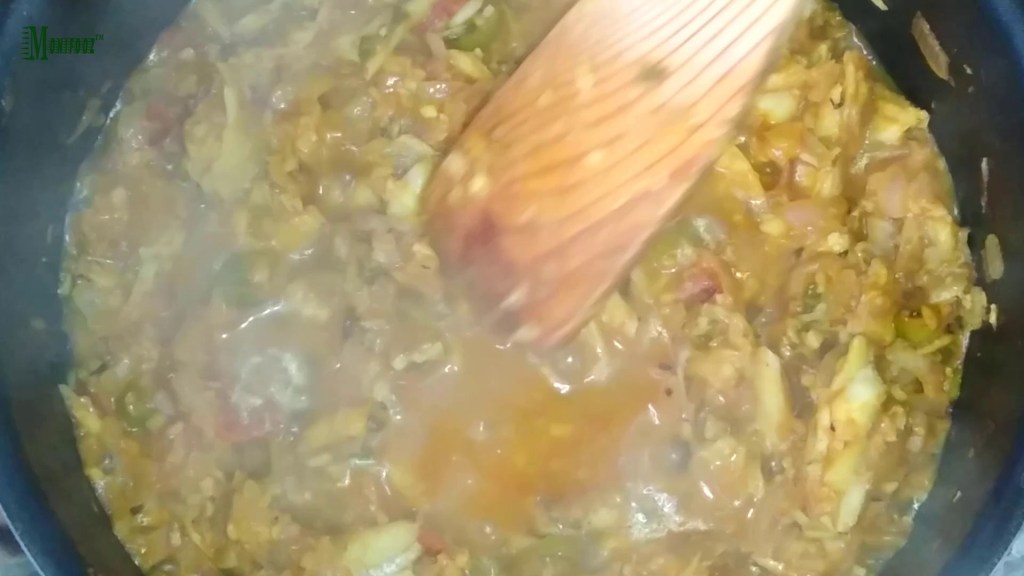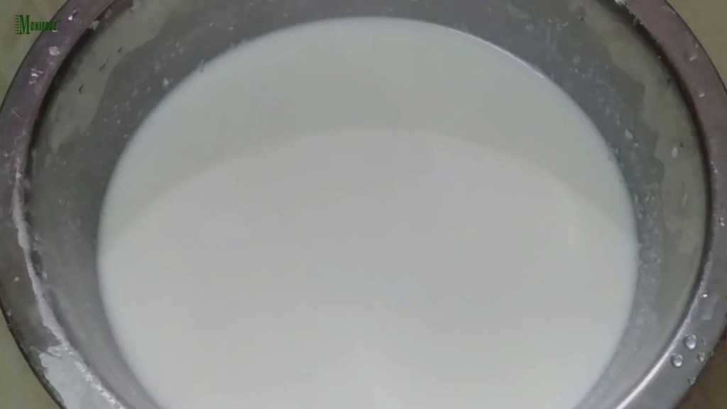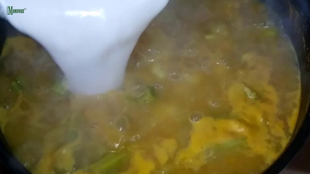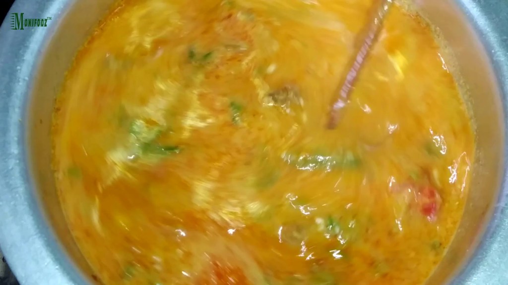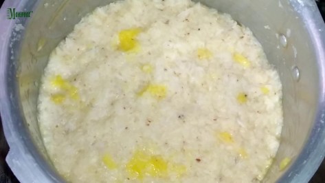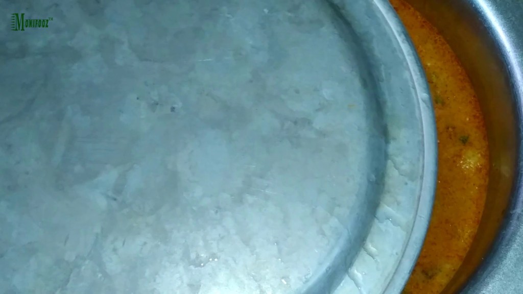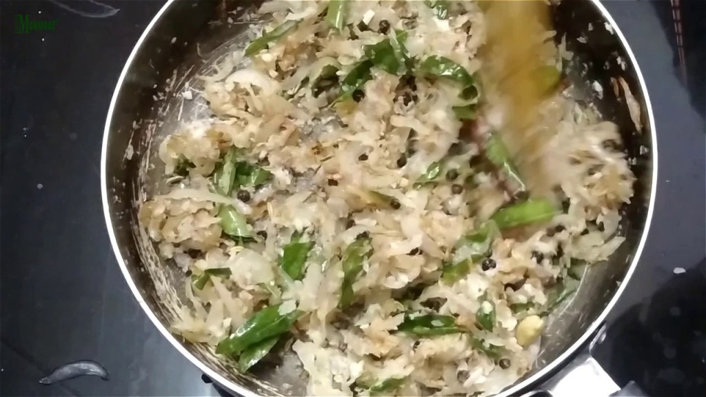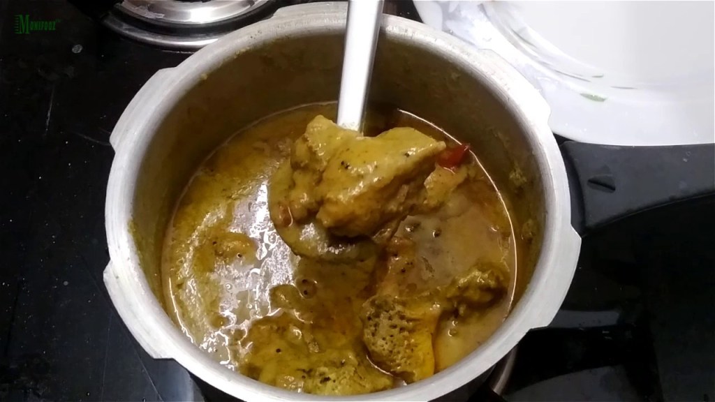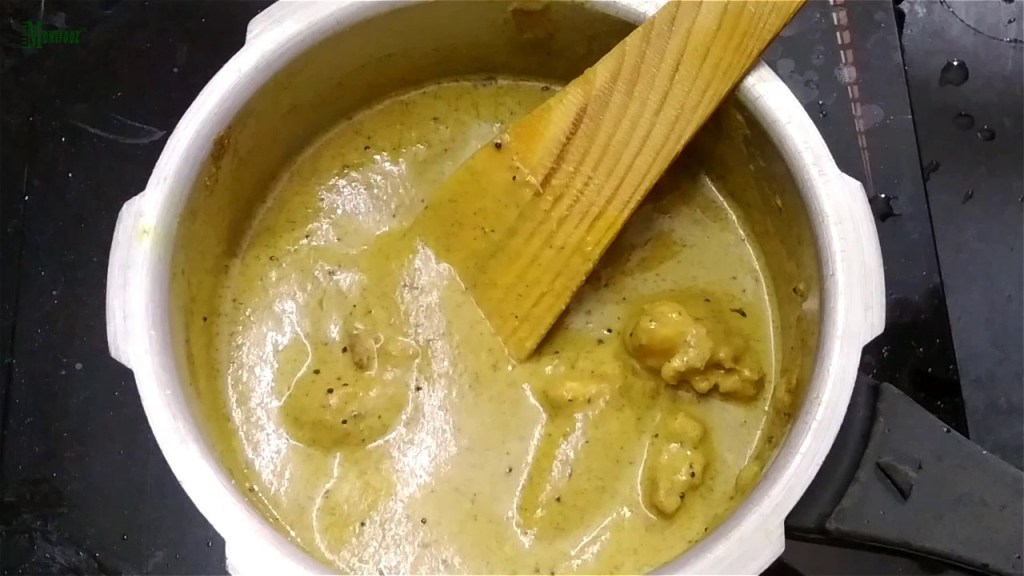 Add the dissolved coconut milk once it starts boiling. Close the lid, but not entirely, to avoid overflow. Wait for 10-15 minutes. Sprinkle some water over the sides once the Oil separates. Reduce the flame to low heat and wait for 5 minutes.