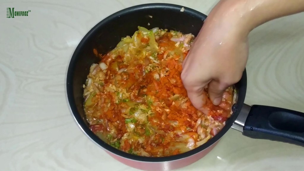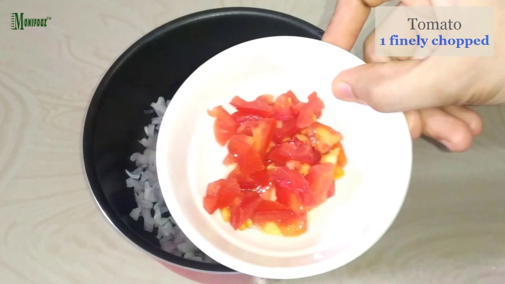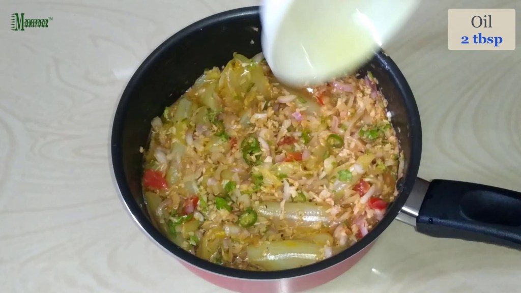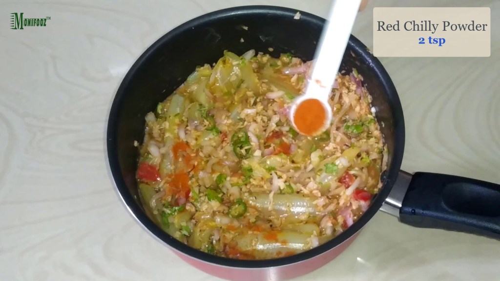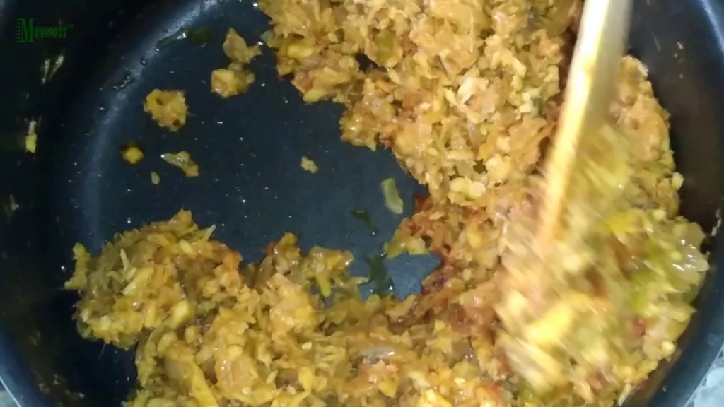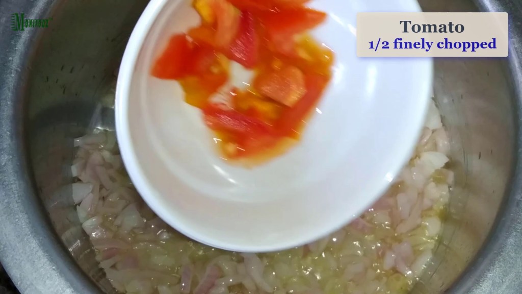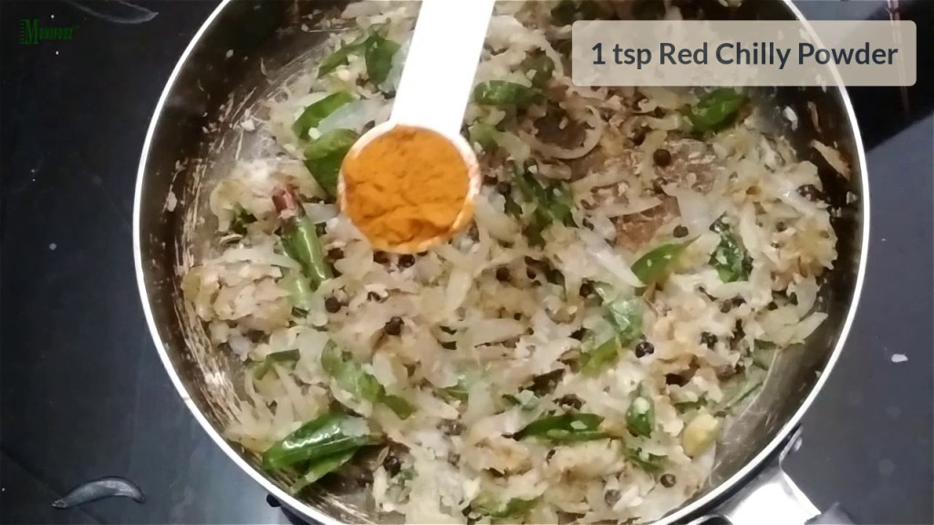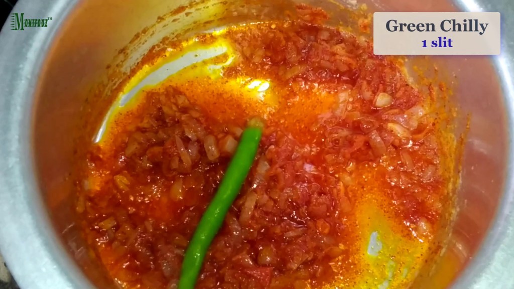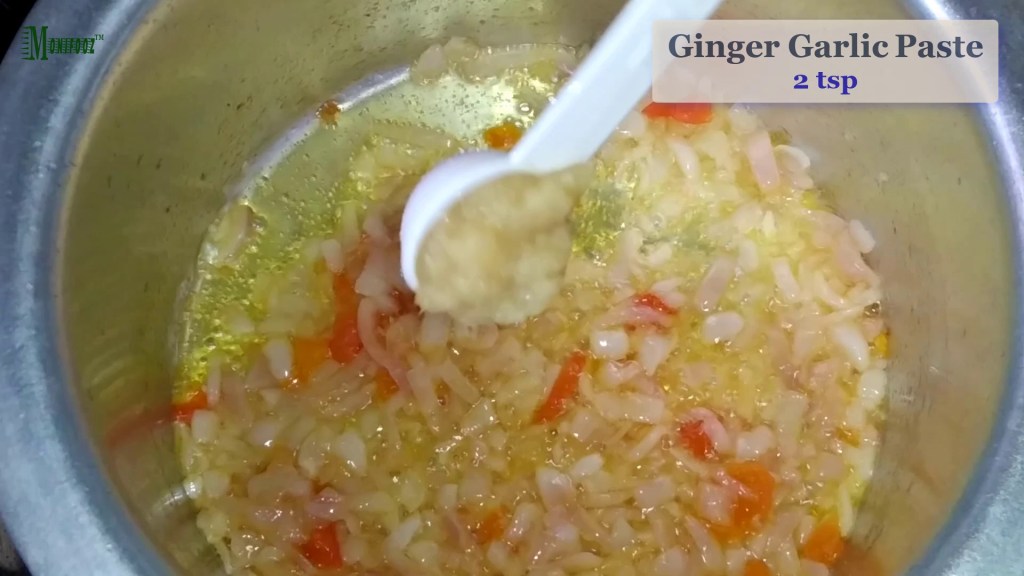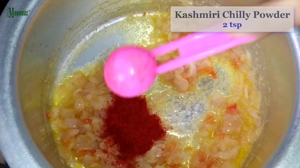 Finally, take a vessel and add 4 tbsp of Oil. Turn on the flame and keep at medium heat. Add three onions, half tomato, and one green chilly. Saute it for a while and later add 2 tsp of ginger garlic paste. Do the sauting again till the raw smell goes out. Add 2 tsp of Kashmiri chilly powder and saute it for a minute.