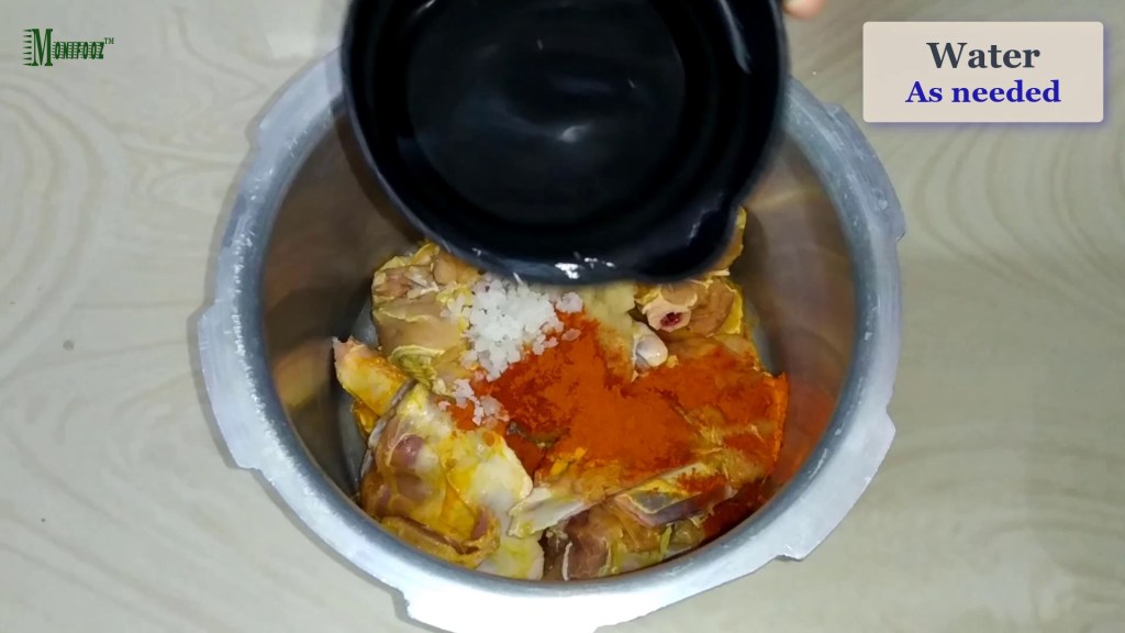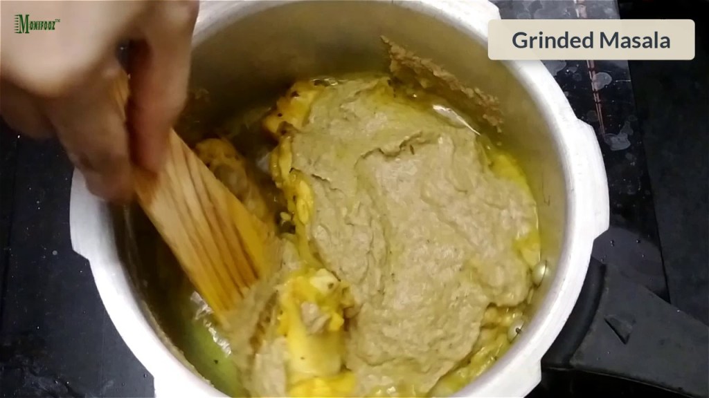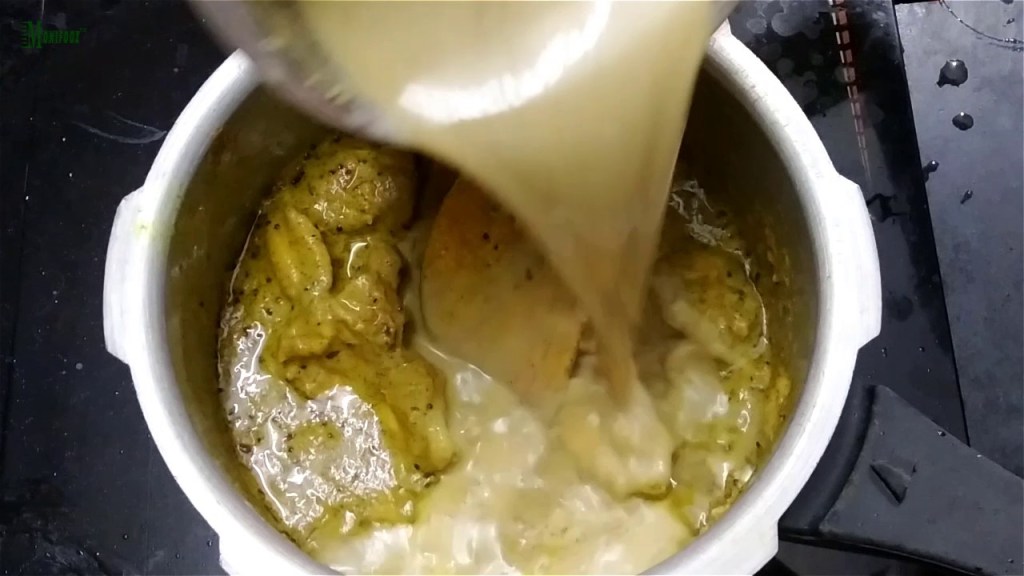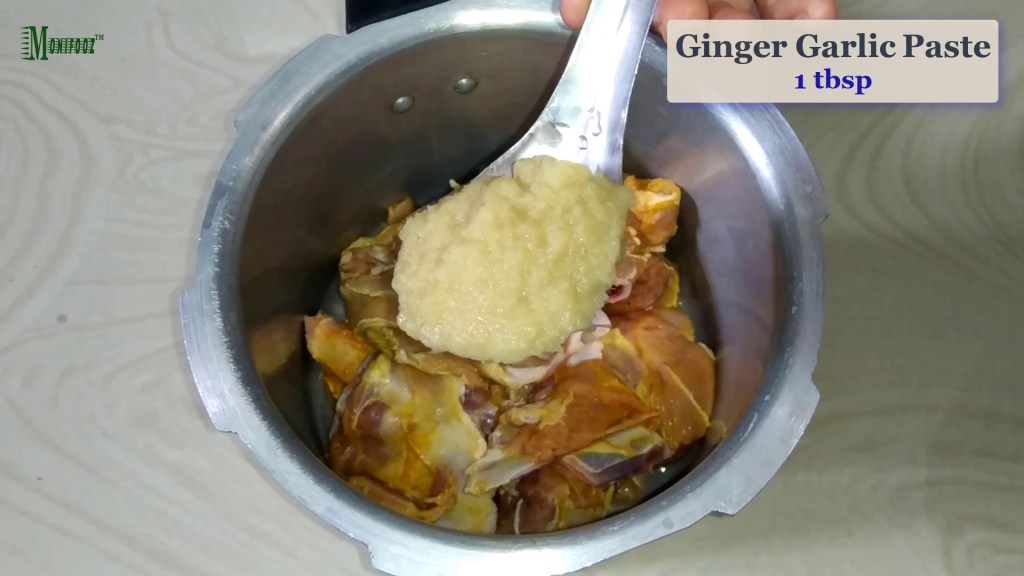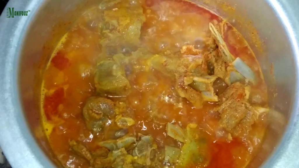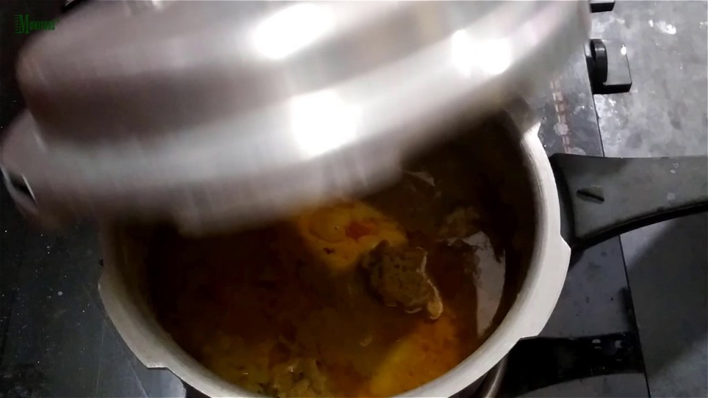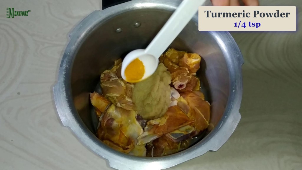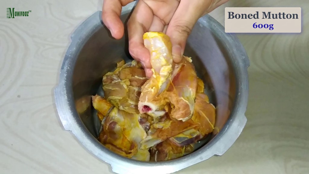 Initially, pre-cook the mutton for 10 to 12 whistles using a pressure cooker with the ingredients listed in the first list.