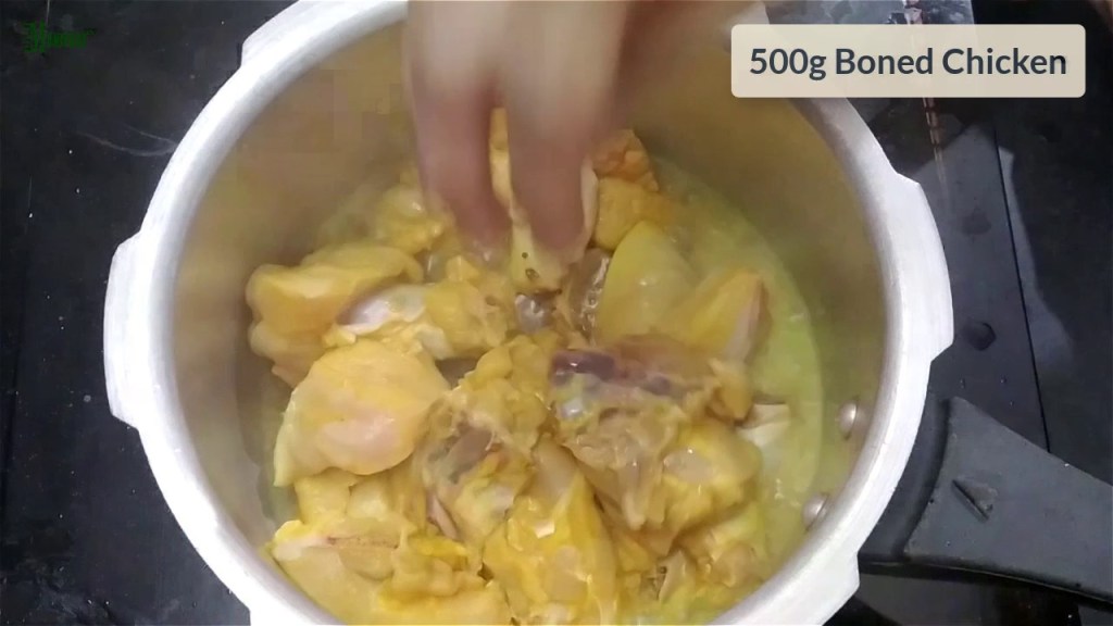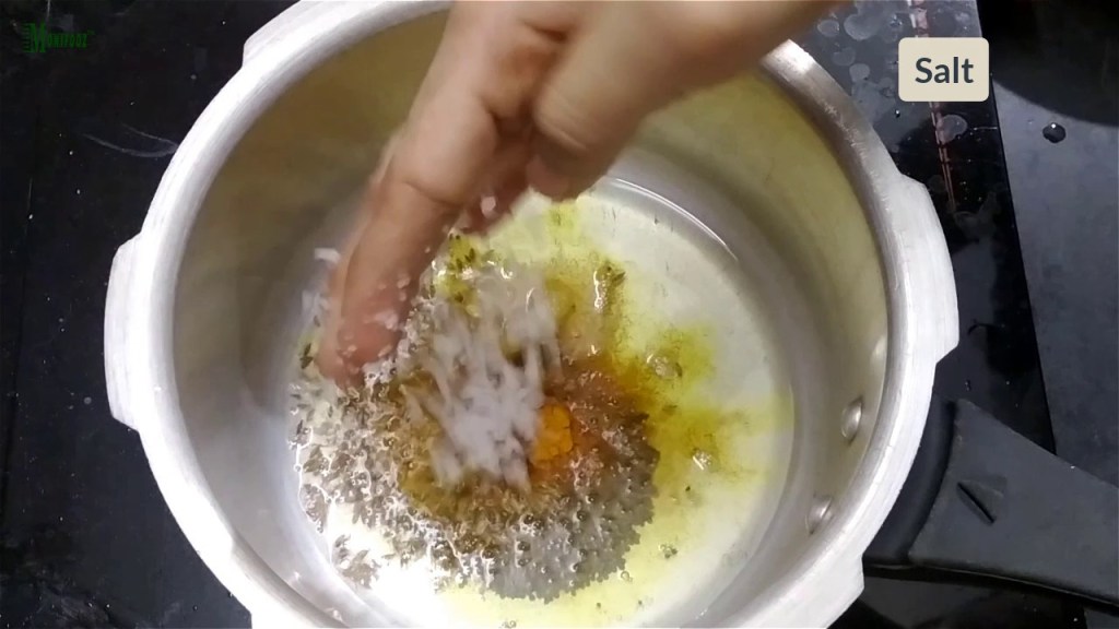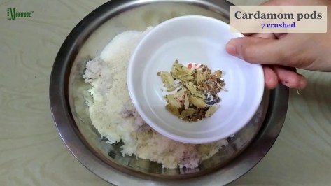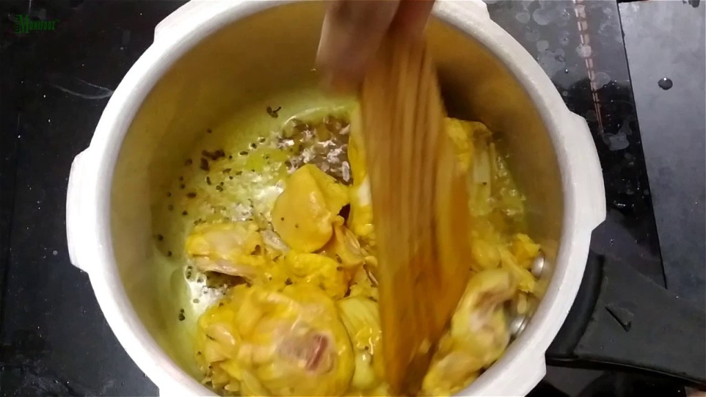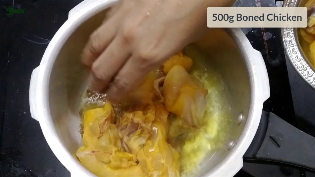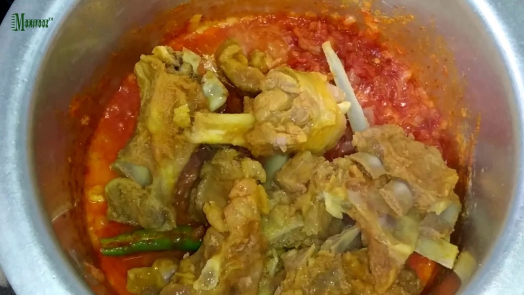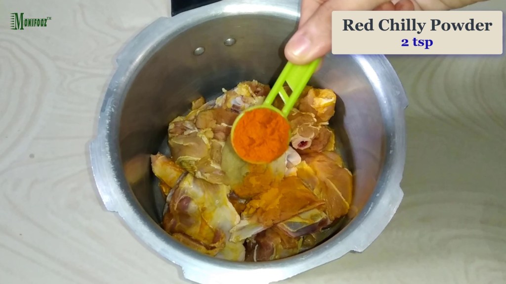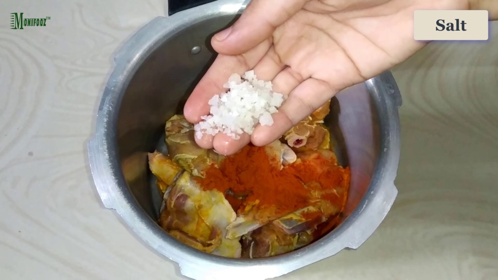 Initially, pre-cook the mutton for 10 to 12 whistles using a pressure cooker with the ingredients listed in the first list.