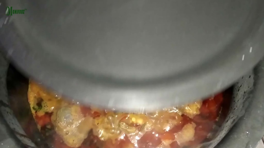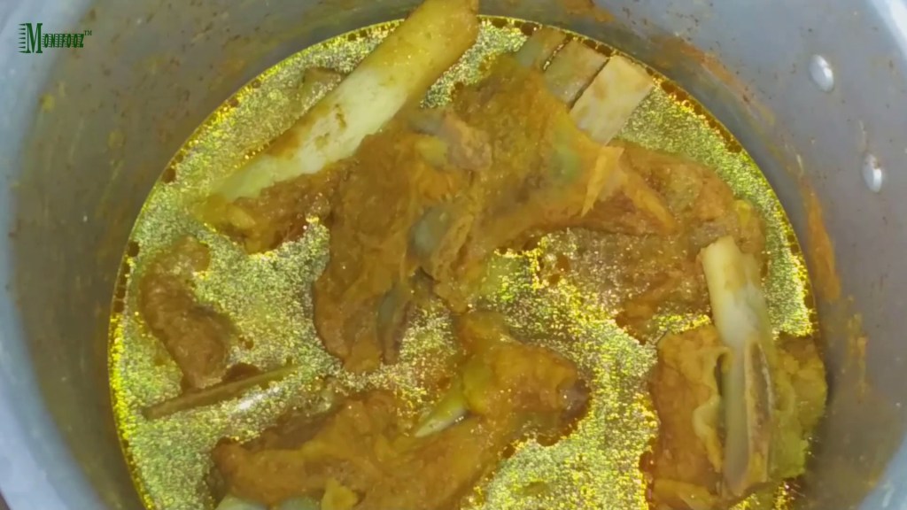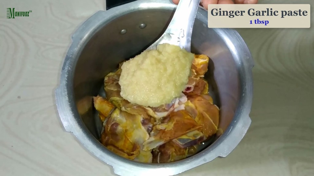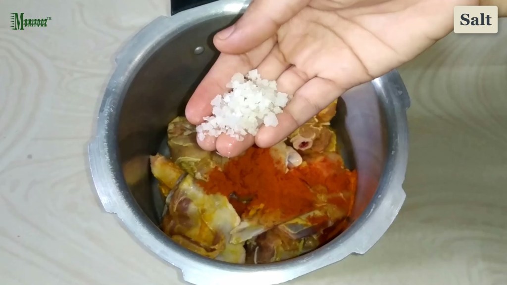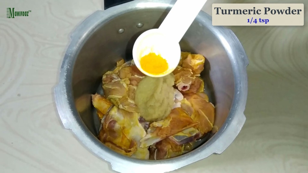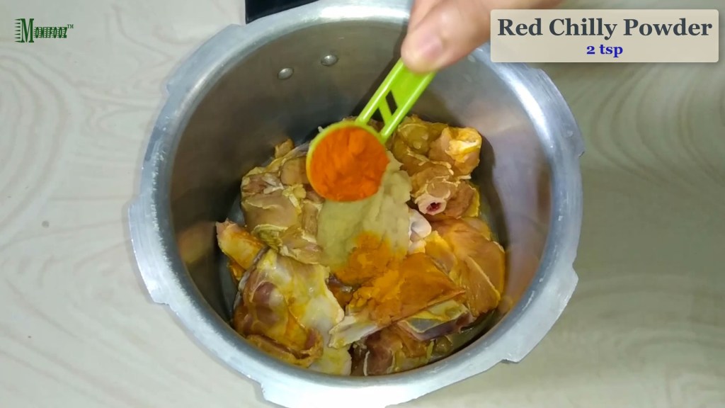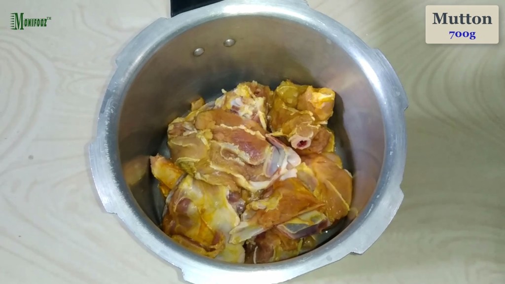 Let us pre-cook mutton in this process. Take 700g of boned mutton in a pressure cooker. Add 1 tbsp of ginger garlic paste, 1/4 tsp of turmeric powder, 2 tsp of a chilly red powder, required salt, and 1.5 cups of water. Turn on the flame with medium heat and cook for 8 to 10 whistles to get it pre-cooked. Keep it along with mutton stock aside.