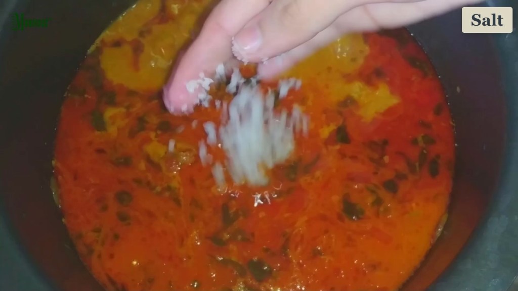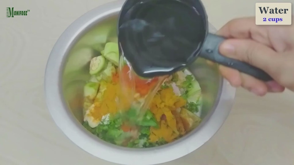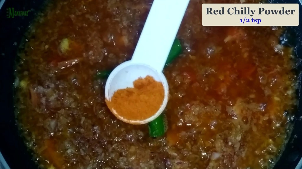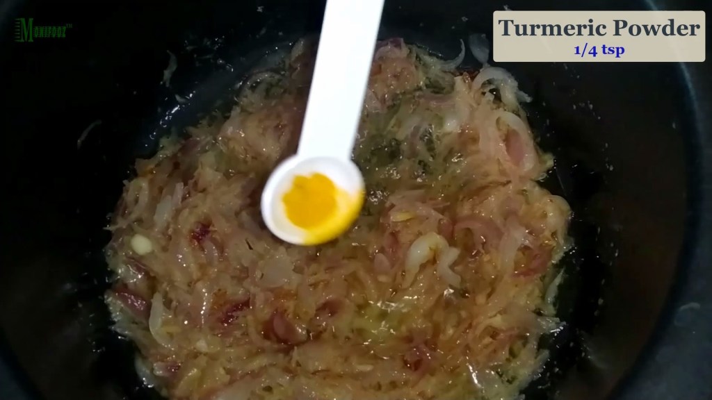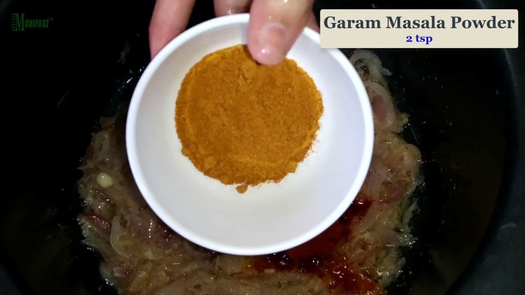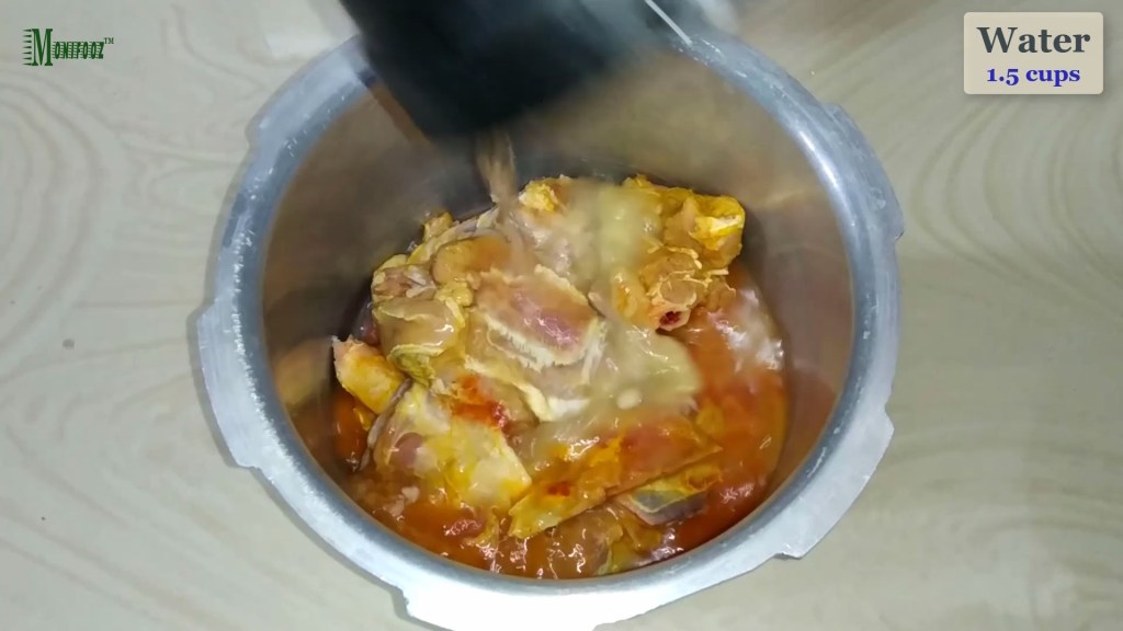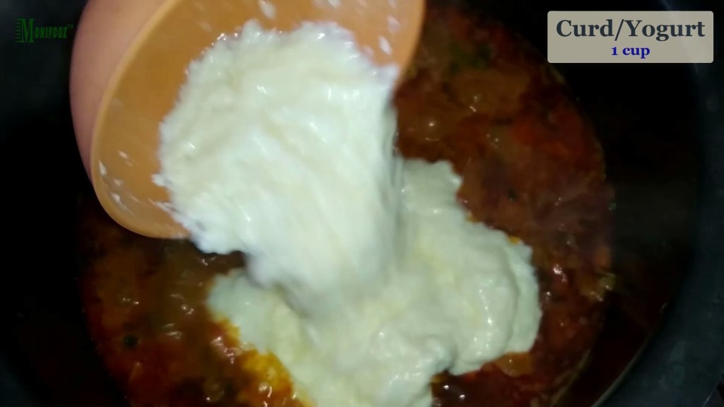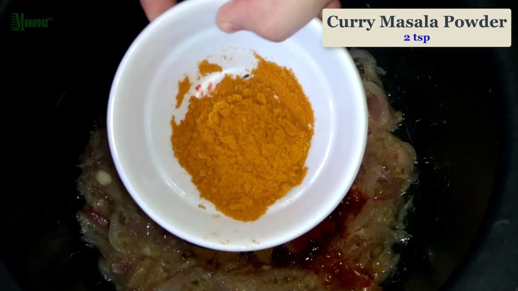 Now add the remaining stuff such as 1 tbsp of ginger garlic paste, 2 tbsp of curd/yogurt, 1/4 tsp of turmeric powder, 1 tsp of coriander powder, 1 tsp of a chilly red powder, and 1 tsp of curry masala powder. Since it is a curry, you need to add 2 cups of water at the end of this step.