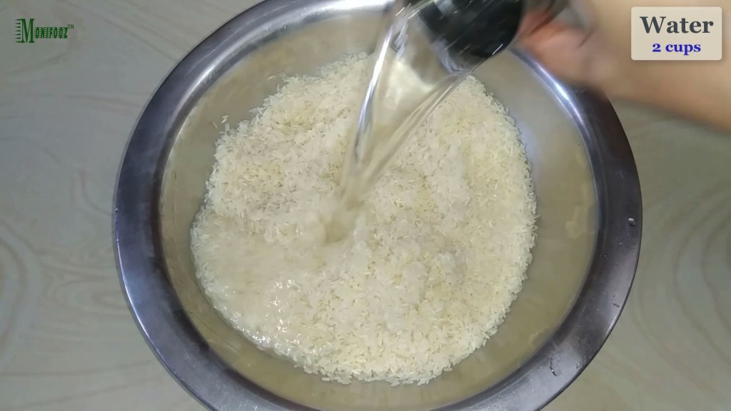 Get 2.5 cups of rice, preferably Ponni Raw or Basmathi rice, in a vessel. Wash and soak it for 30 minutes with 2 cups of water.