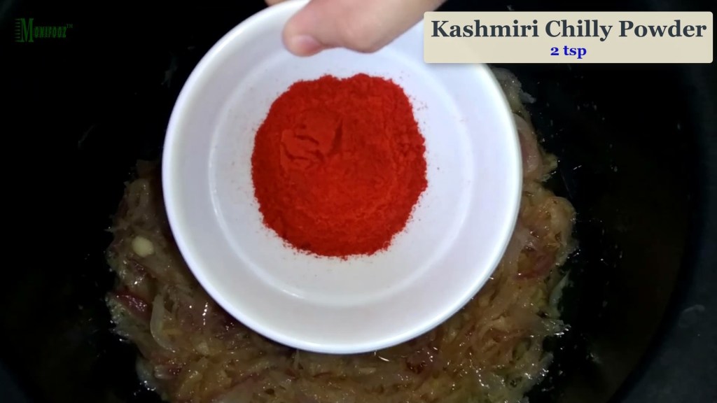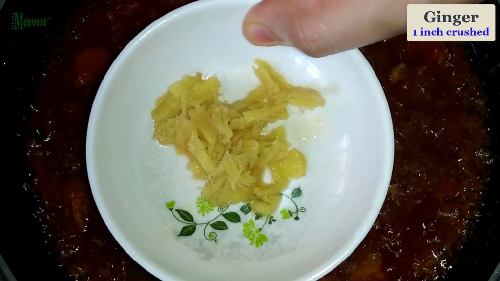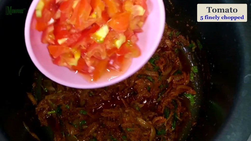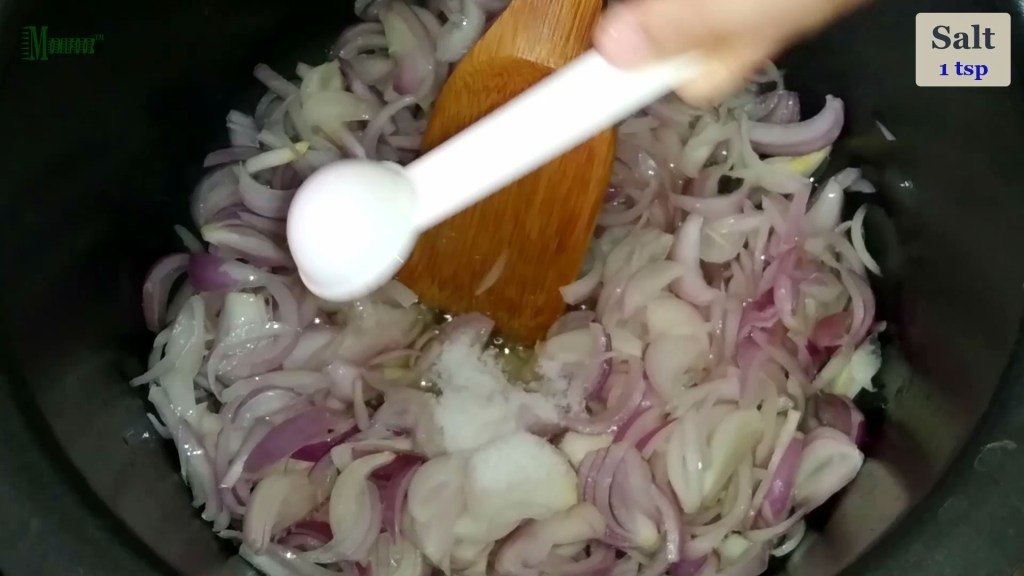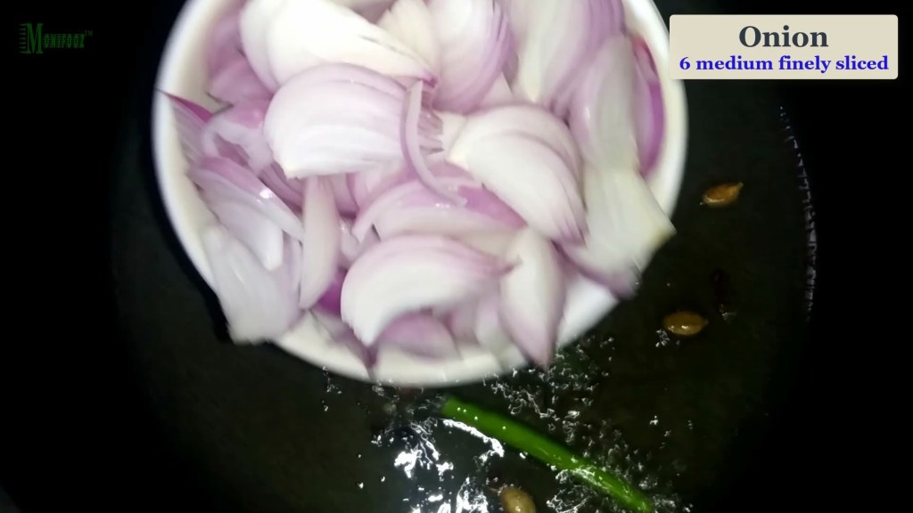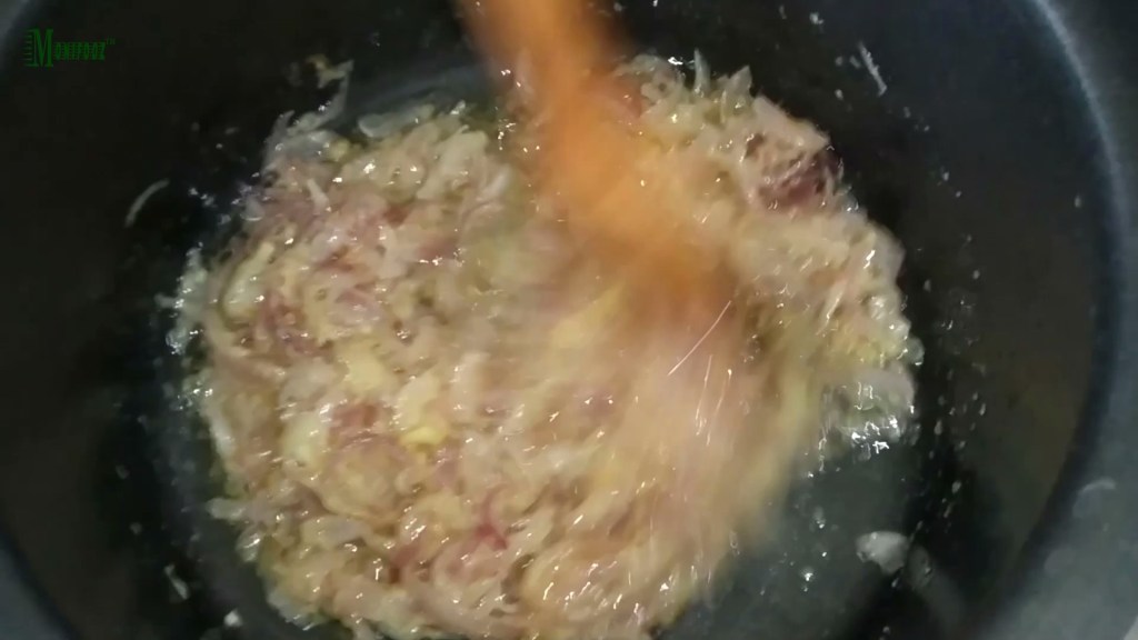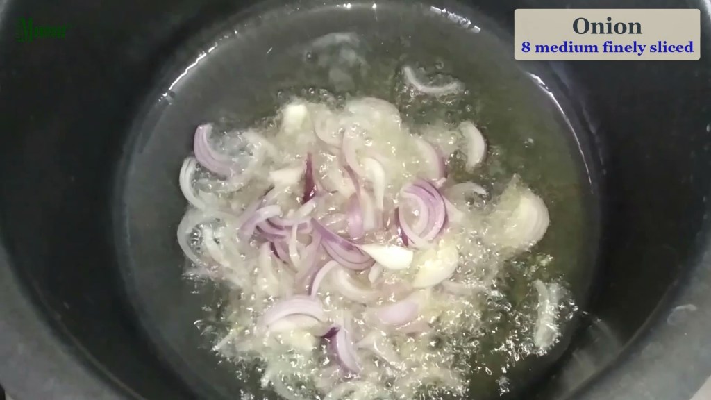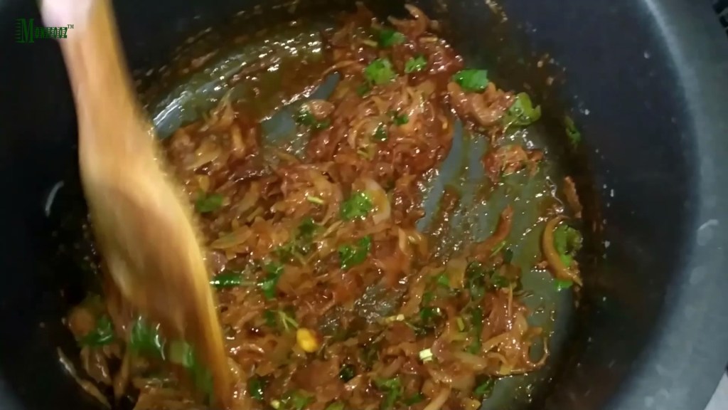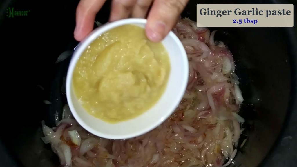 Get a heavy bottom vessel. Heat it initially with 3 tbsp of ghee and oil at medium heat. Add finely sliced eight medium-sized onions with 1 tsp of salt. Fry it for 5-6 minutes until the onion stuff gets golden brown. Add 2.5 tbsp of ginger garlic paste and cook for a minute till the raw smell goes out.
