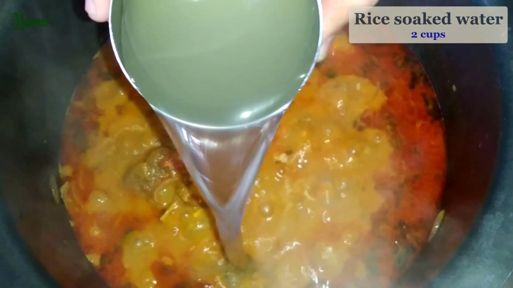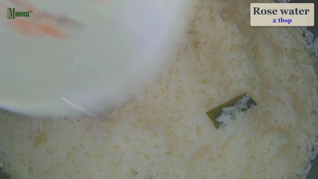 Pour 2 tbsp of curd/yogurt and cook for a minute. Add 8 cups of water and required salt as per your preference. Increase the flame to high heat. Cover with lid and cook until the water bubble comes. It’s time to add the prepared rice before the mixture starts boiling. Keep cooking with the same high heat till you see there is a little water left. Just reduce the flame to low heat and cook for 15 minutes with a covered lid. During this time, you place the vessel filled with water on top of it. As the last ingredient, add 2 tbsp of rose water over the rice and mix it well. Cover and cook again for another 5 minutes.