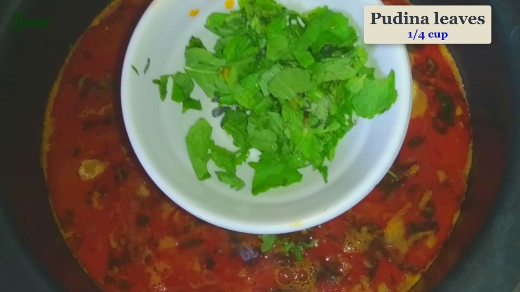 Add 1/4 tsp of turmeric powder, 2 tsp of Kashmiri chilly powder, 2 tsp of garam masala powder, 2 tsp of curry masala powder, and mix it well. Get 1/4 cup of pudina and coriander leaves ready and mix it. Add five finely chopped tomato, mix it and wait for a minute. Add pre-cooked mutton along with 1.5 cups of its stock. Cover with lid and cook for 5 minutes.