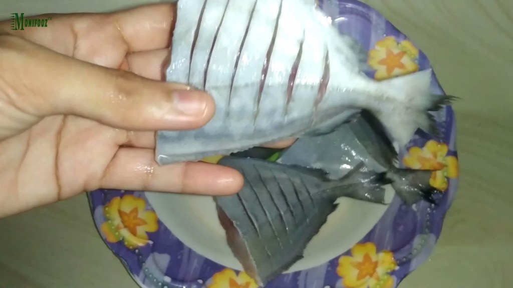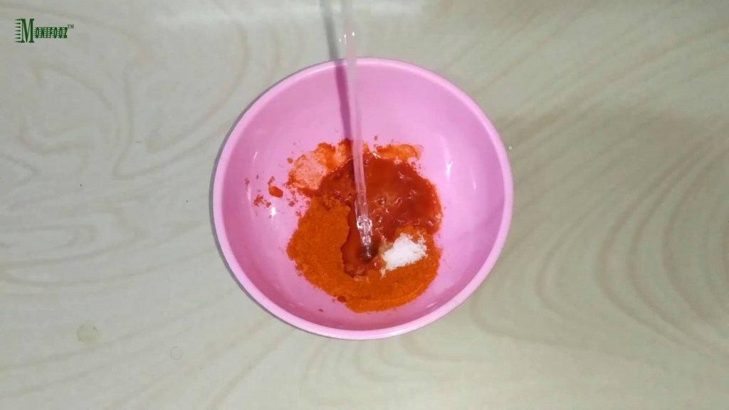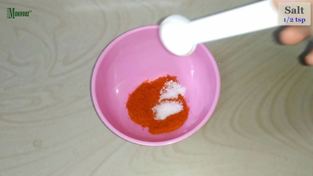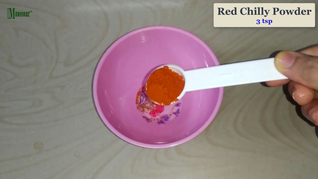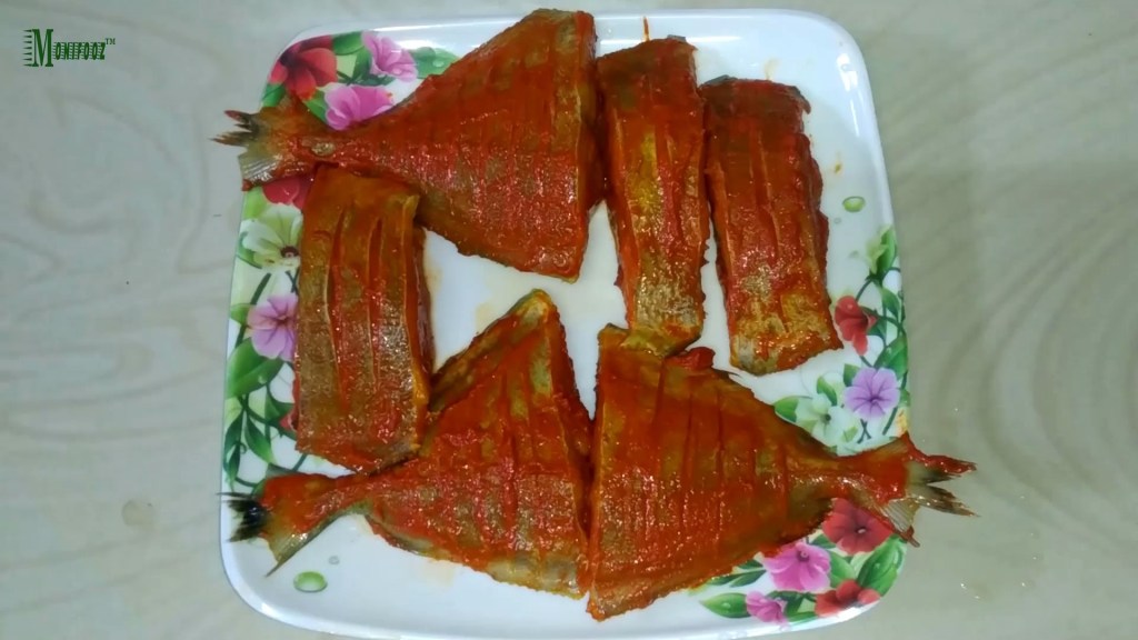 Any kind of fish is excellent for this recipe. Take six pieces of black pomfret fish and make slits across the surface equally spaced at both sides. Get 3 tsp of chilly red powder along with 1/2 tsp of salt. Mix it with a little water to make it a paste. Apply it on all pieces of fish on its surface. Those slits help in spreading over the chilly masala like paste well. Keep this stuff for the next process.