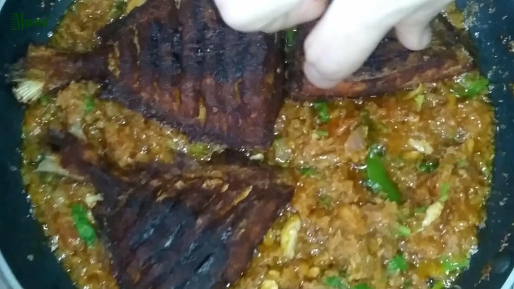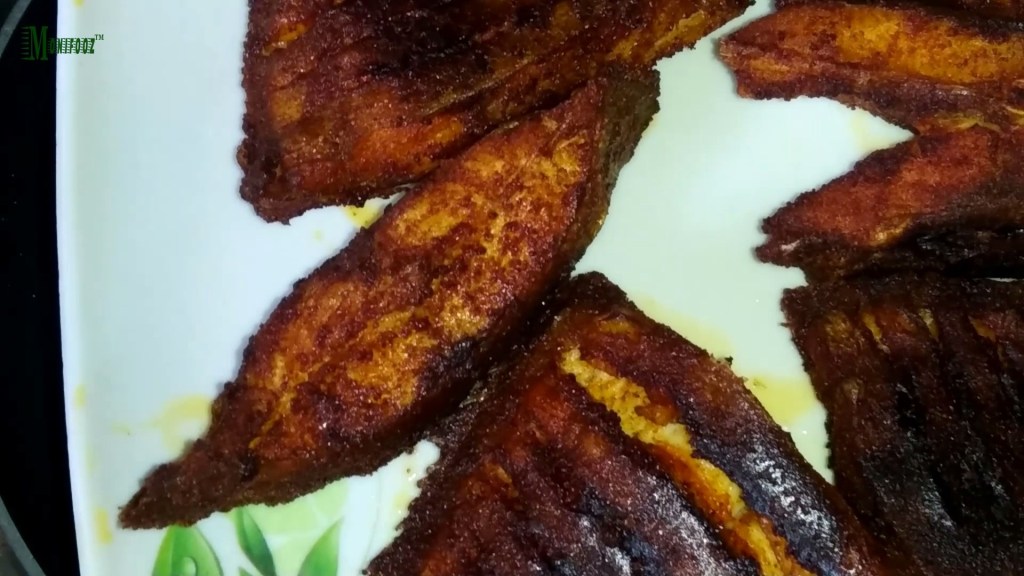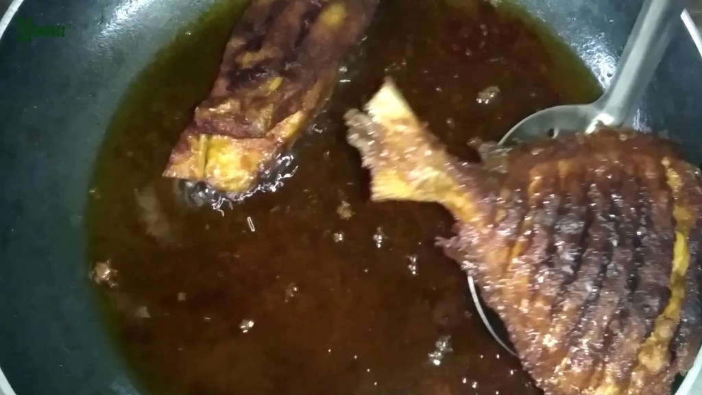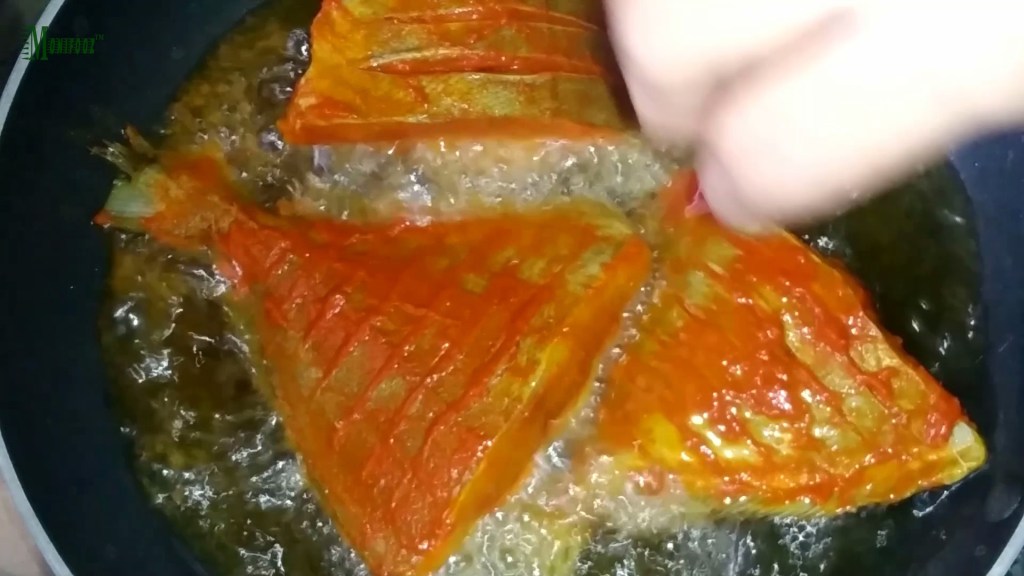Take a pan with 4 tbsp of oil and heat it at medium heat. Put all the pre-prepared fish pieces one by one and do shallow fry it until it gets fried. Take the fried fish pieces out and keep it aside.