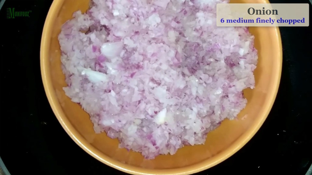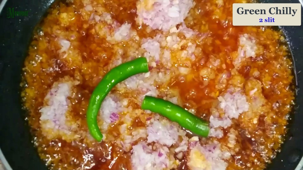Use the same pan and add another 1 tbsp of oil to it. Keep the flame at medium heat again. Add six medium-sized finely chopped onions, two green chilly with slit, one finely chopped tomato, and fry it for 4-5 minutes. Add 1/2 tsp of chilly red powder, 1/2 tsp of salt, and mix it.