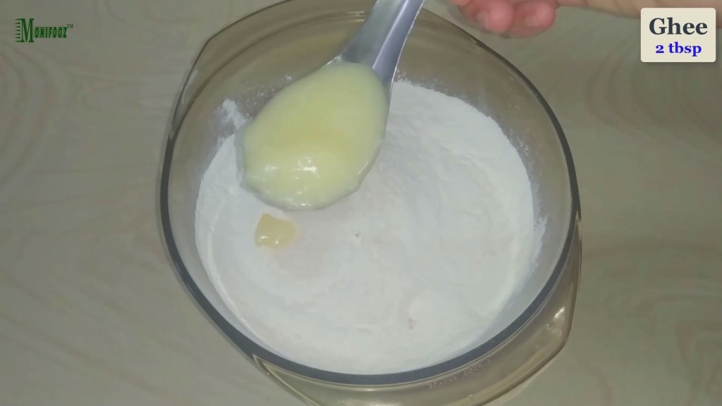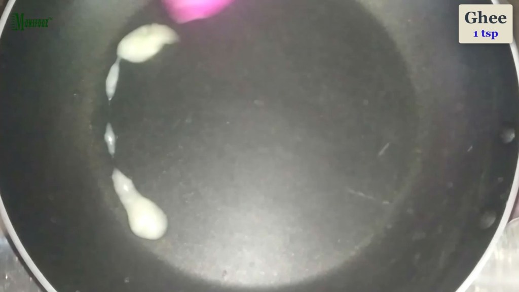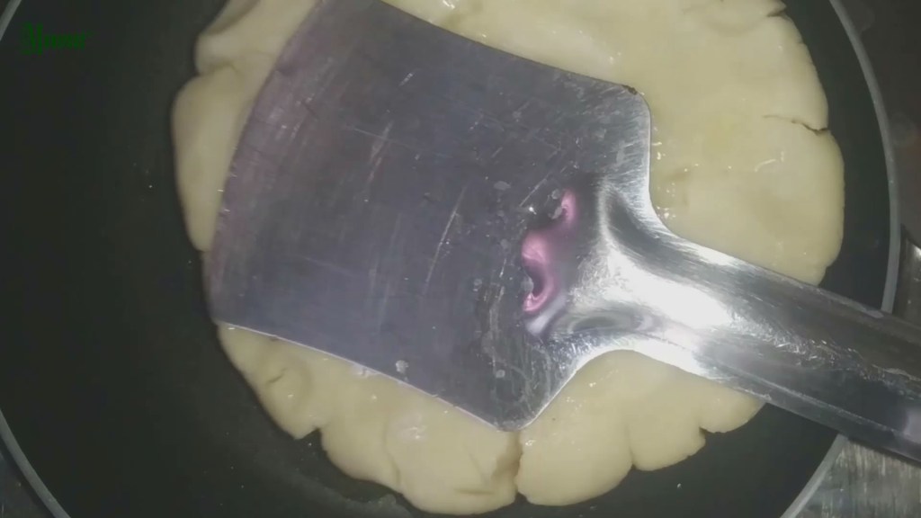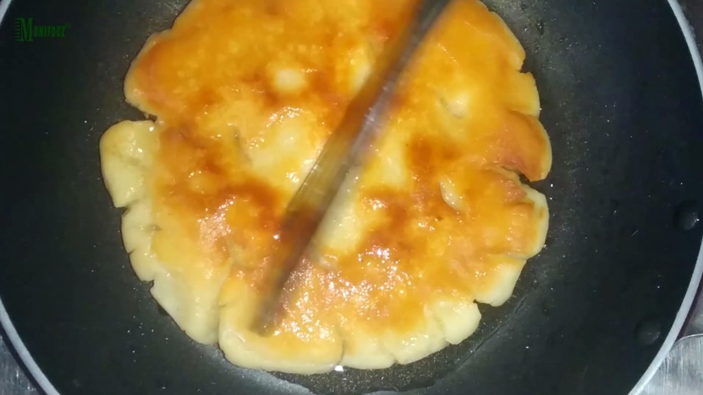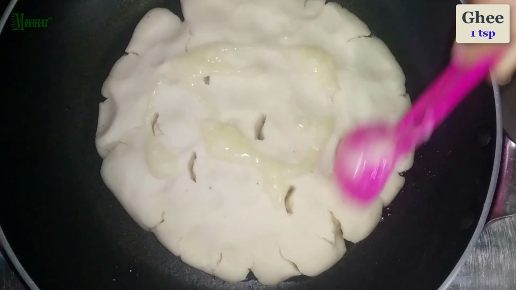 Add 1 tsp of ghee in a pan and heat at medium heat. Flatten each ball of dough like a thick and round shaped to make a flatbread. Could you place it in a pan and make holes spread over the surface? Yes, you have to. Add 1 tsp of ghee on top of it. You cook it for 8-10 minutes until it turns golden brown on both sides. During that time, you turn it then and there. You do the same steps for another ball to get the second bread. Now the Oratti (raw rice flatbread) is ready to serve!