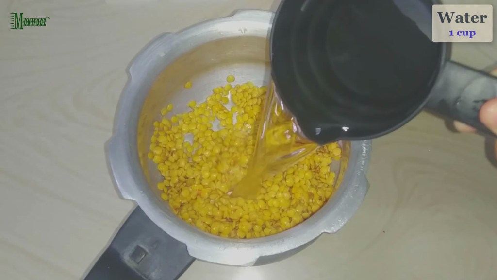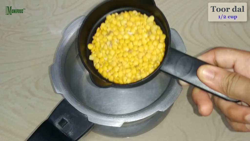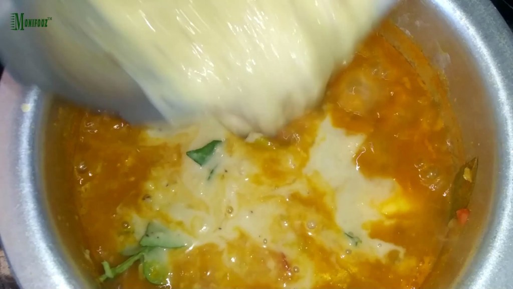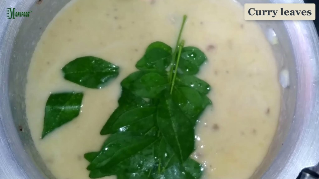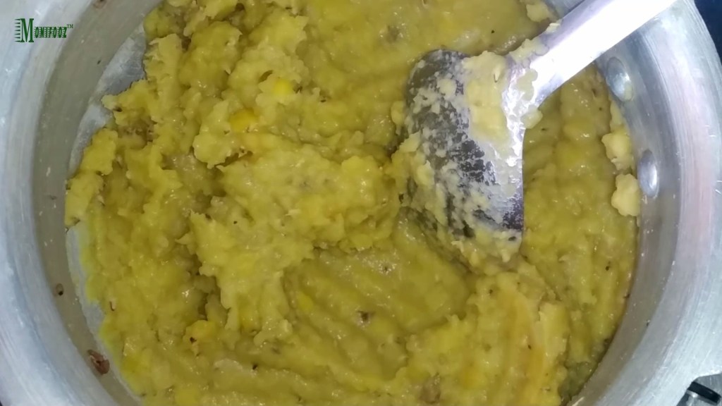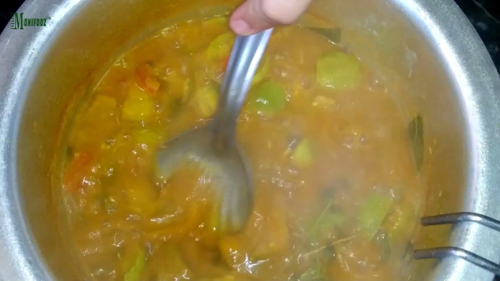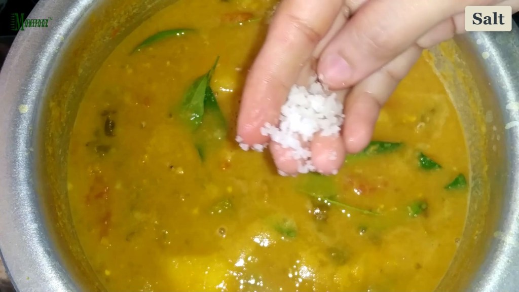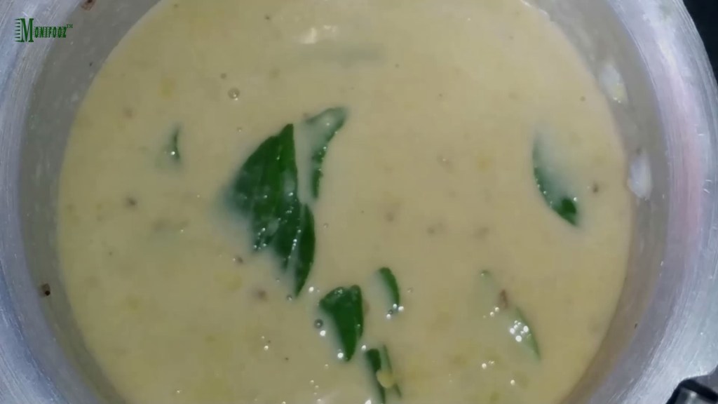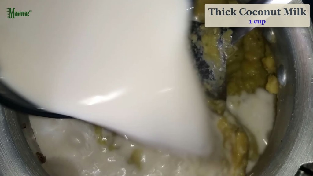 Take 1/2 cup of toor dal, wash and soak it for 10 minutes with 1 cup of water in a pressure cooker. Turn on the flame with medium heat and wait for three whistles. Mash it well to make like a paste. Add 1 cup of thick coconut milk with curry leaves into it and mix well. You get the mixture with dissolved coconut milk.