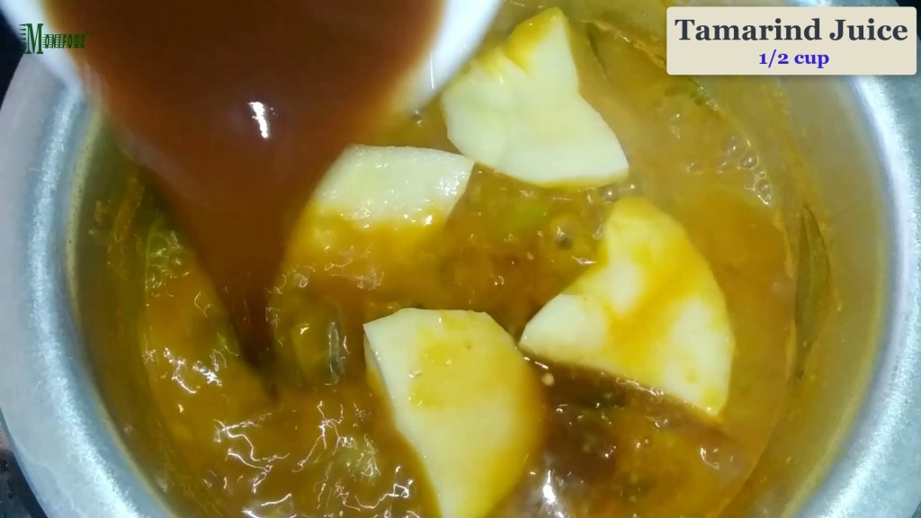 Turn on the flame with medium heat. Close the lid with a little open and cook for 10 minutes. Mash it well. Add four pieces of raw mangoes with a 1/2 cup of tamarind juice extract. Cover the lid as usual and cook for 5 minutes. Pour the dissolved dal into it, add preferred salt and cook for 5 minutes again. Turn off the flame as Dalcha curry is ready for serving!