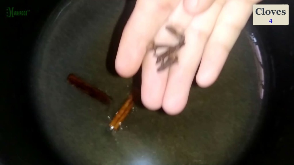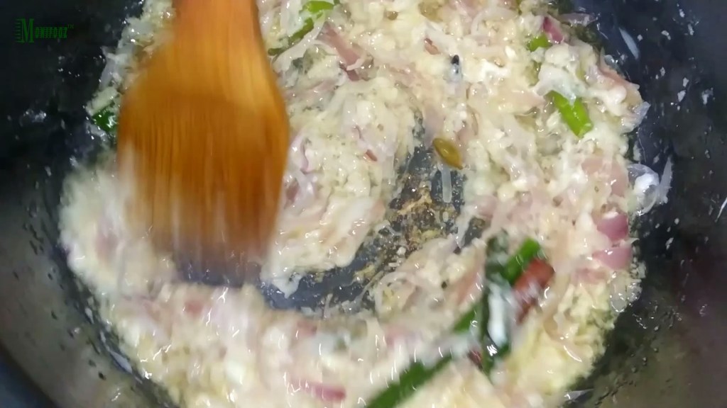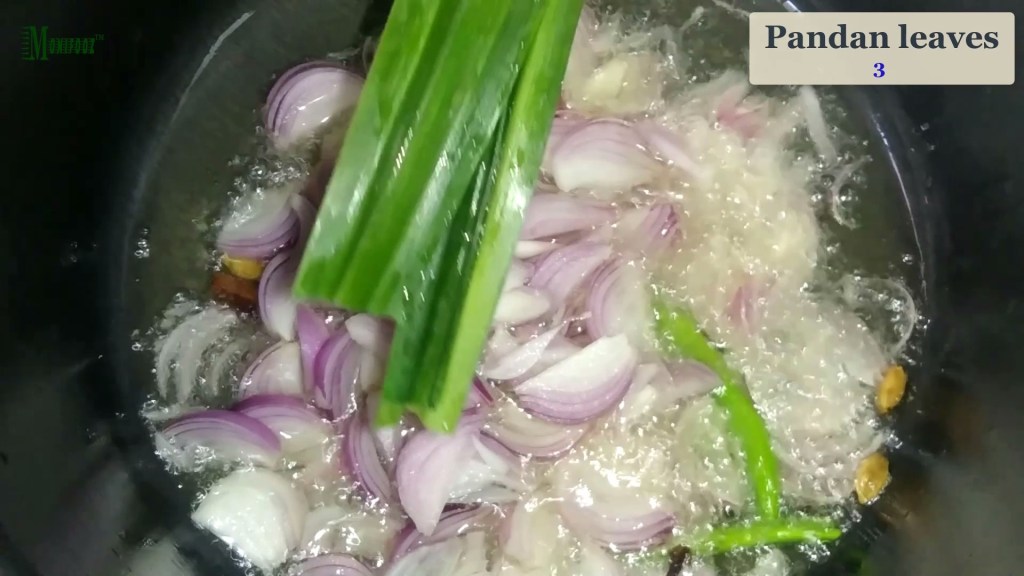 Take a heavy bottom vessel and keep the flame at medium heat. Add 4 tbsp of ghee and Oil individually. Add two cinnamon, four cloves, four cardamom pods, two green chilly with slit, six medium-sized finely sliced onions, and three pandan leaves. Fry it for 2 to 3 minutes. Saute it till the raw smell goes out after adding 100g of crushed ginger and 100g of crushed garlic.