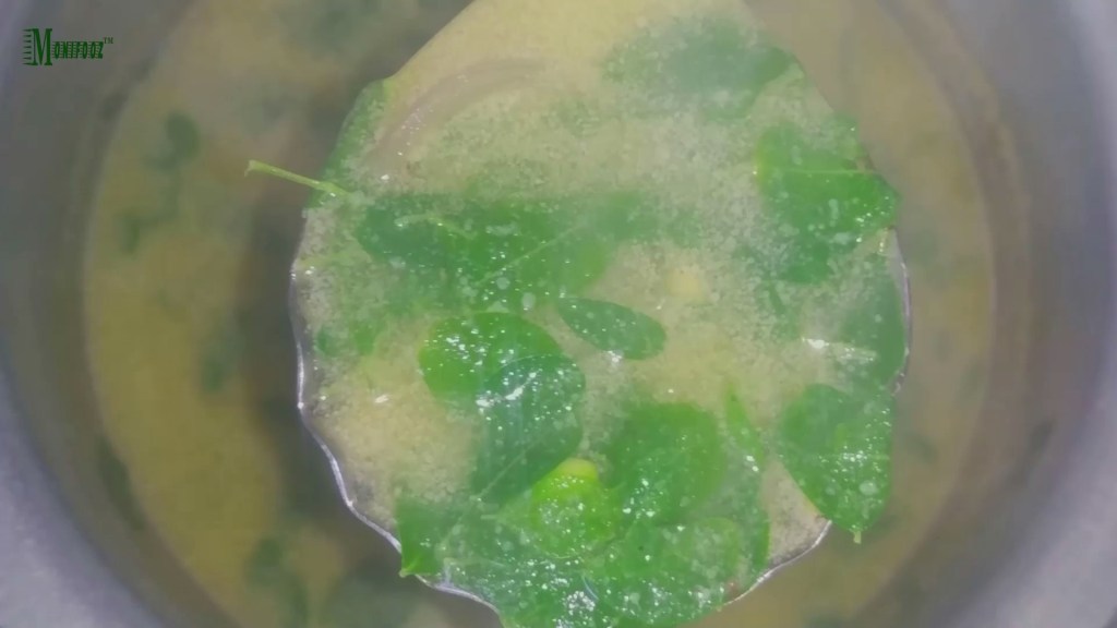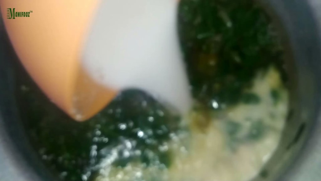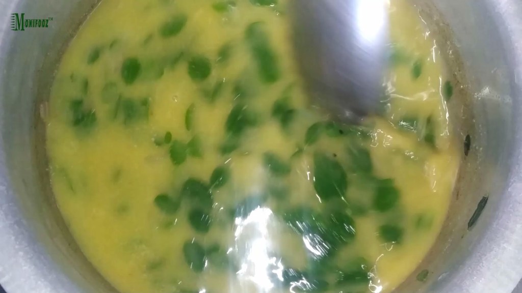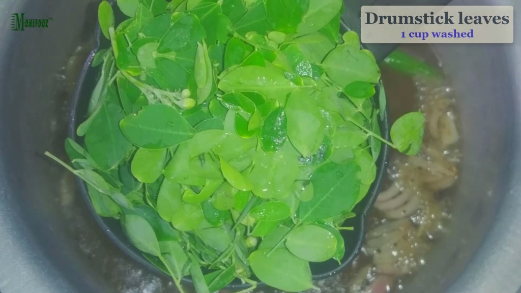 Add 1 cup of washed drumstick leaves right after the mixture starts boiling and mix it well – Cook for 2 minutes with a covered lid. As usual, close the top with a little open. After opening the lid, cook for 5 minutes with medium heat. Check whether the leaves cooked well or not? Once cooked, add the dissolved coconut milk. Mix it and cook for a minute. Turn off the flame as the drumstick leaves soup is ready!