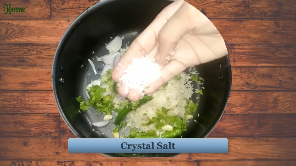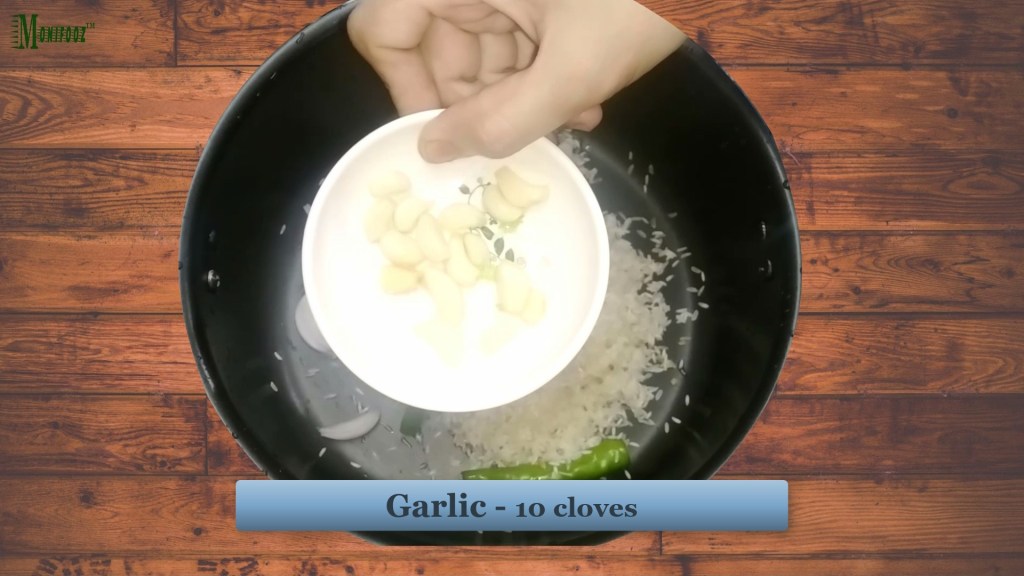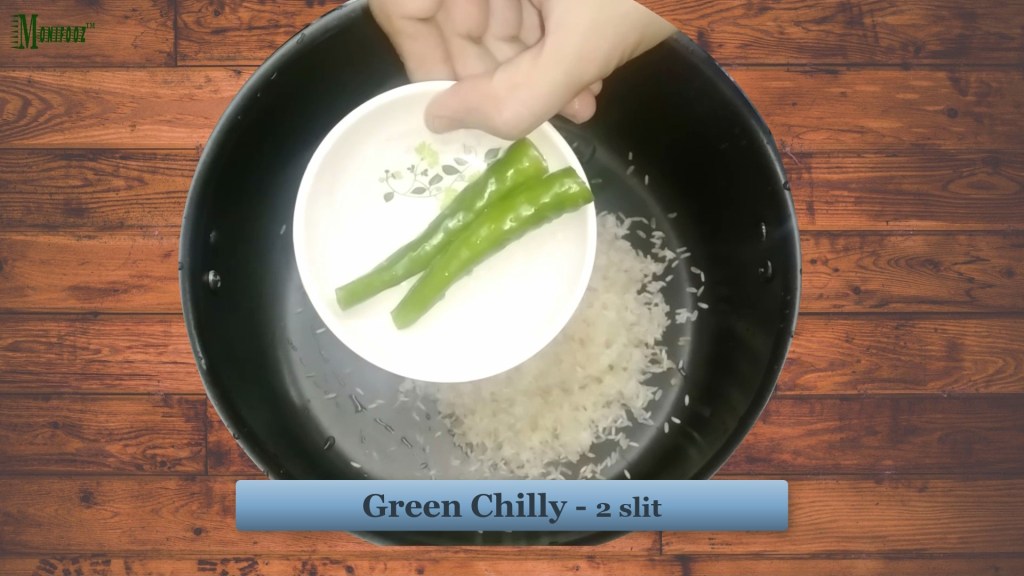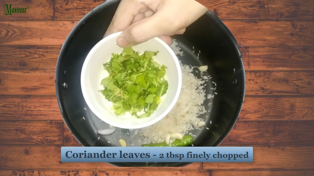 Take a cooking pan and add the washed rice along with fenugreek. Add two green chilly with slit, one medium sliced onion, ten cloves of garlic, 2 tbsp of finely chopped coriander leaves and crystal salt as per your preference.