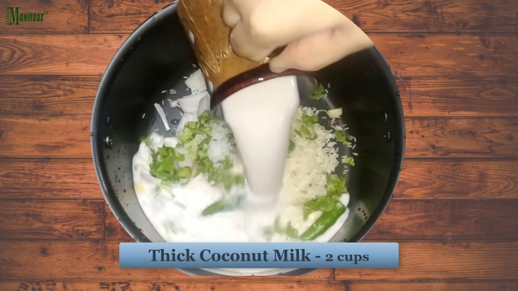 Pour 2 cups of thick coconut milk and 1.5 cups of water into it for parboiled rice. If you use basmati rice, you’ve to pour 1 cup of coconut milk and 1/2 cup of water. Turn on the flame with medium-high heat. Cover with lid and cook for 15 minutes. Stir it occasionally. Reduce the flame to low heat and cook for another 10 minutes. Stir it once after five minutes this time. Now, the coconut milk rice is ready. You can enjoy it with chicken or mutton curry!