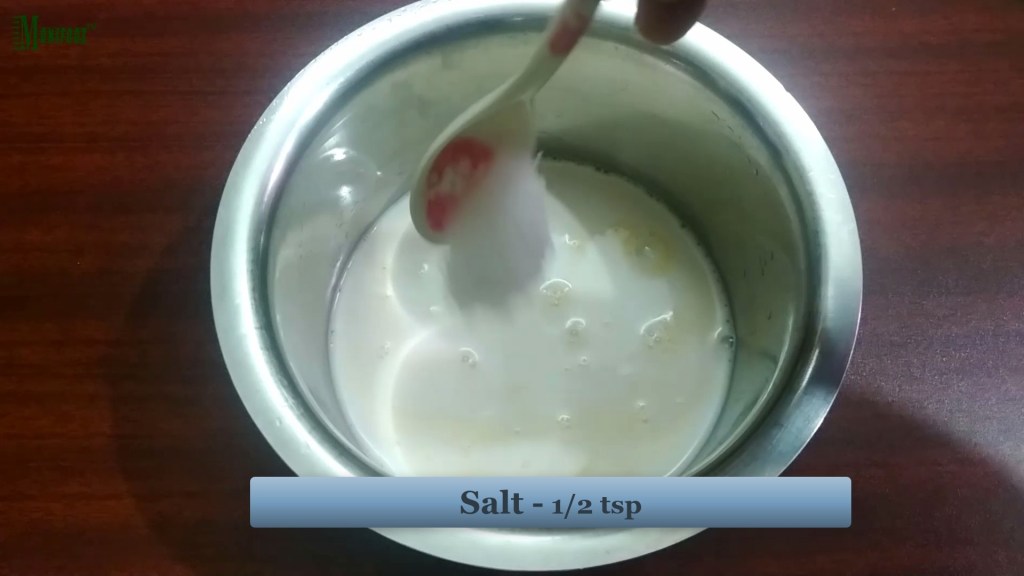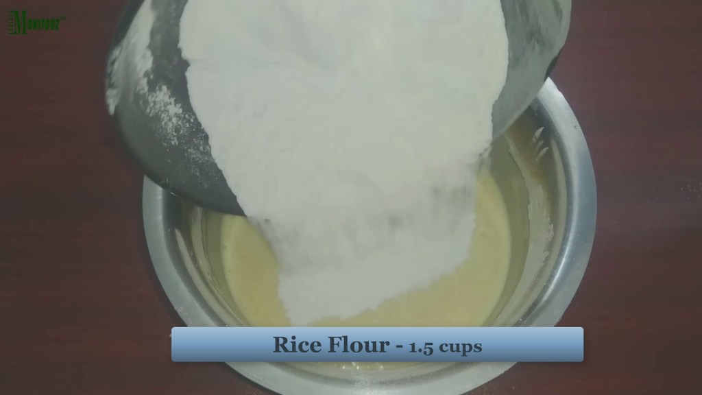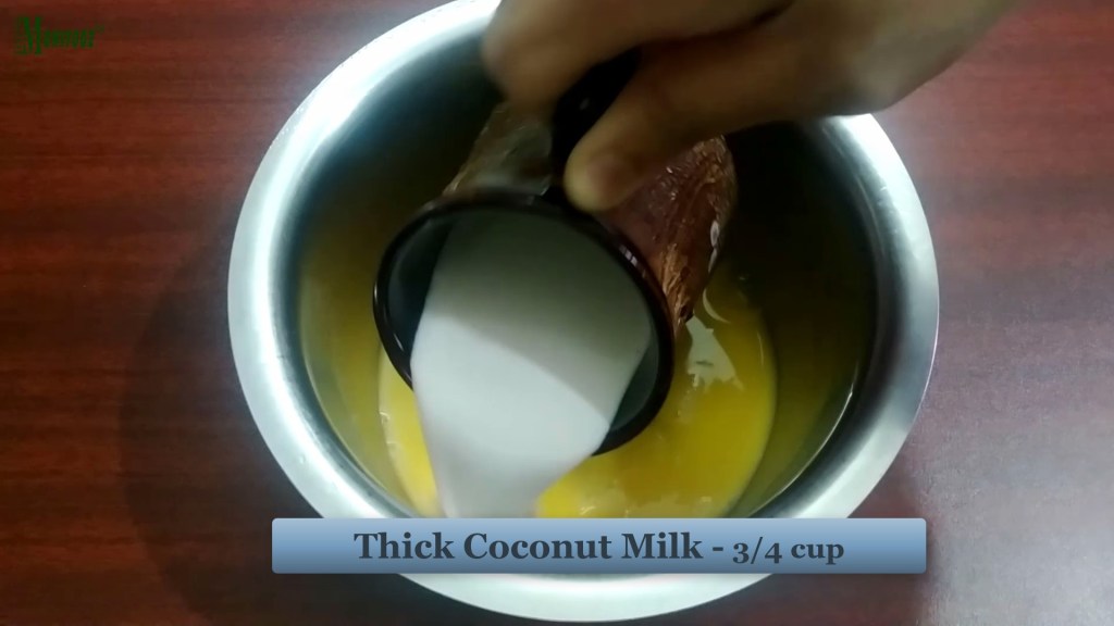 Take a wide bowl or vessel and add two beaten eggs into it. Pour 3/4 cup of thick coconut milk along with 1/2 tsp of salt and mix it well. Add 1.5 cups of rice flour into it and mix it well.