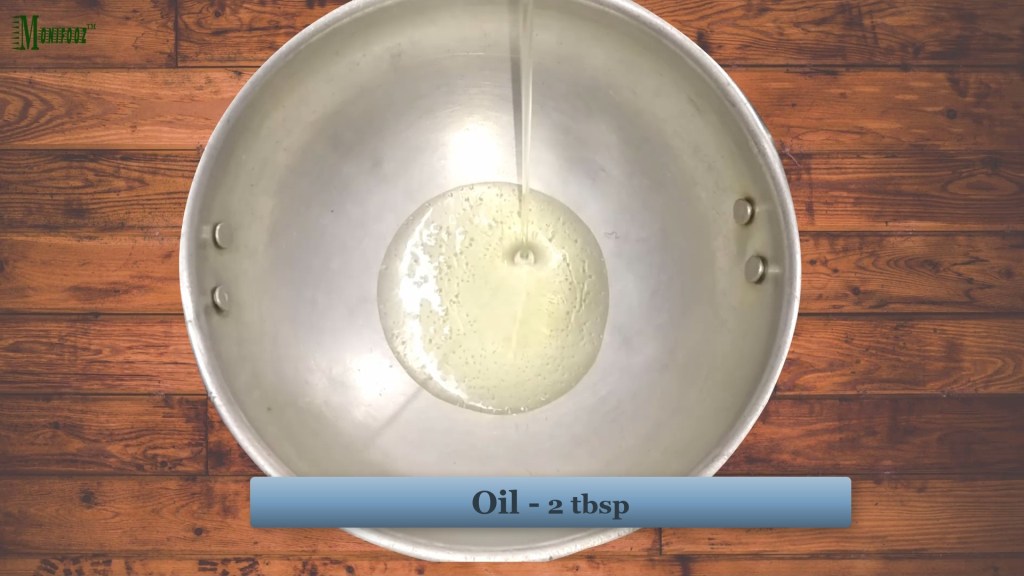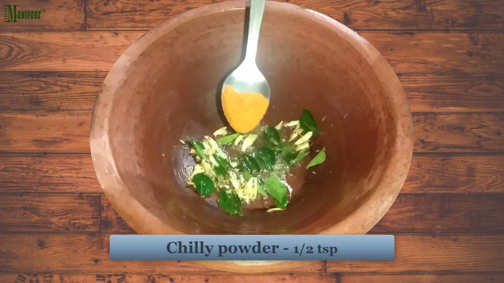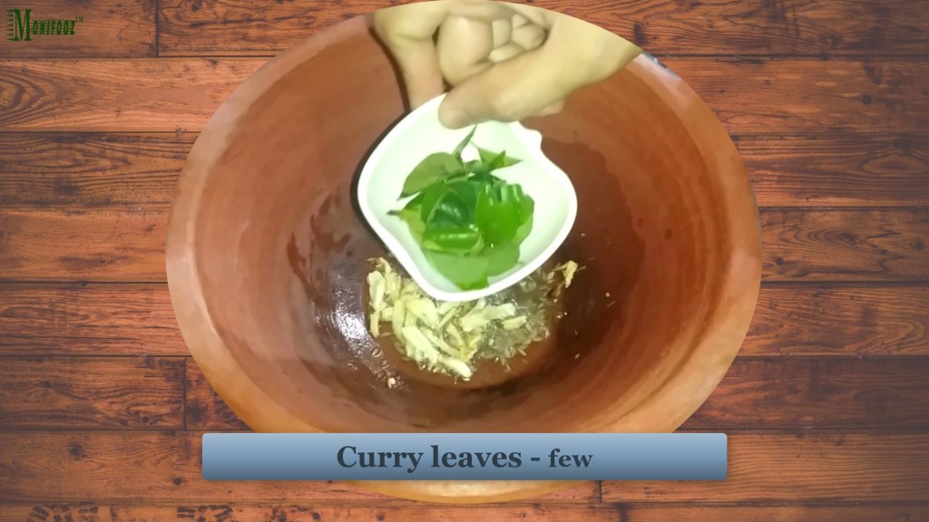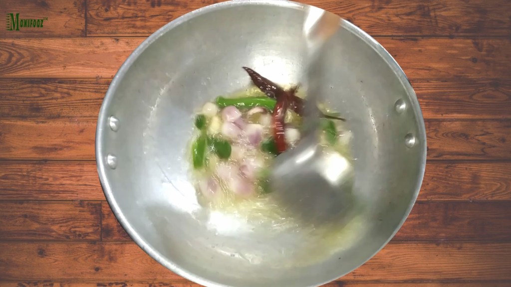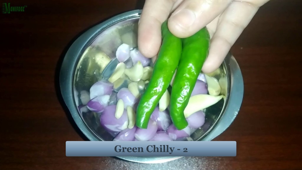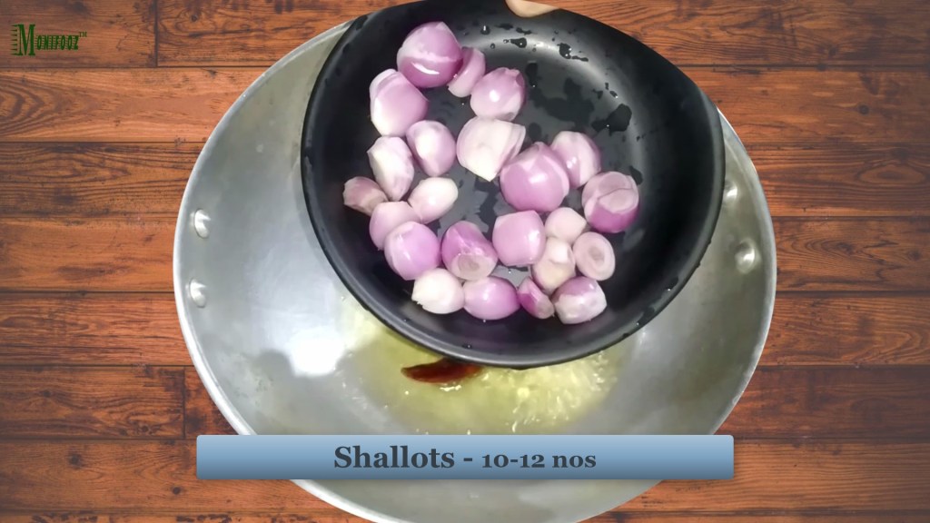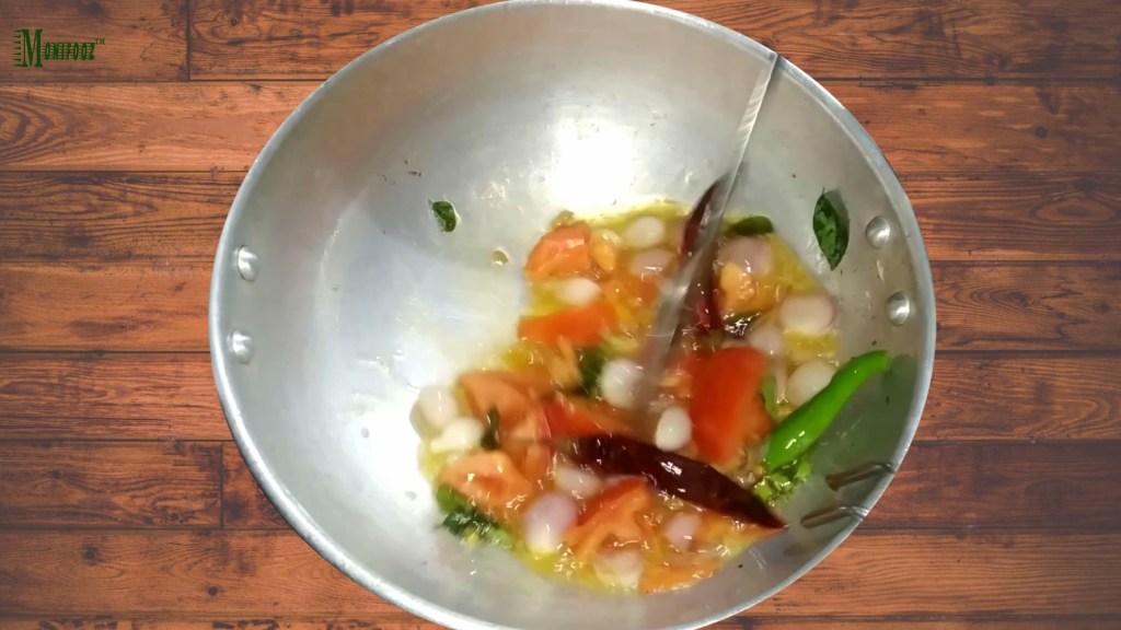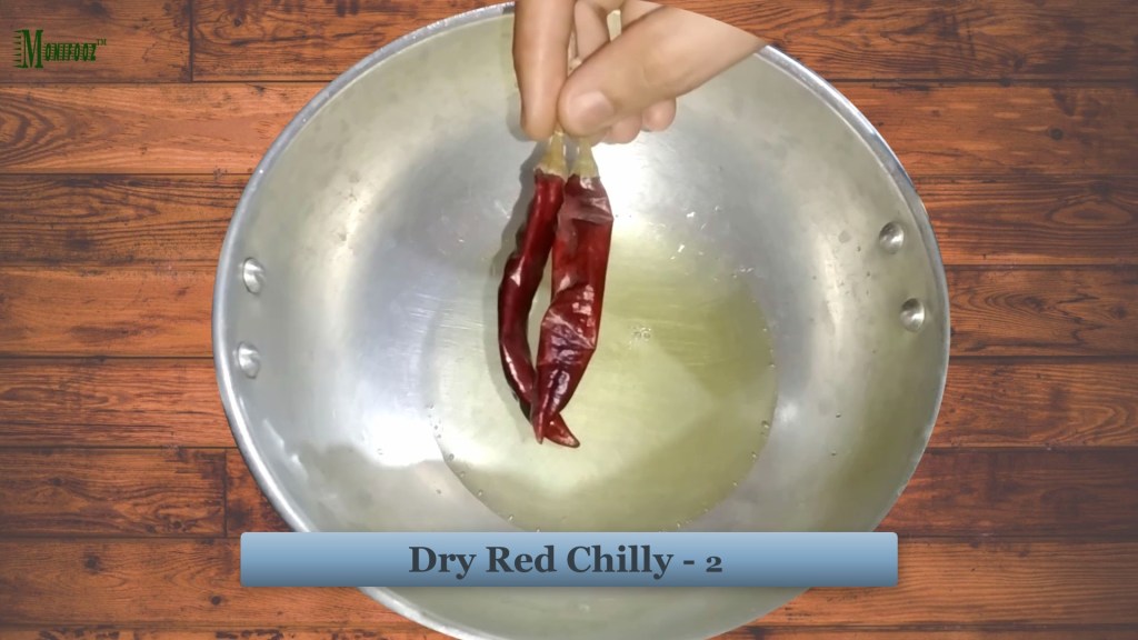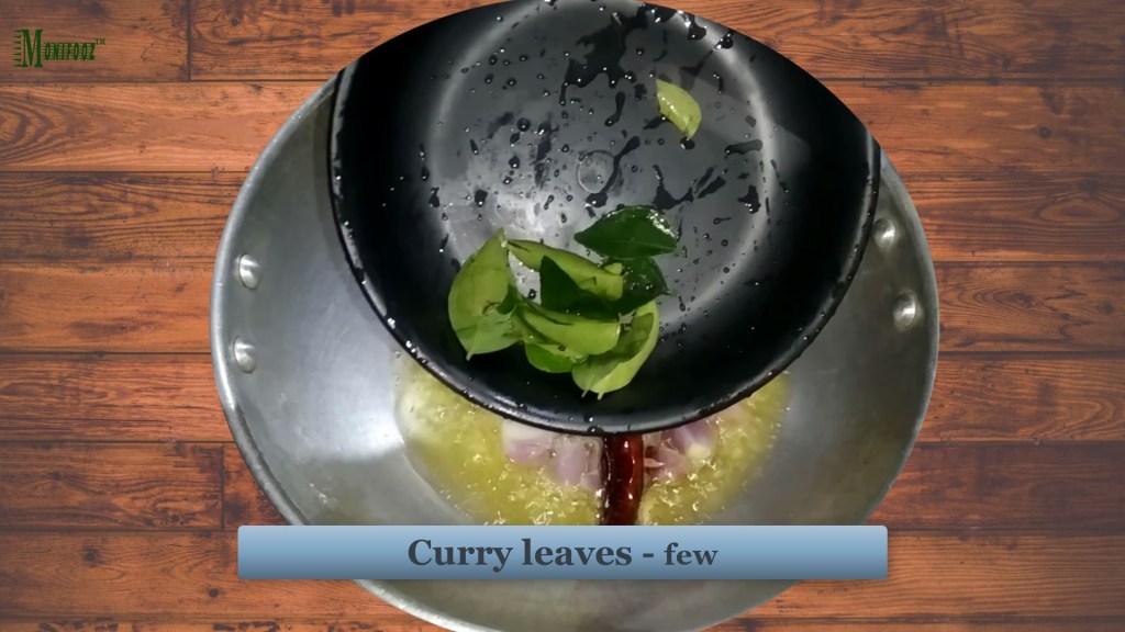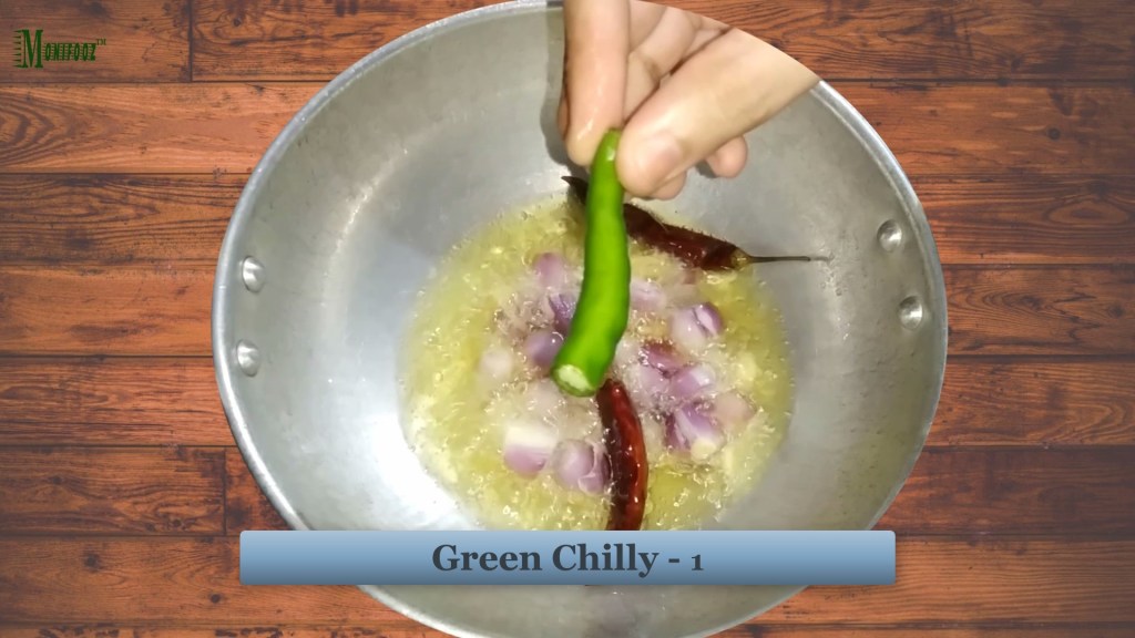 Take a vessel and pour 2 tbsp of oil. Keep the flame at medium heat. Add two dry chilly, eight small cloves of garlic, 10 to 12 pieces of shallots, one green chilly, a few curry leaves, and mix well.