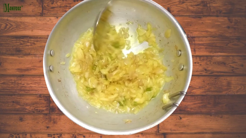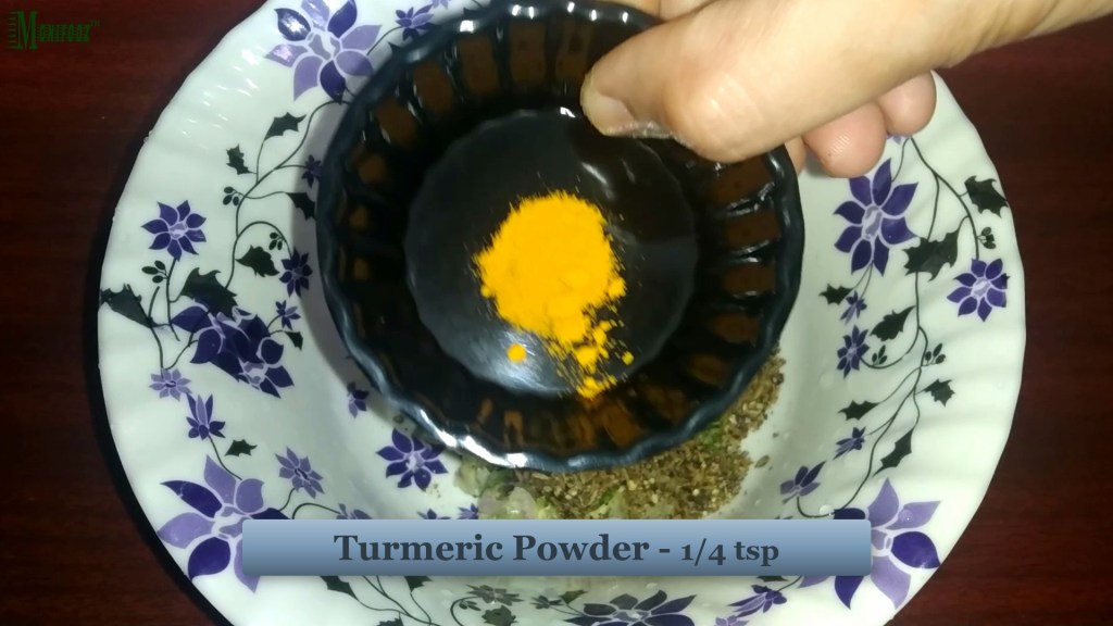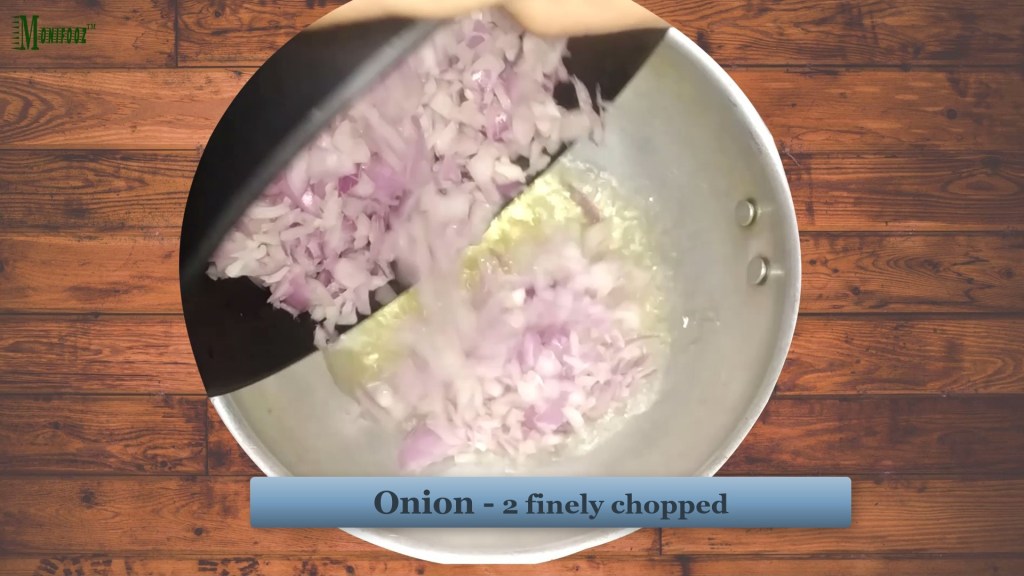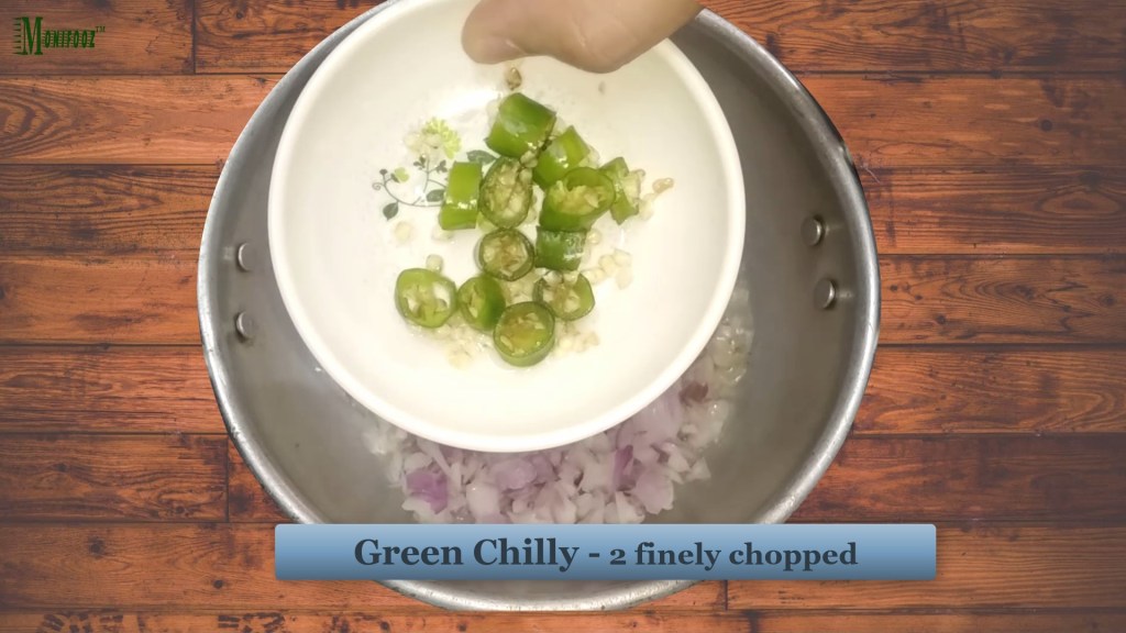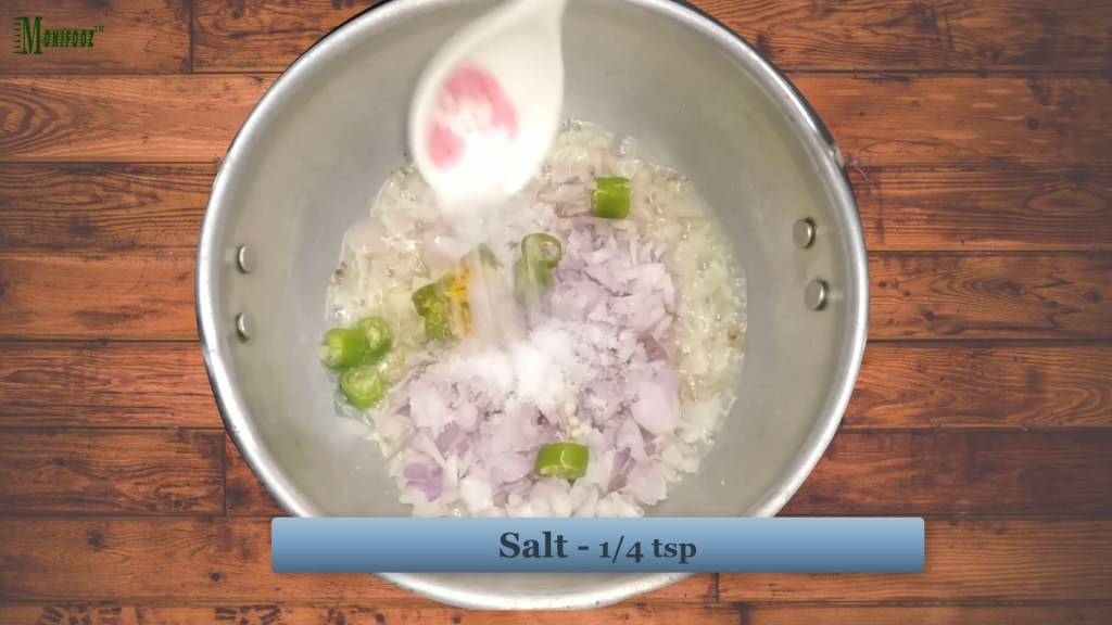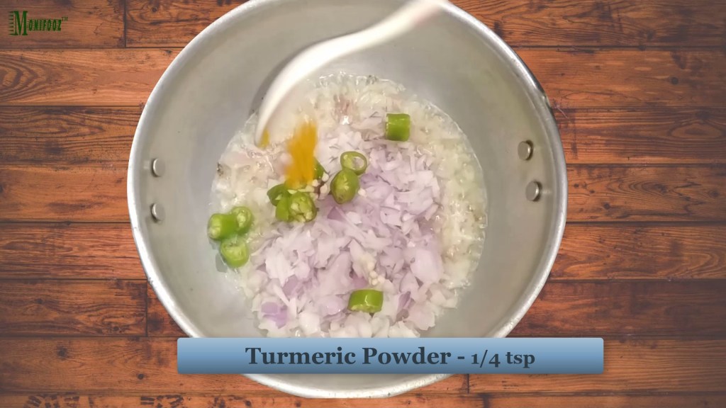 Take a pan with 2 tbsp of oil. Add two finely chopped onions, two finely chopped green chilly, 1/4 tsp of turmeric powder, 1/4 tsp of salt, and fry it with medium heat for 3-4 minutes till the raw smell goes out.