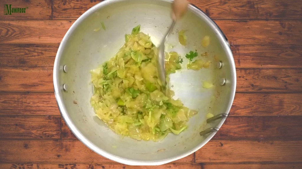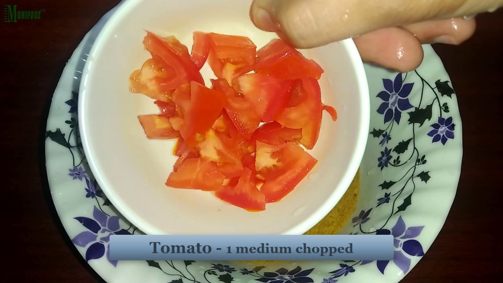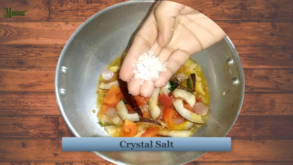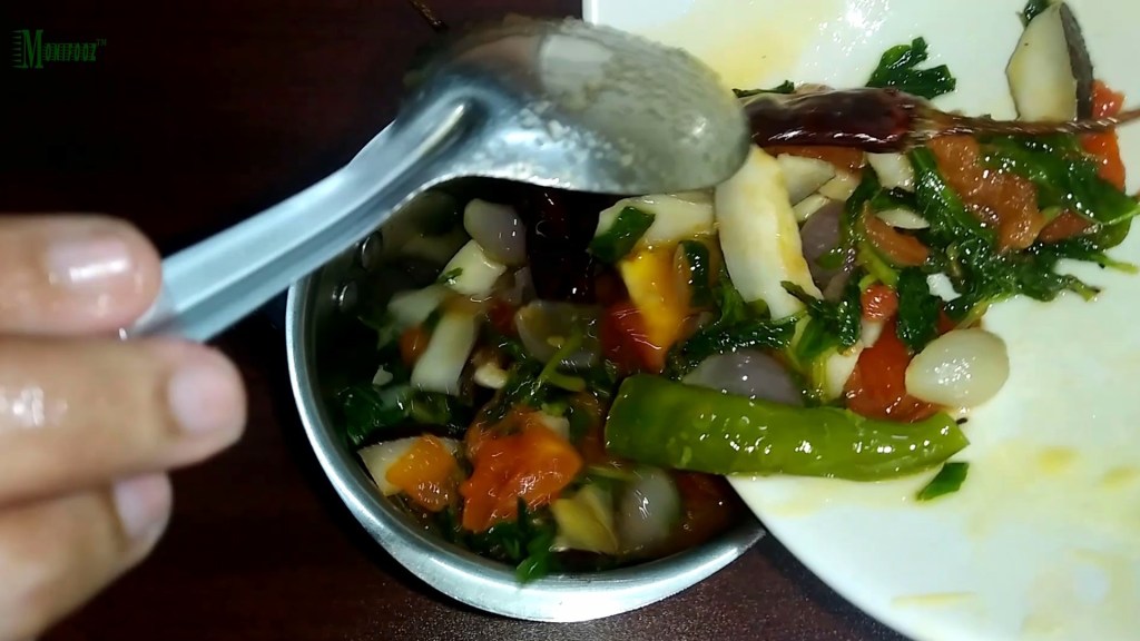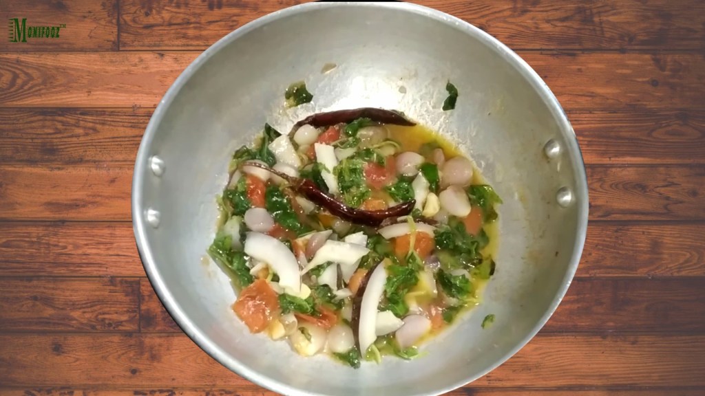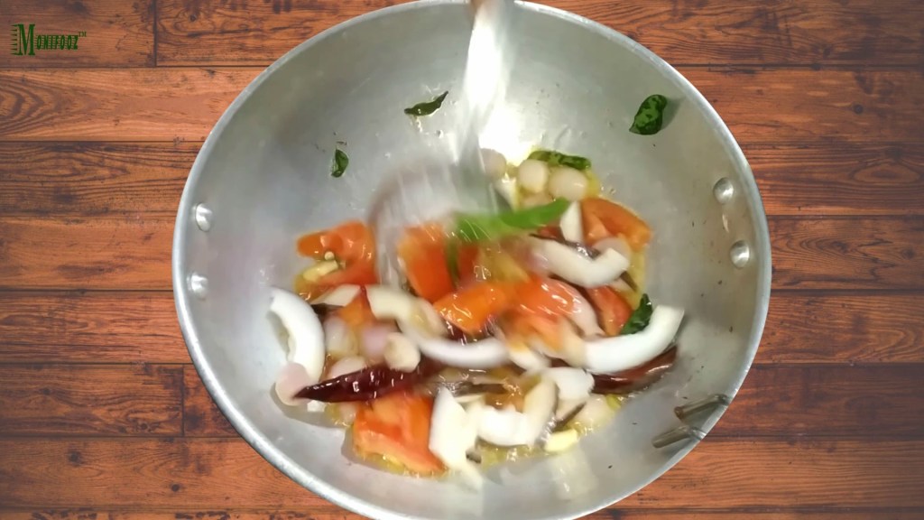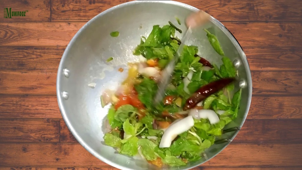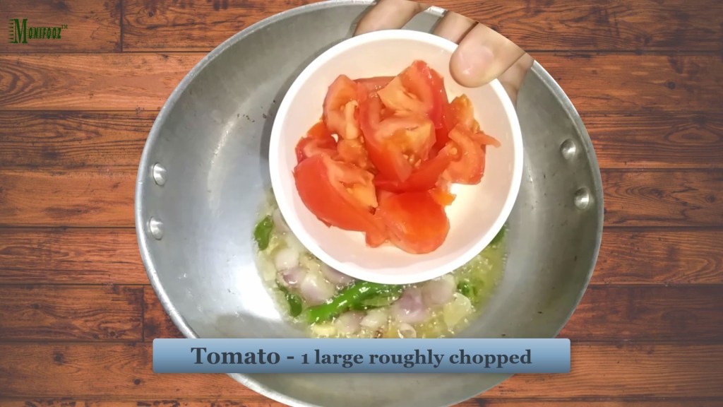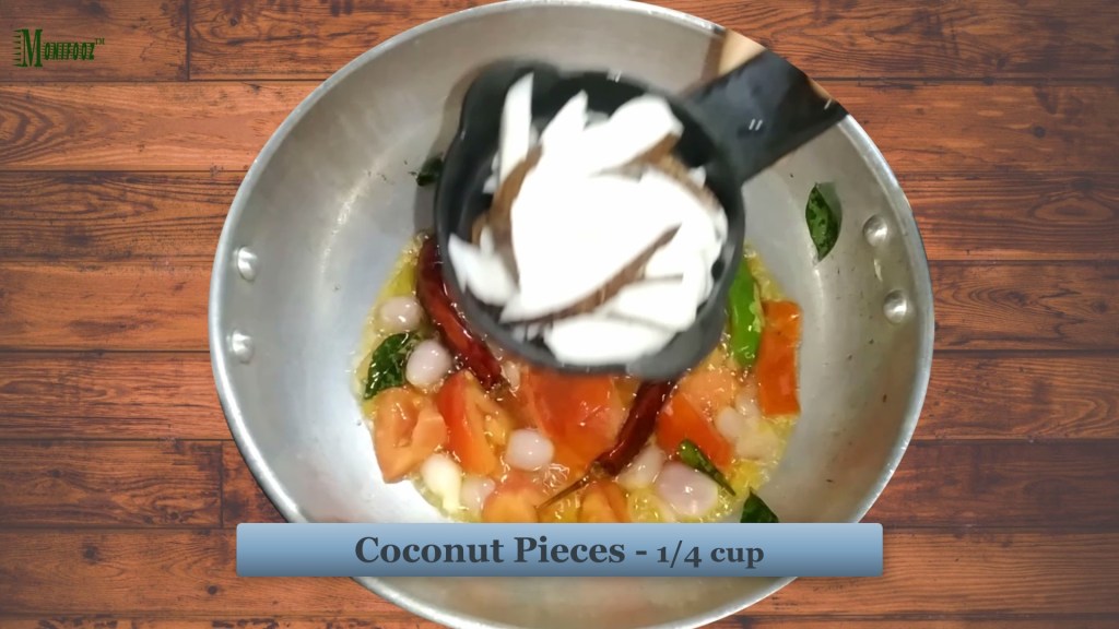 Put one large-sized roughly chopped tomato and saute for a minute. Add 1/4 cup of coconut pieces, and fry it for 2 to 3 minutes. Put crystal salt as preferred and mix it well.