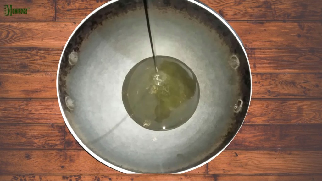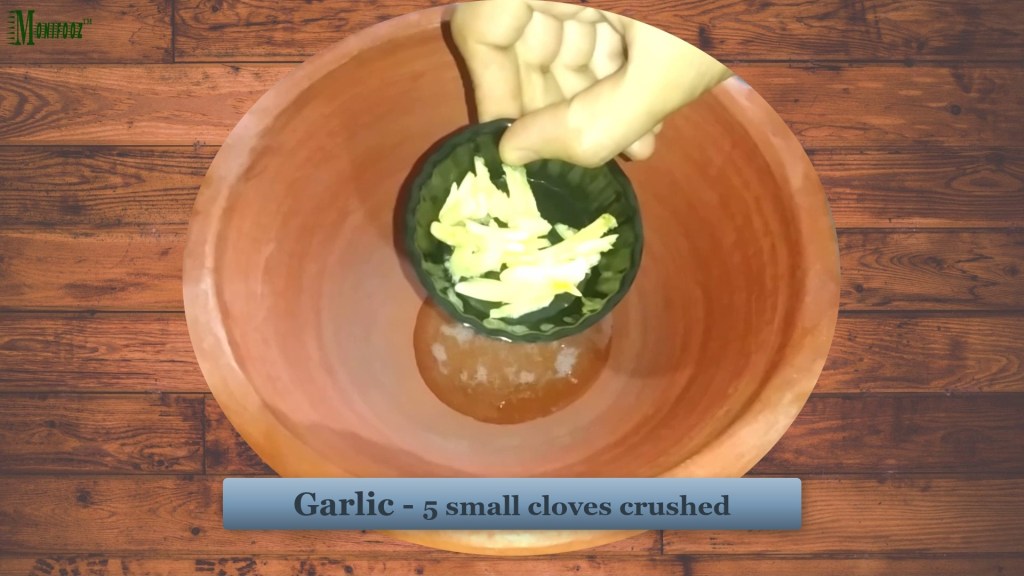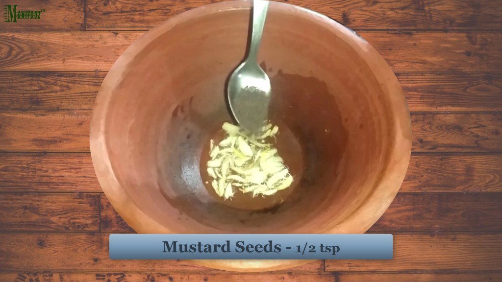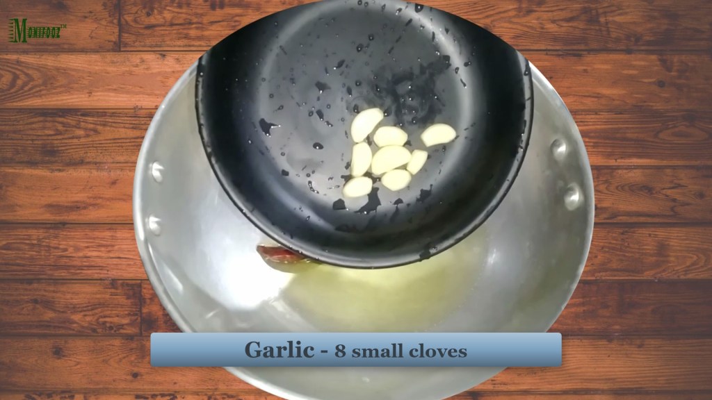 Roast the dry fish on direct flame, and then keep those fishes aside. You can dry roast it on a pan also. Use a clay pot to make this curry to get a traditional taste. Keep the flame at medium heat and pour 1 tbsp of oil. Add five small cloves of crushed garlic and fry for a minute till the raw smell disappears. Add 1/2 tsp of mustard seeds, 1/2 tsp of cumin seeds, and mix it.
