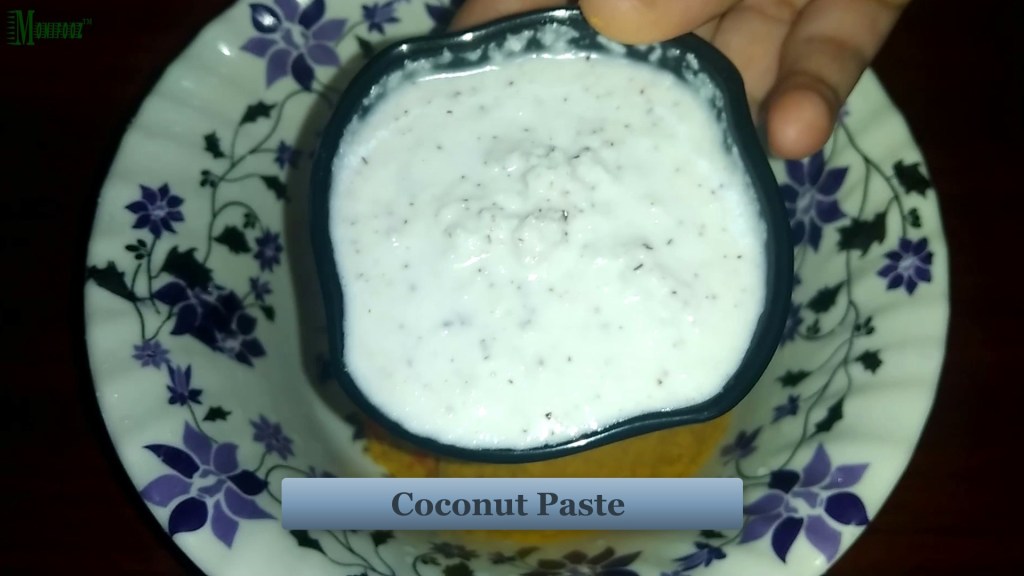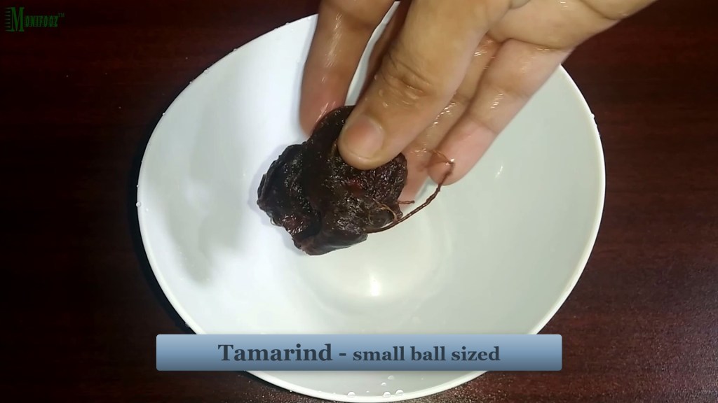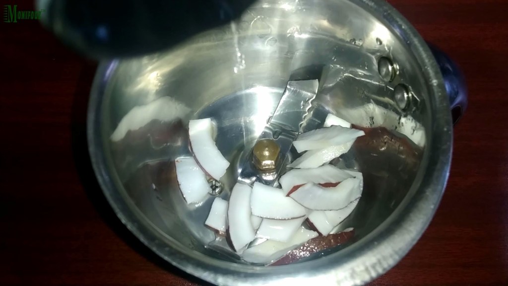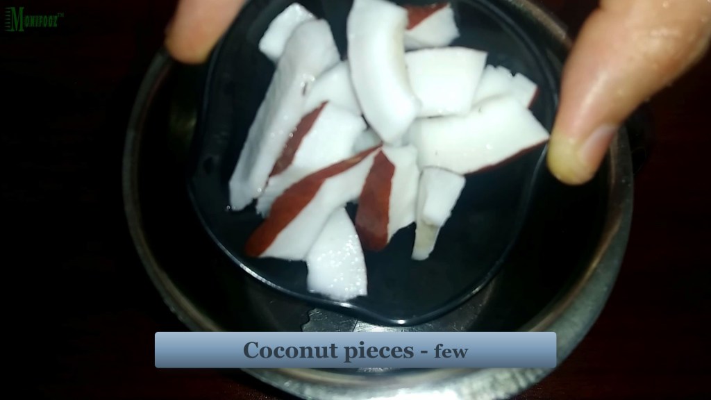 Take few coconut pieces with little water in a mixie jar, and grind them to get a smooth paste. Get small ball-sized tamarind, and add enough water to squeeze the extract.