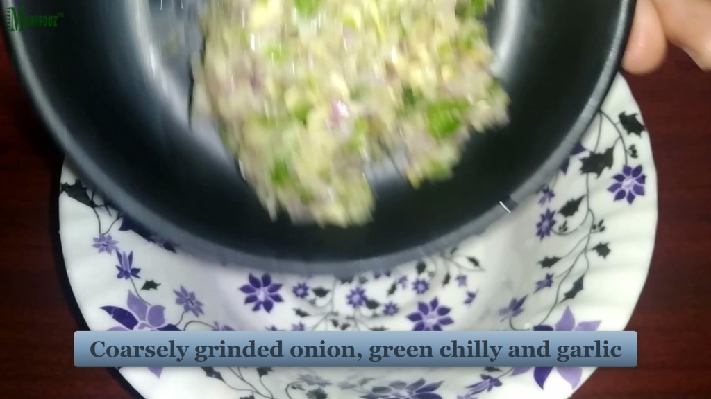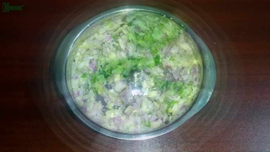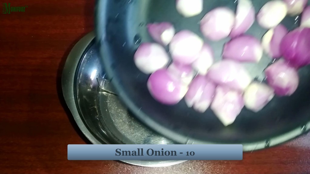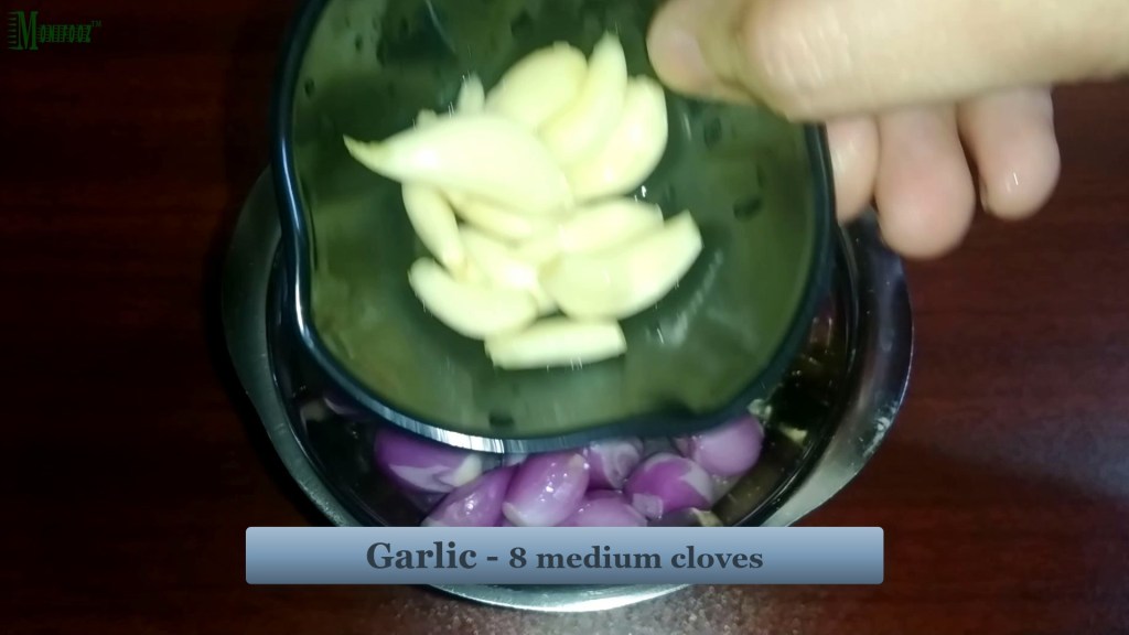 Take ten small onions, eight medium cloves of garlic, two green chilly in a mixie jar again, and grind them too coarsely. Keep this stuff aside.