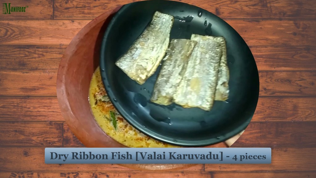 Add some curry leaves and mix it well. Fry it for 20 seconds after adding 1/2 tsp of chilly powder. Pour the dissolved mixture and put four pieces of dry ribbonfish. You wash it slightly after direct roasting those fish pieces. You can use any dry fish for this curry.