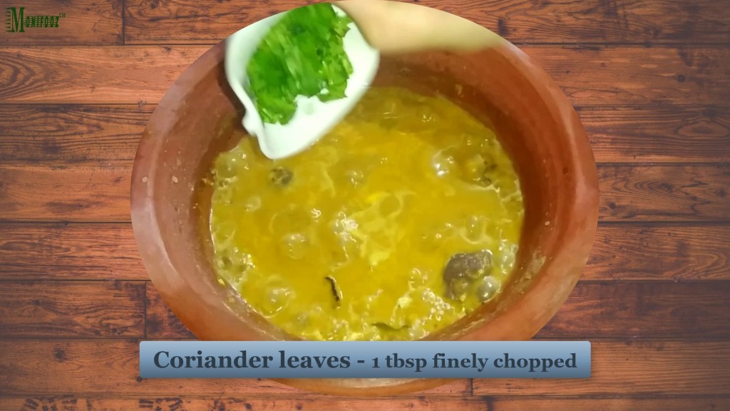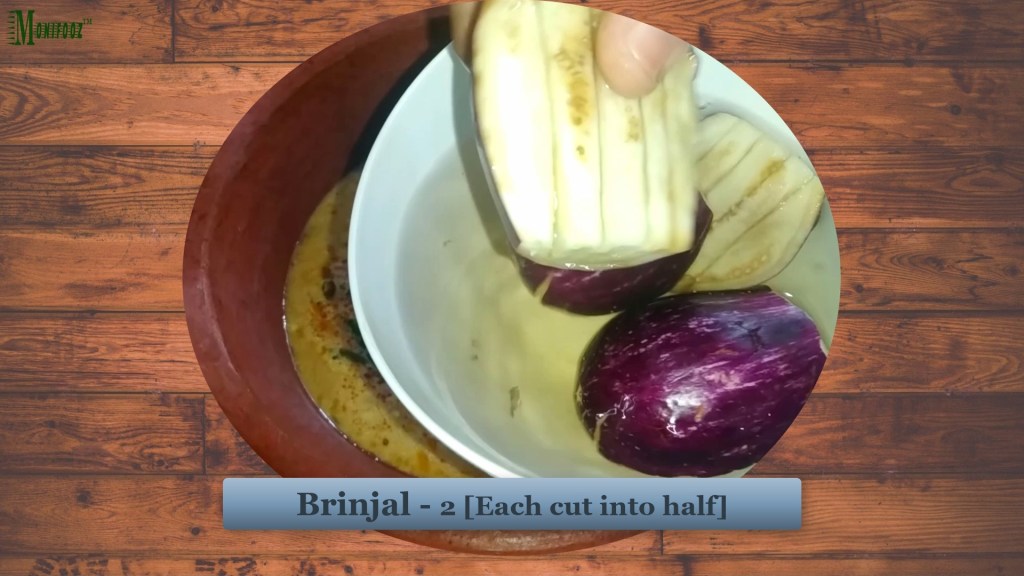 Take two brinjals, each cut into half in the clay pot. Cook it for 15 minutes with medium heat with a covered lid. Later add 1 tbsp of finely chopped coriander leaves and mix well. Now, turn off the flame as the dry fish curry is ready to serve! Enjoy it with plain rice.