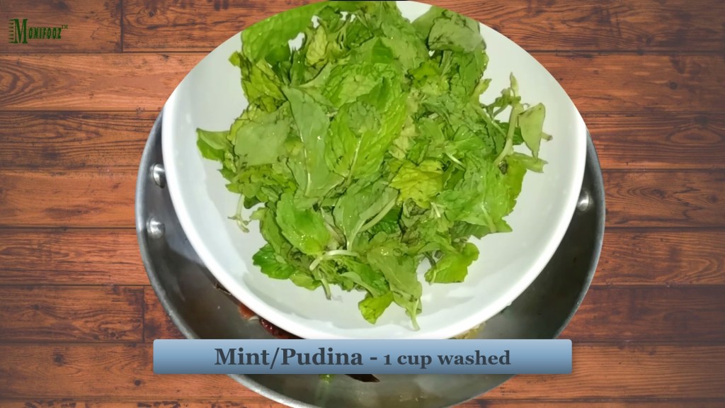 Add 1 cup of washed mint/pudina, and cook for 2 to 3 minutes. Turn off the flame and keep the stuff aside till it cools down.