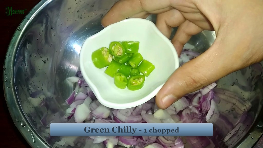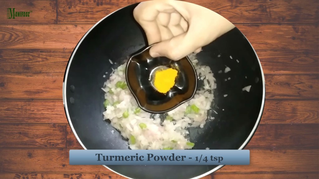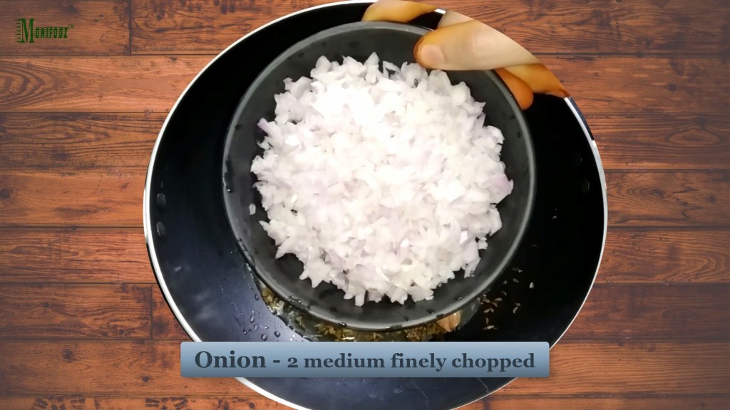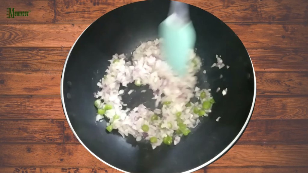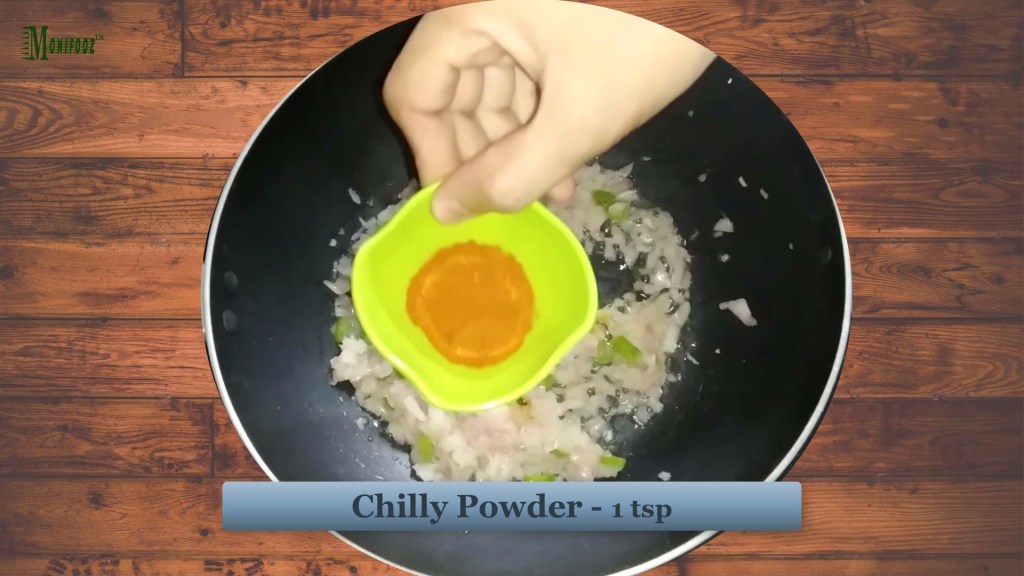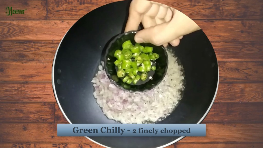 Get a pan and keep the flame at medium heat. Pour 1 tbsp of oil. Add two medium-sized finely chopped onions, two finely chopped green chilly, and fry it for 2 to 3 minutes.