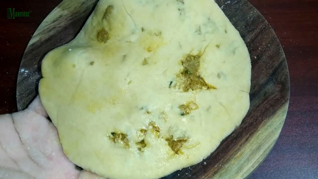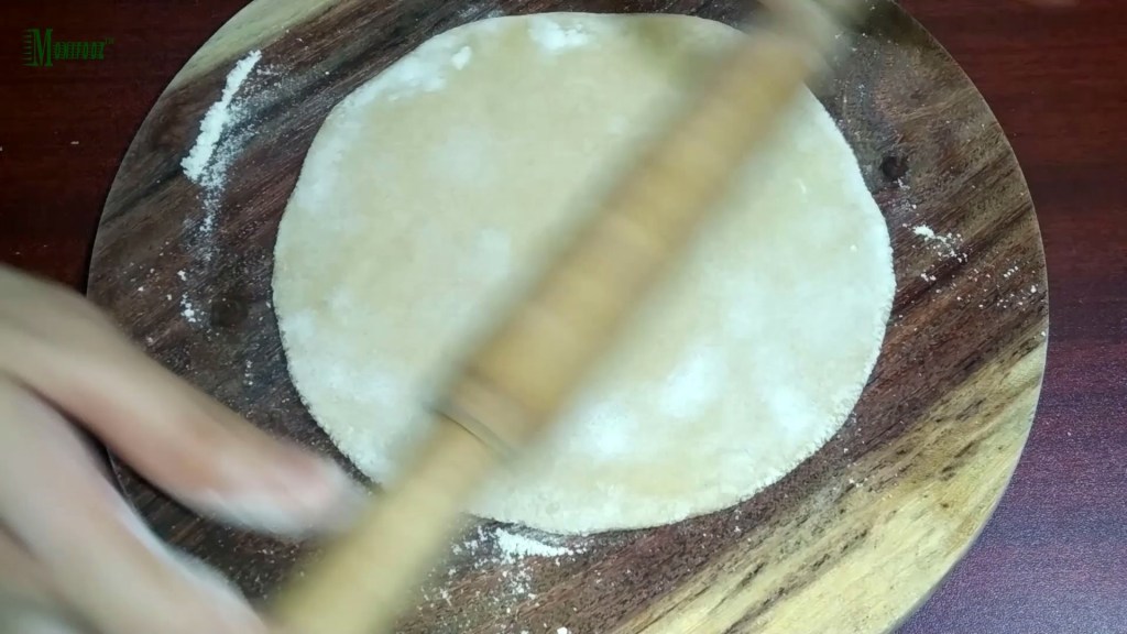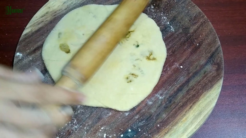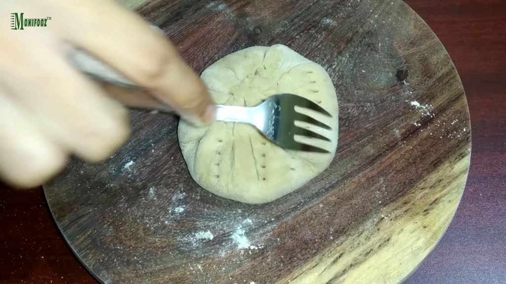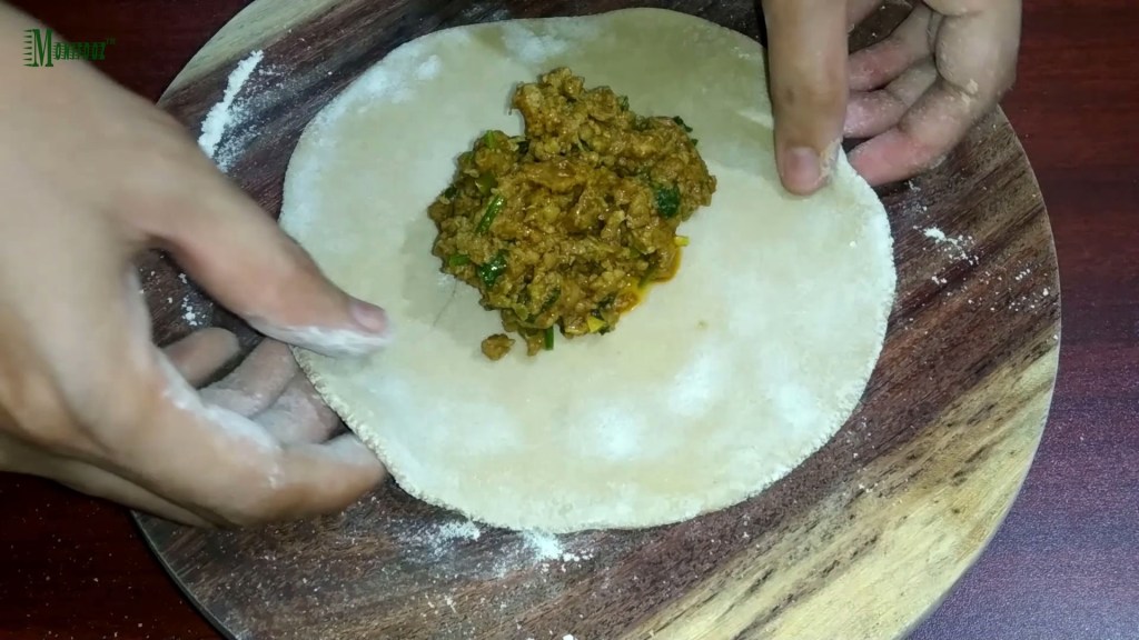 Take a sizeable ball-sized dough and flatten it like this, as shown in the video. Dust the flattened ball with some flour and roll it as a thick sheet. Place 1 tbsp of keema mixture in the center and seal the edges to make a keema stuffing. Remove the excess dough, if any, during filling. Prick with a fork to avoid air that helps you rolling it gently. Now, it is ready for frying in the next step.