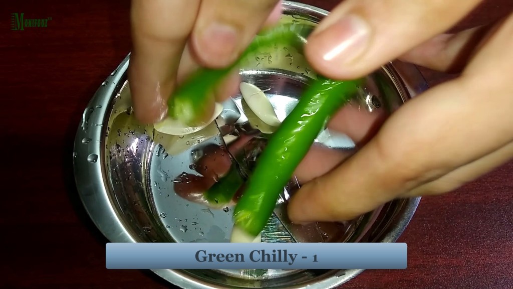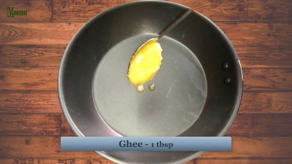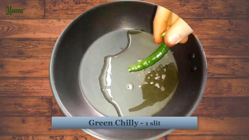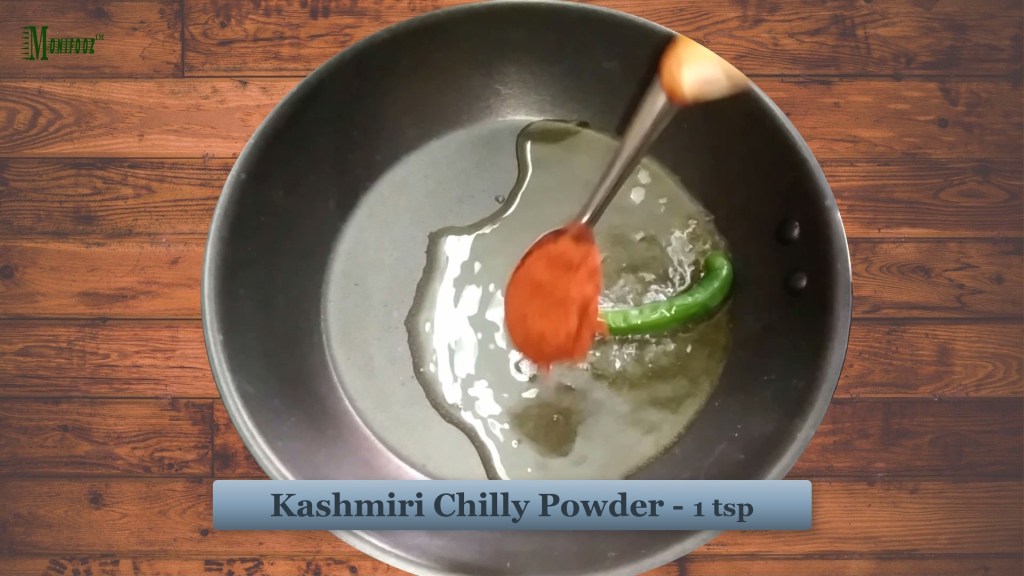 Get another pan and add 1 tbsp of ghee. Keep the flame with medium heat. Add one green chilly with slit, 1 tsp of Kashmiri chilly powder, 1/2 tsp of garam masala, and fry it for 30 seconds.