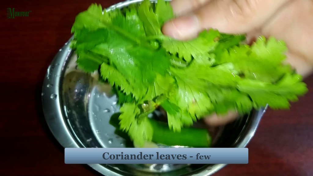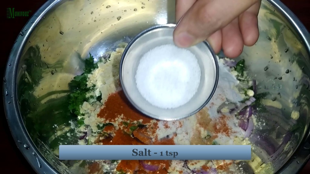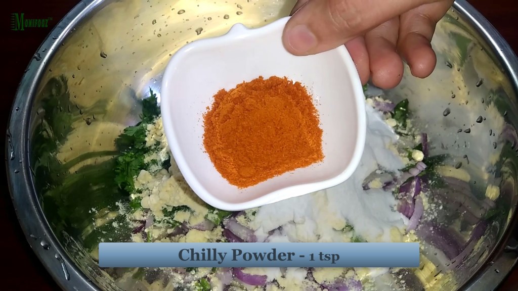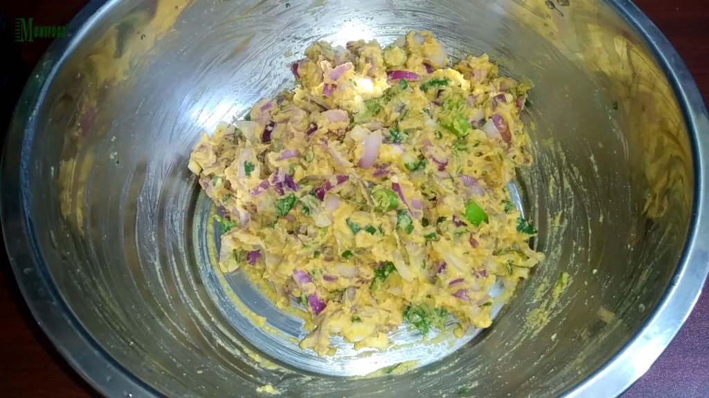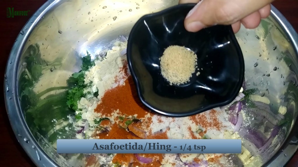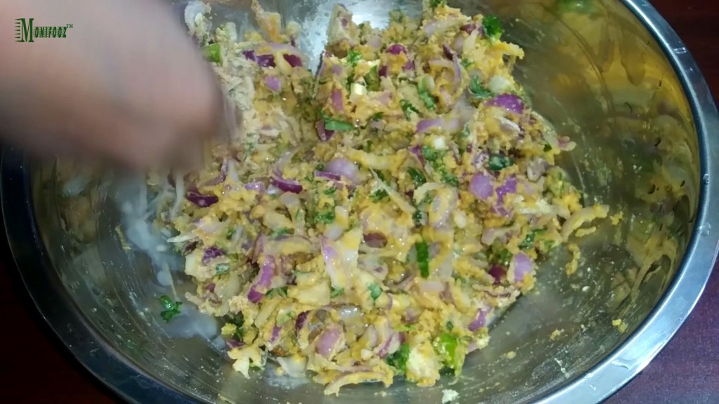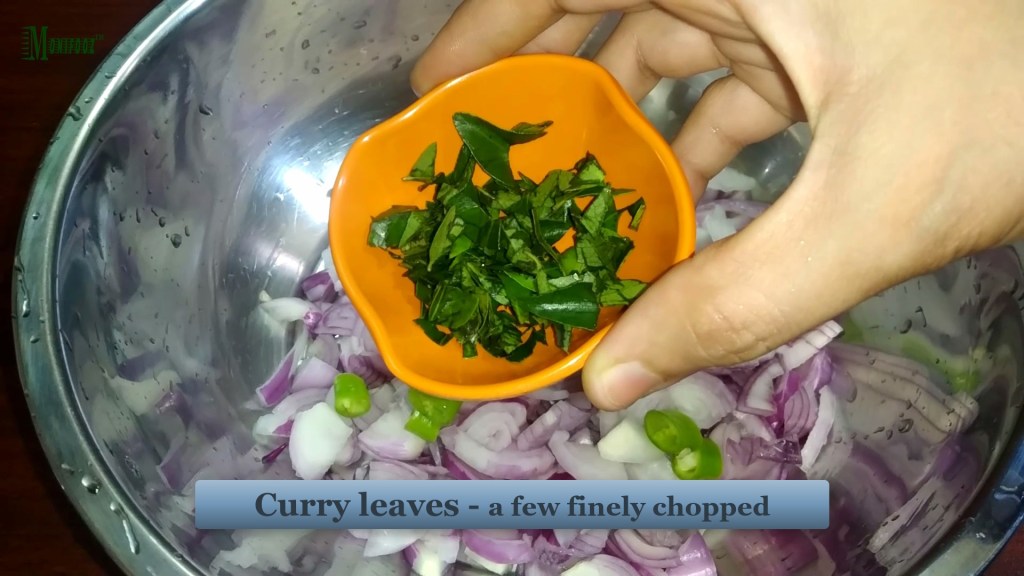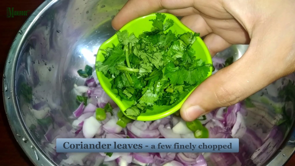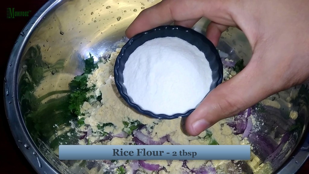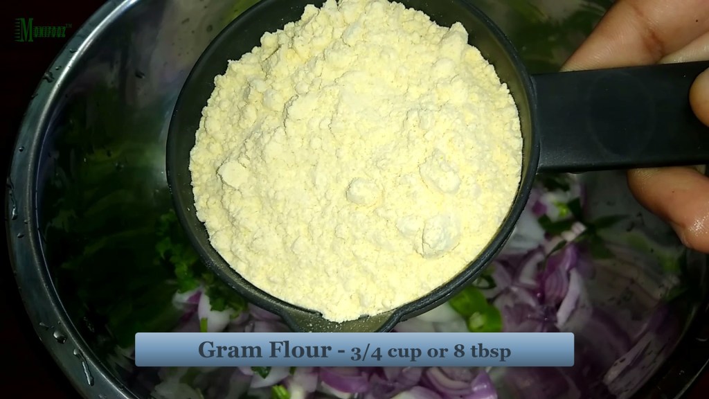 Take a vessel and add eight medium-sized roughly chopped onions. Add one chopped green chilly, a few finely chopped coriander leaves, a few finely chopped curry leaves, and 1/4 cup or 8 tbsp of gram flour.