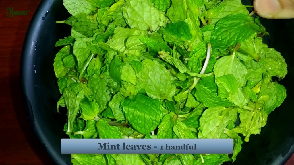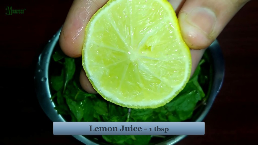 Take a mixie jar, add three cloves of garlic. one green chilly, a few coriander leaves, and one handful of mint leaves. Squeeze the 1 tbsp equivalent extract of lemon juice into it. Grind it to make a paste and keep this stuff aside.