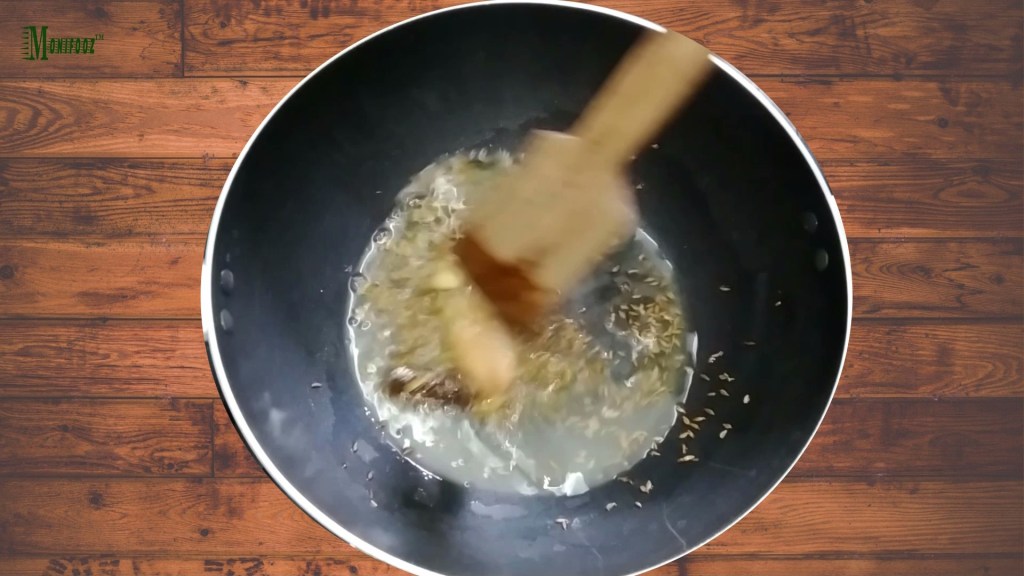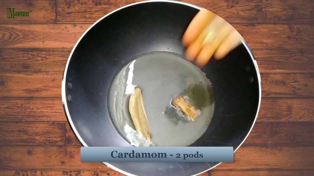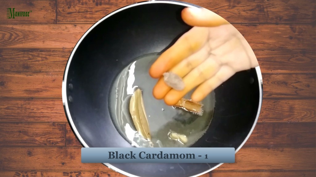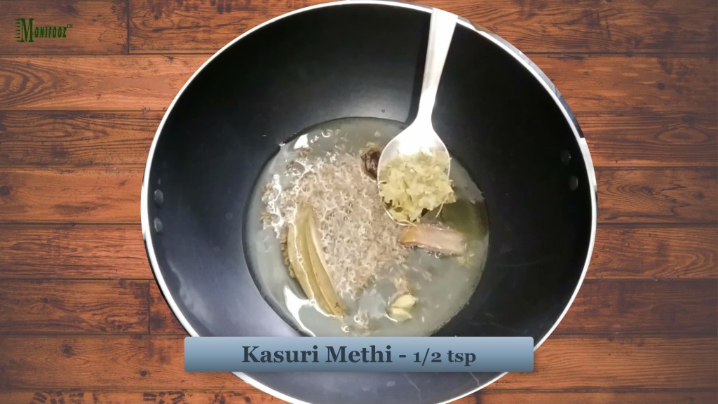 Take a pan and pour 2 tbsp of oil into it. Keep the flame at medium heat. Add one bay leaf, one cinnamon, two pods of cardamom, one black cardamom, 1 tsp of cumin/jeera, 1/2 tsp of Kasuri methi, and saute well.