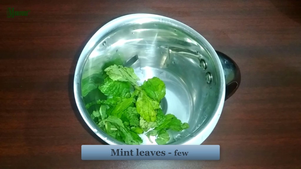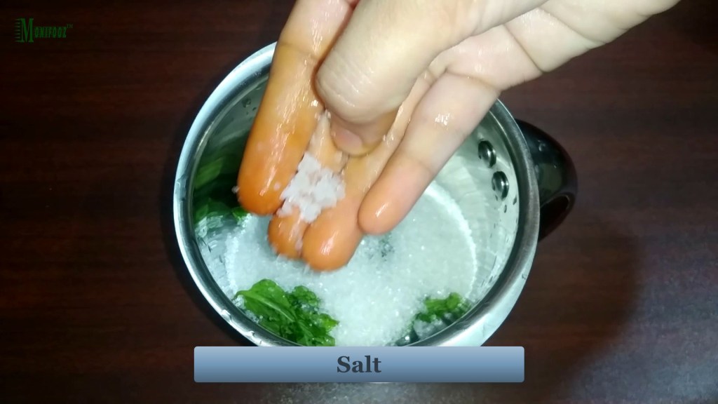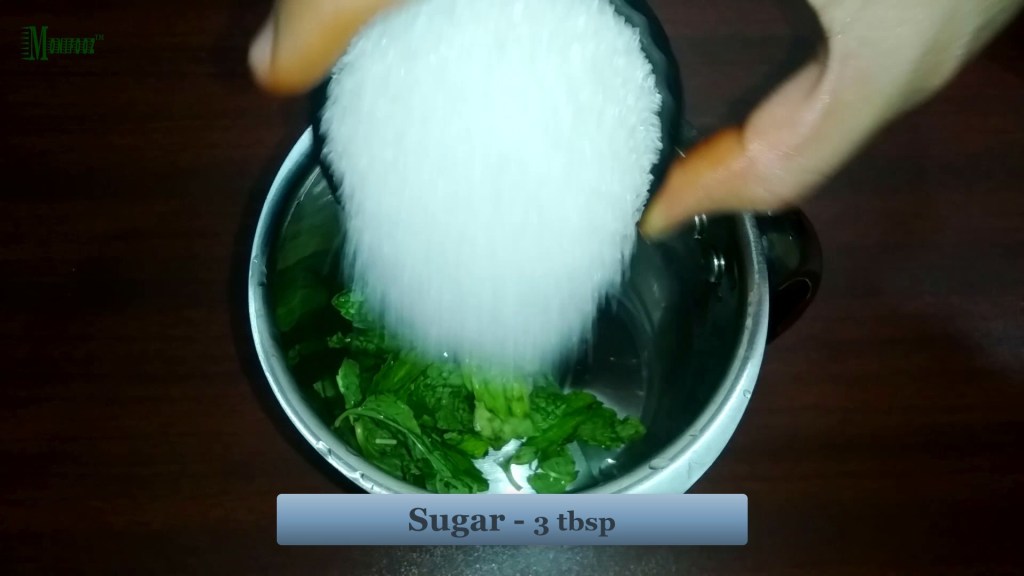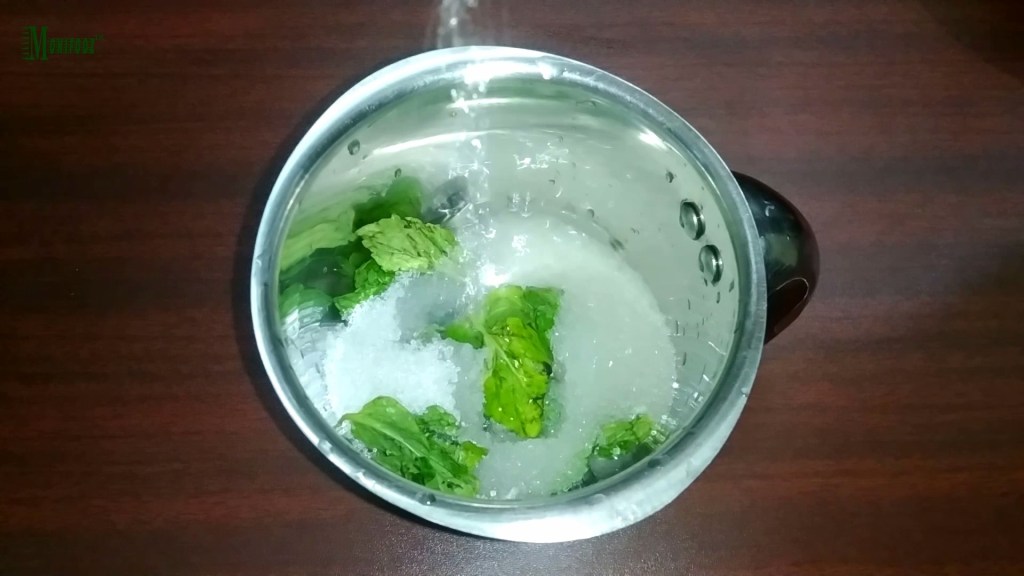 Take a mixie jar, add some mint leaves, 3 tbsp of sugar, and required salt. Grind it with little water.