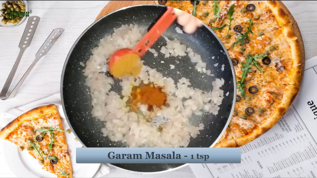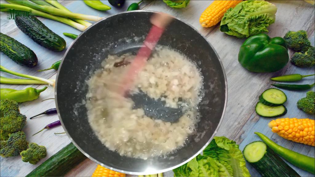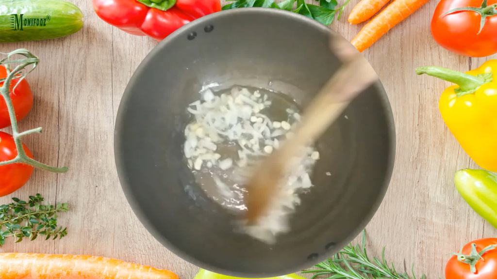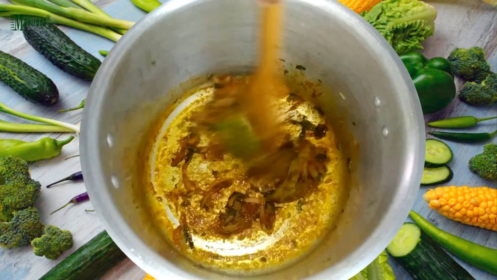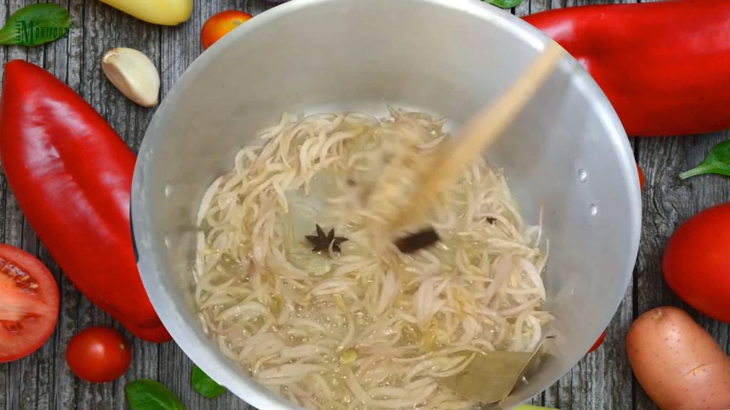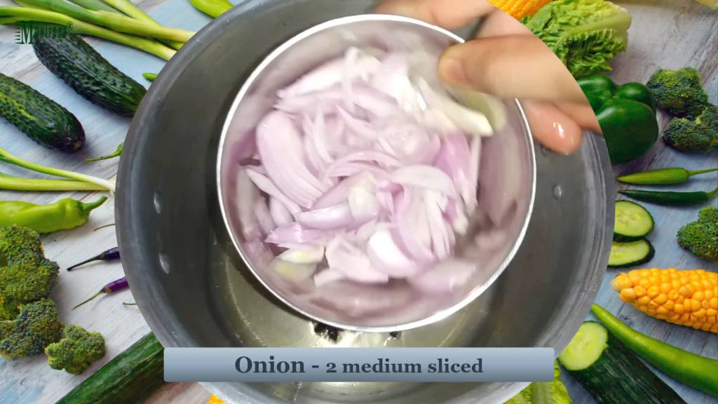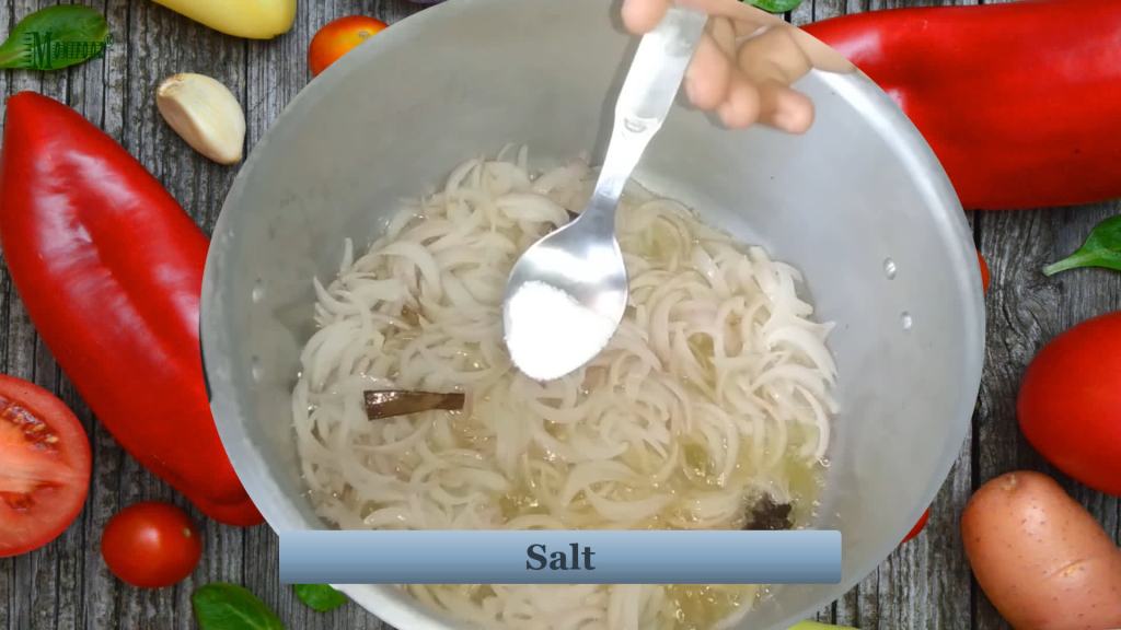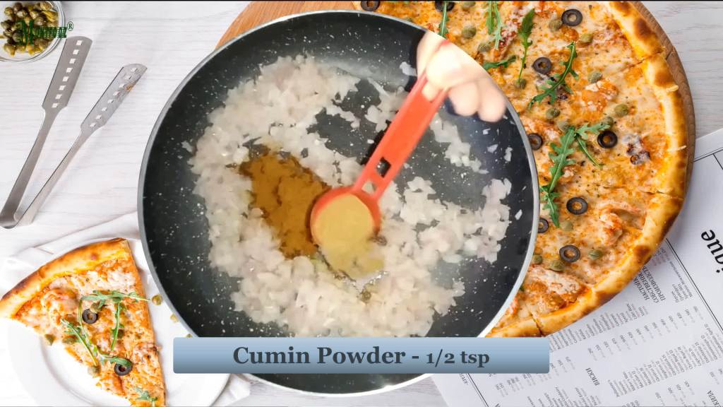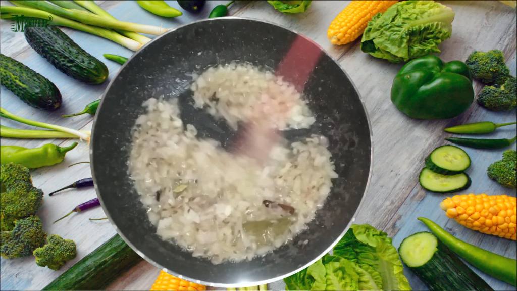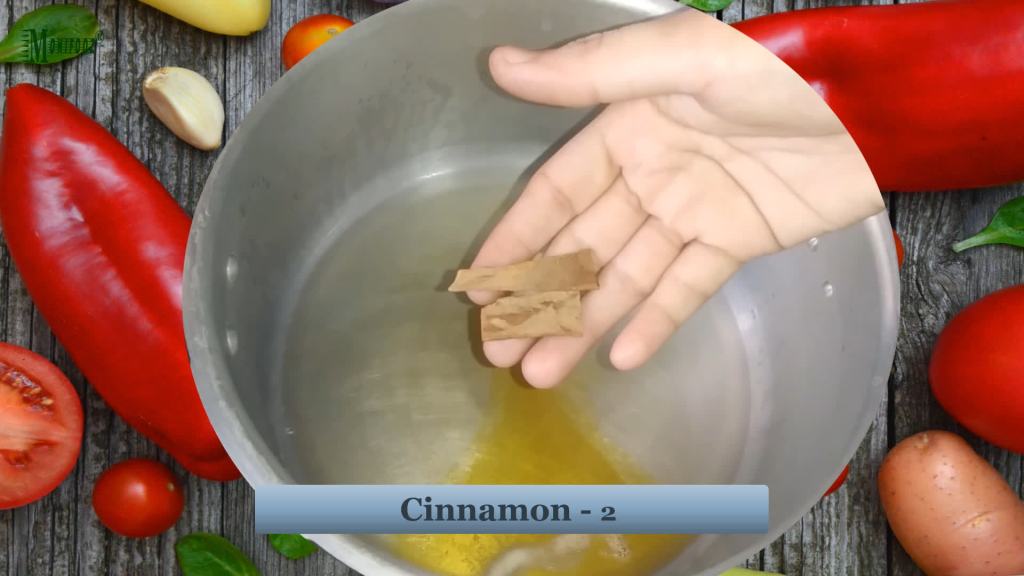Add one cinnamon, 1/2 tsp of cumin seeds, and fry till it turns aromatic. Add two finely chopped onions and saute it for 2-3 minutes.