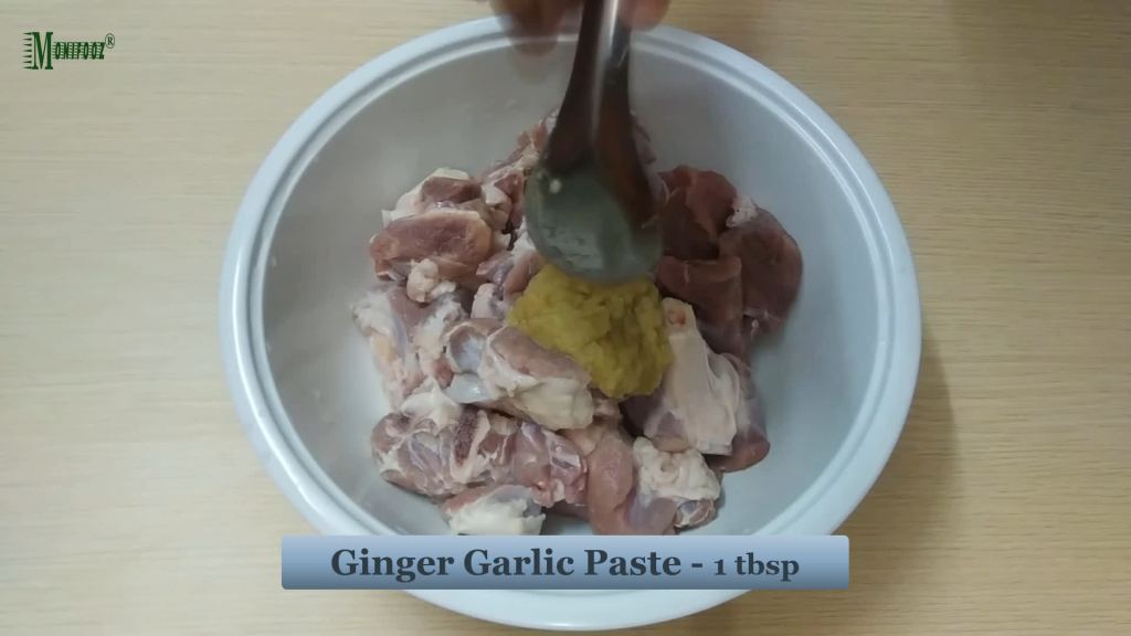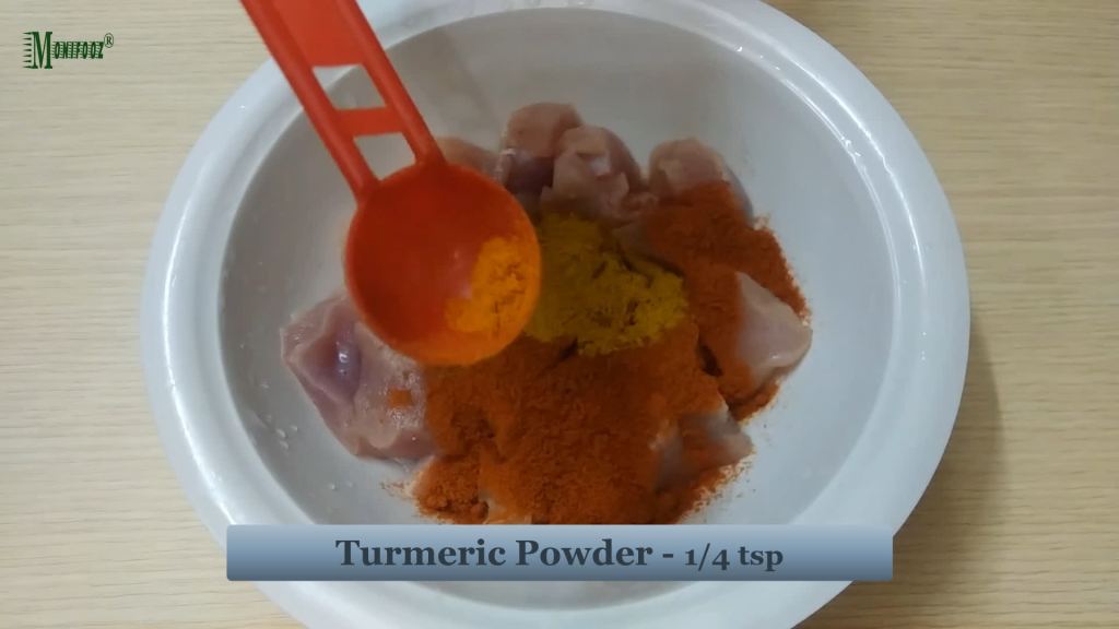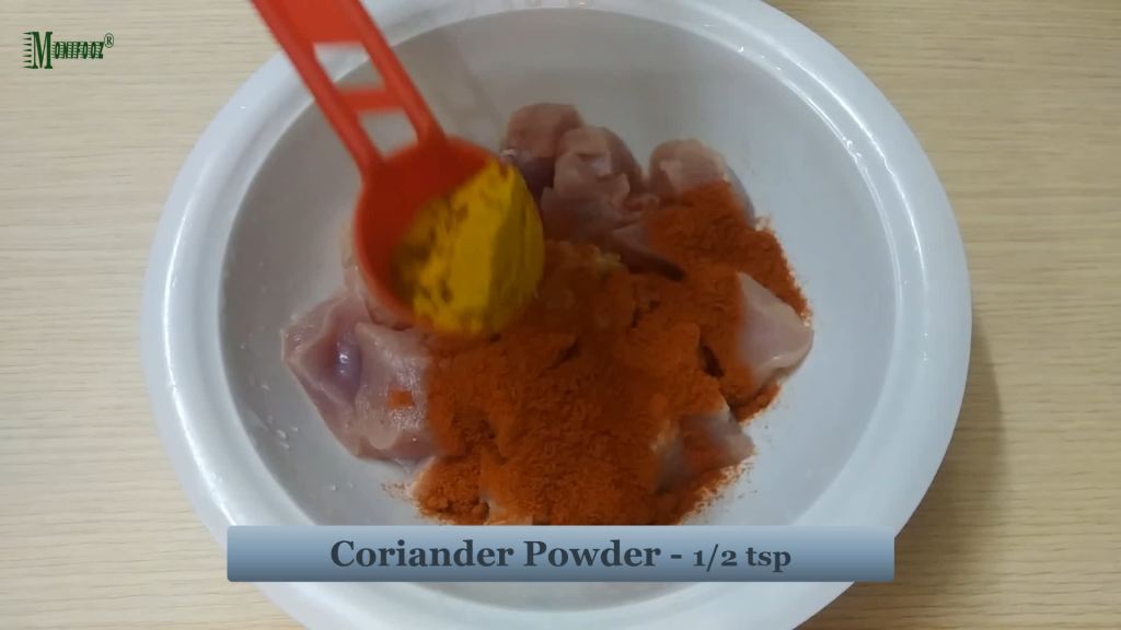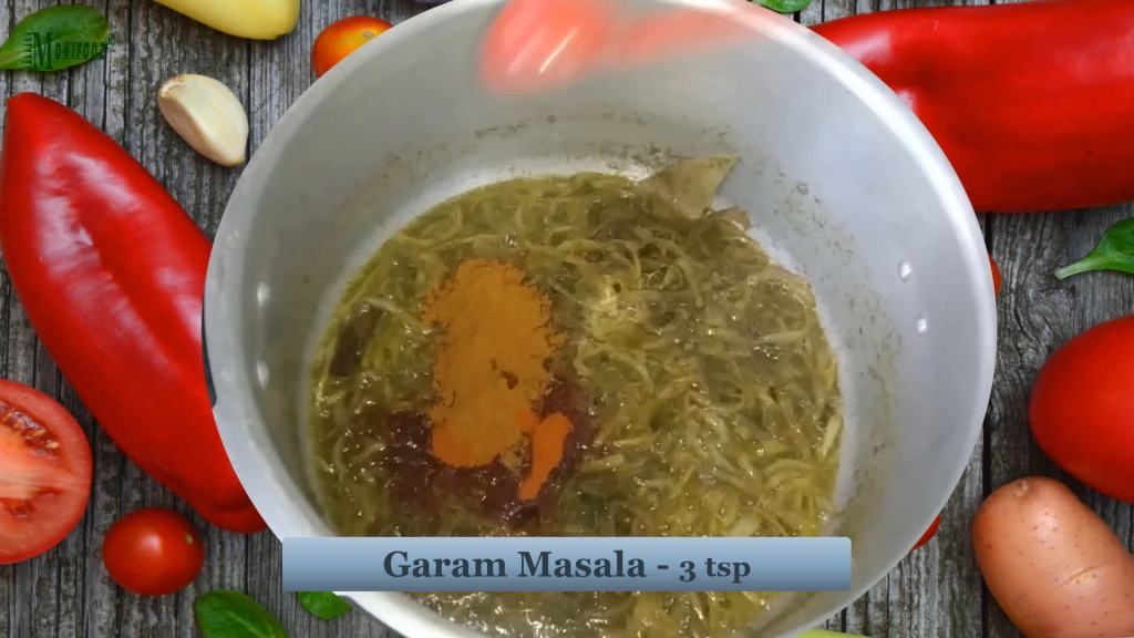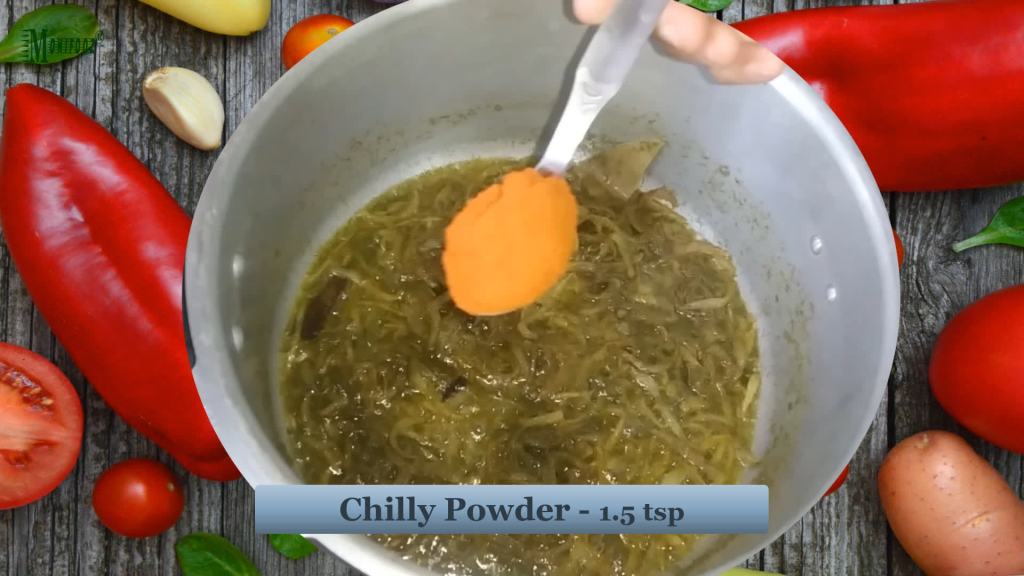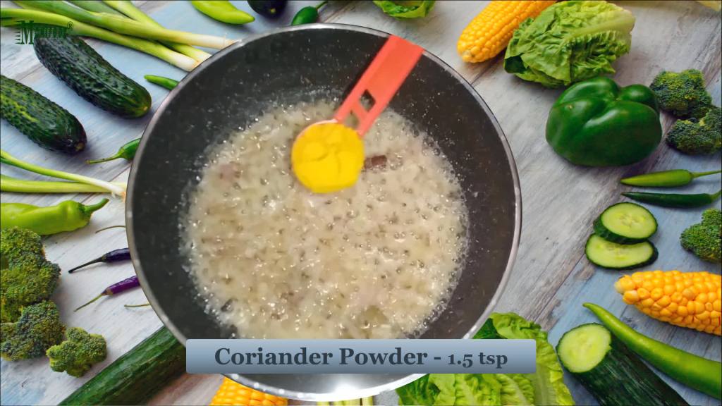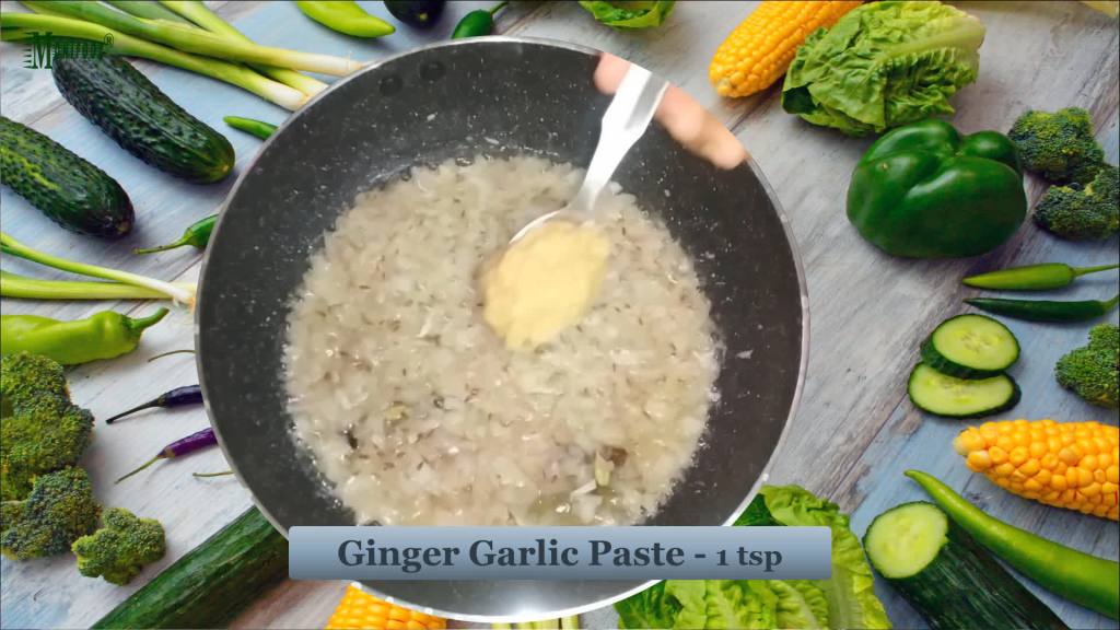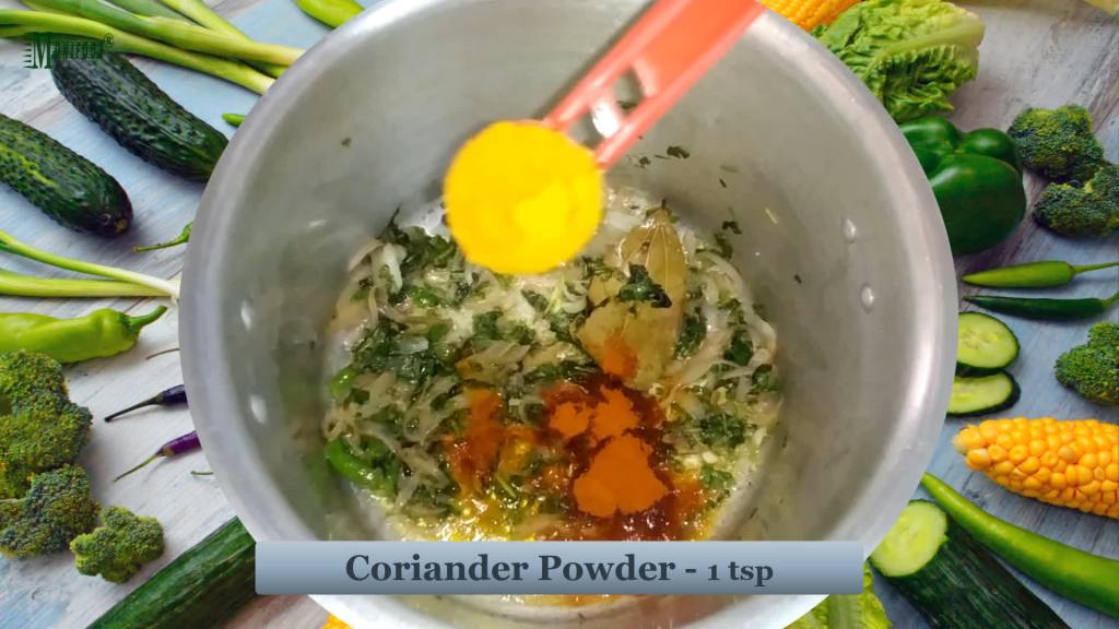Add 1 tsp of ginger garlic paste, and fry it till the raw smell disappears. Put 1.5 tsp of coriander powder, 1/4 tsp of turmeric powder, and 1/2 tsp of chilly powder.