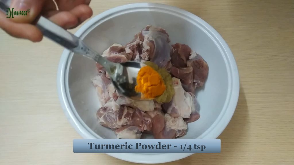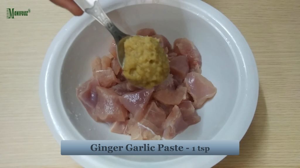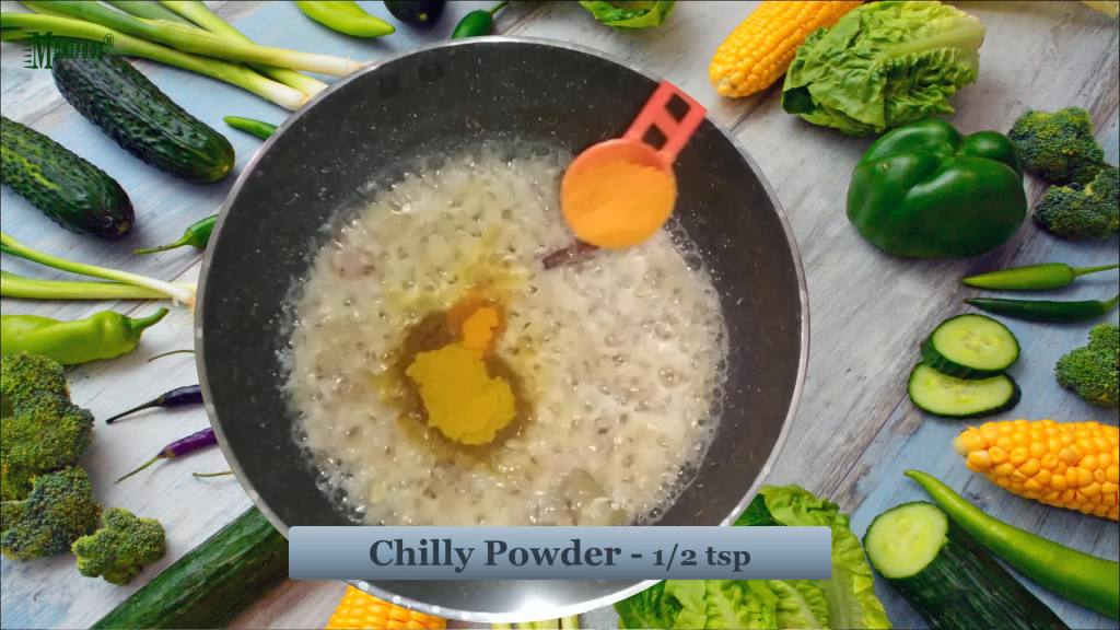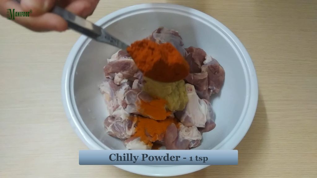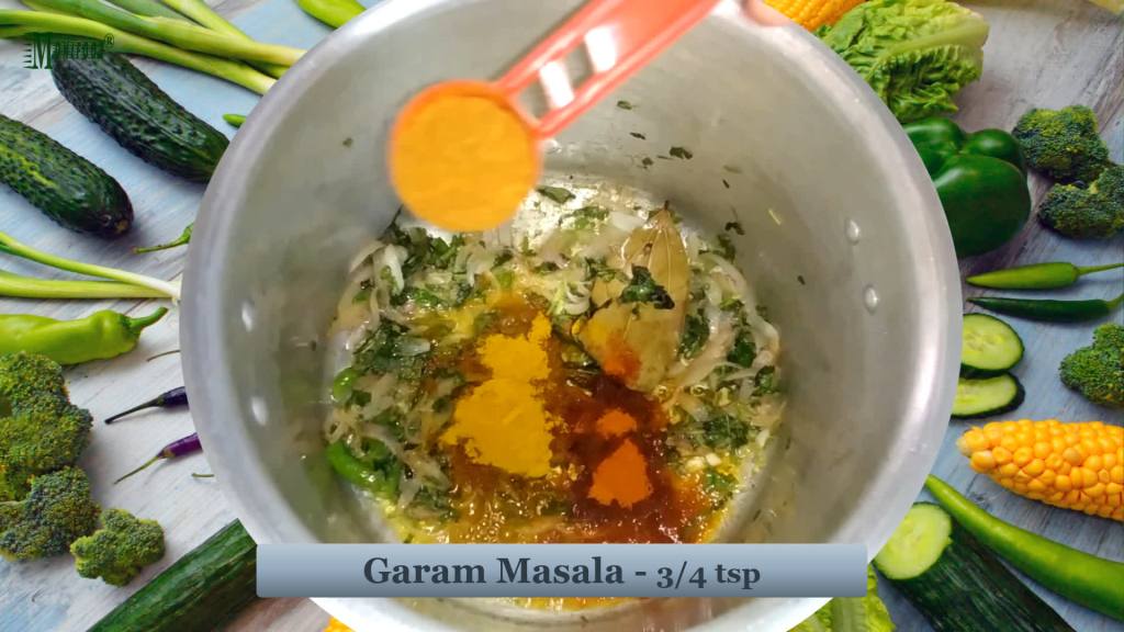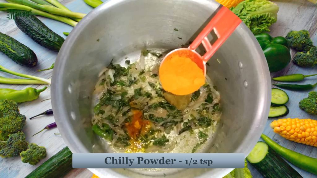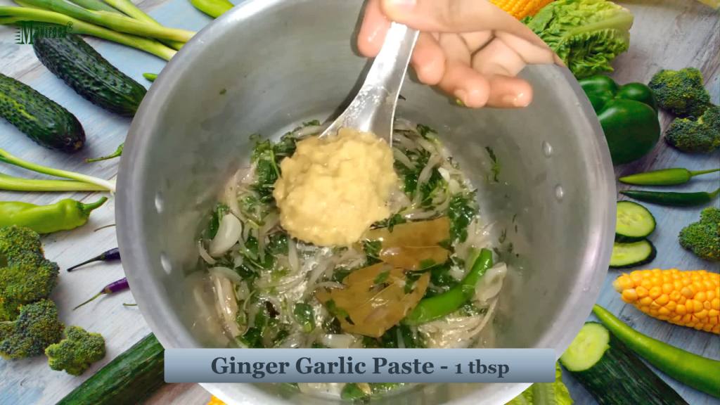 Add 1 tsp of ginger garlic paste, and fry it till the raw smell disappears. Put 1.5 tsp of coriander powder, 1/4 tsp of turmeric powder, and 1/2 tsp of chilly powder.