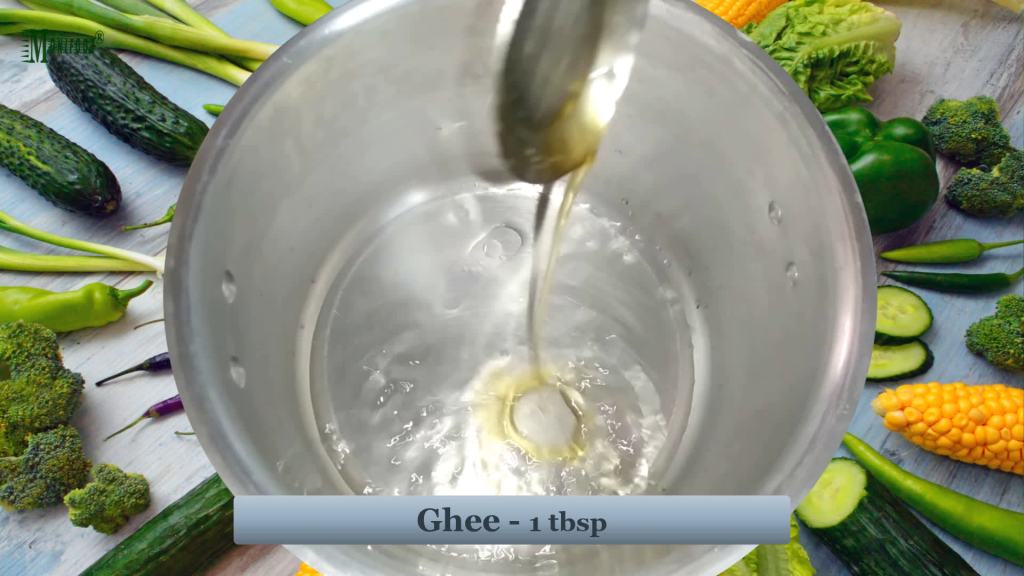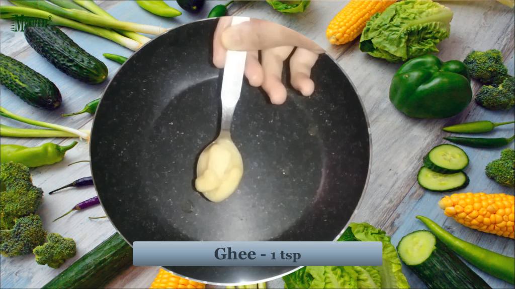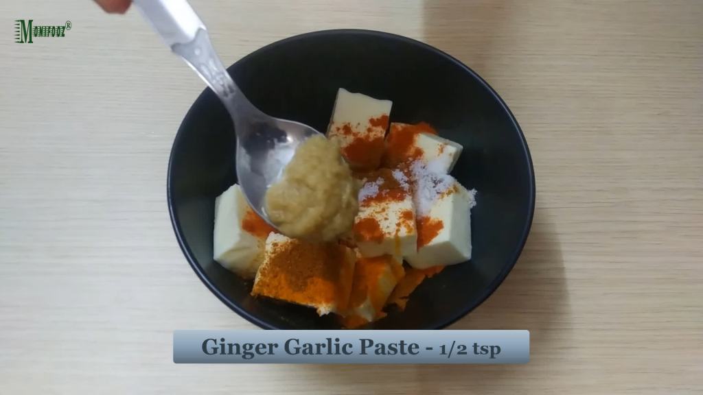 Add 1/2 tsp of ginger garlic paste and mix it gently. Let it rest for 15 minutes. Heat the pan with medium heat and add 1 tsp of ghee into it. Add the marinated paneer and fry it for 5 minutes.