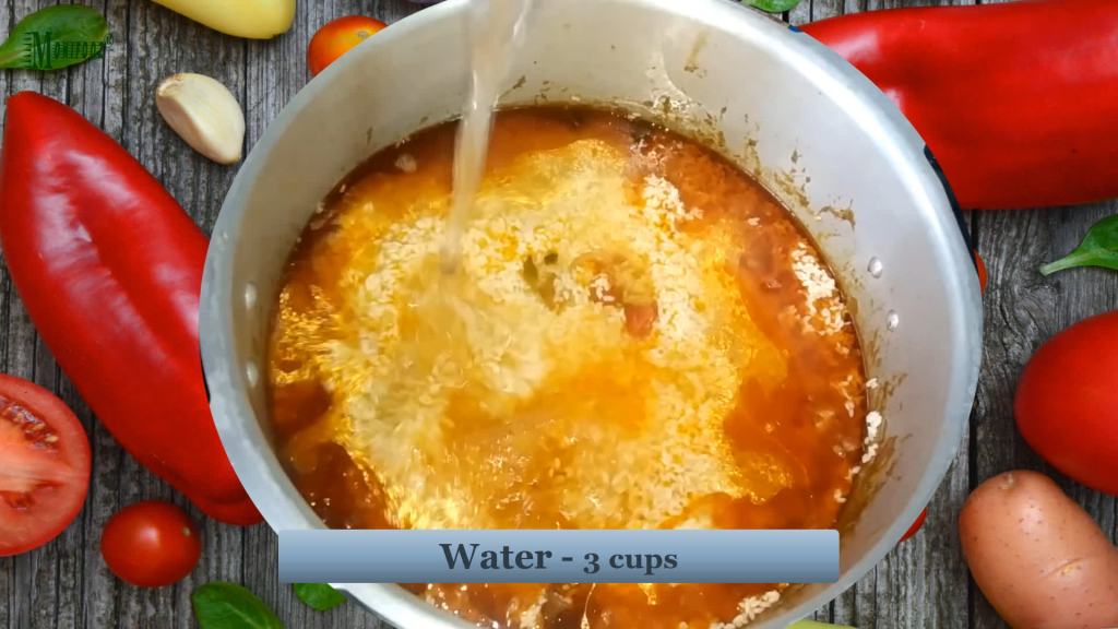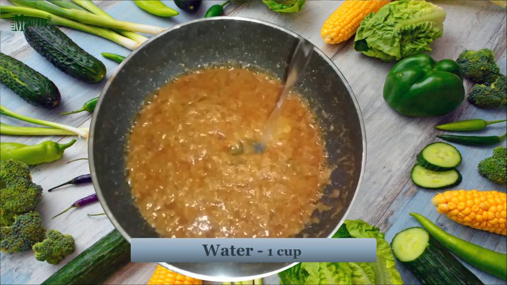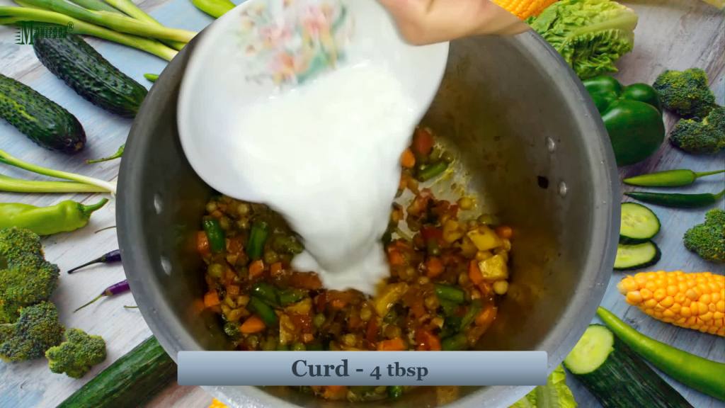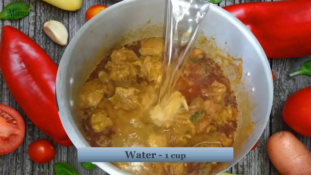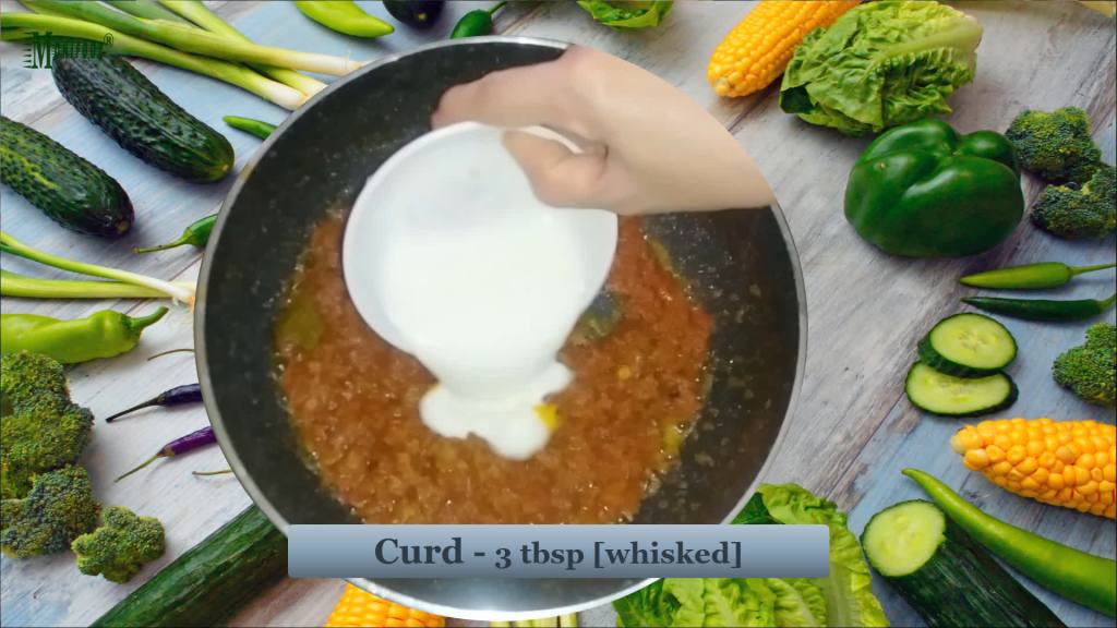 Pour 3 tbsp of whisked curd into it. Mix it well and cook till oil separates. Pour 1 cup of water and add the required salt needed for gravy. Mix it and let it boil.