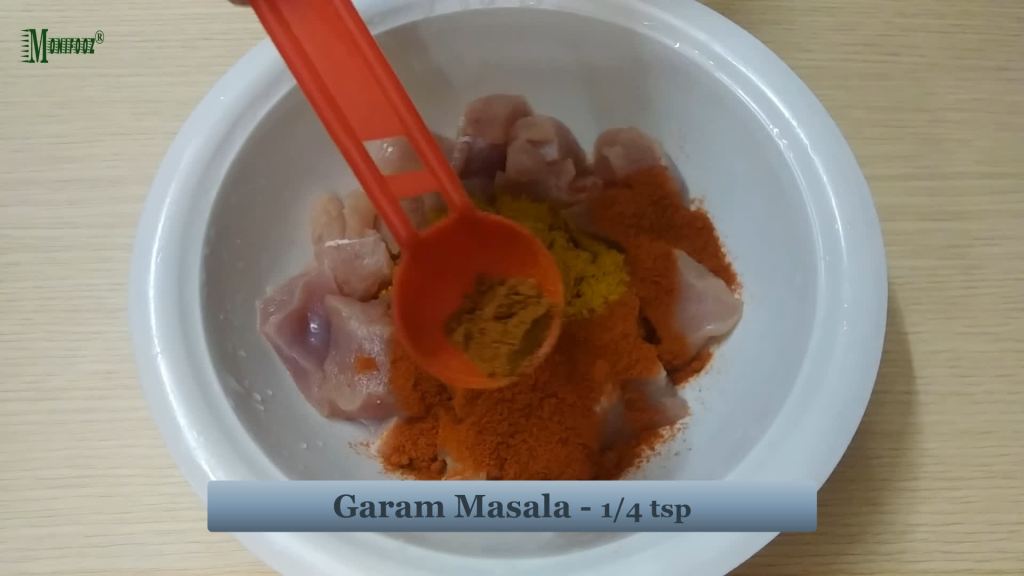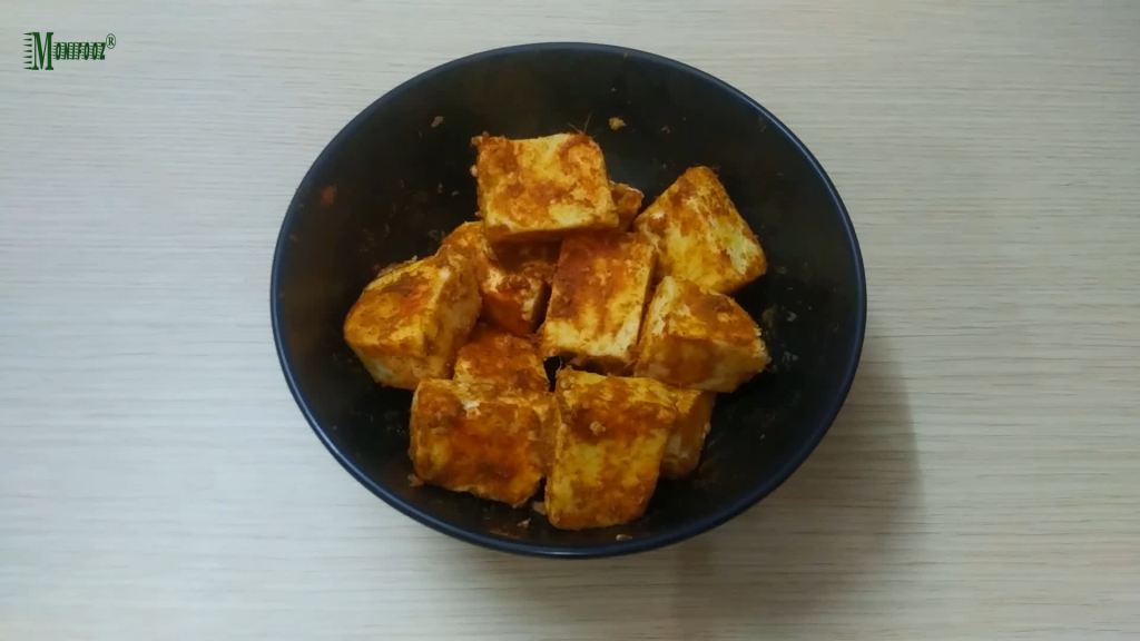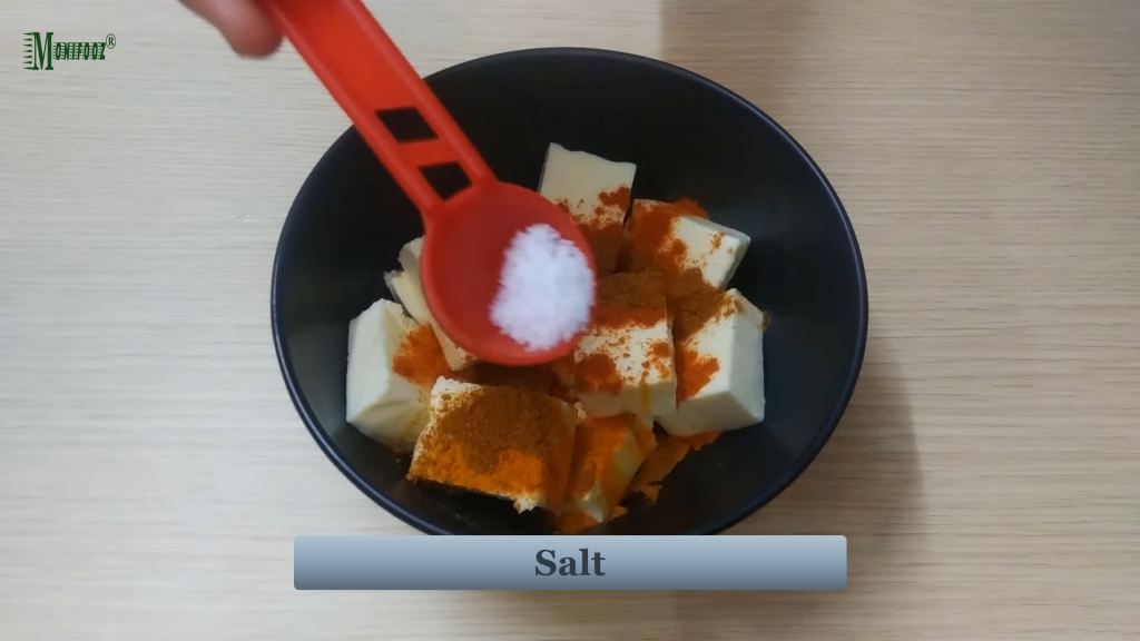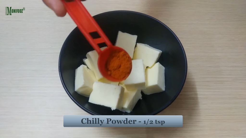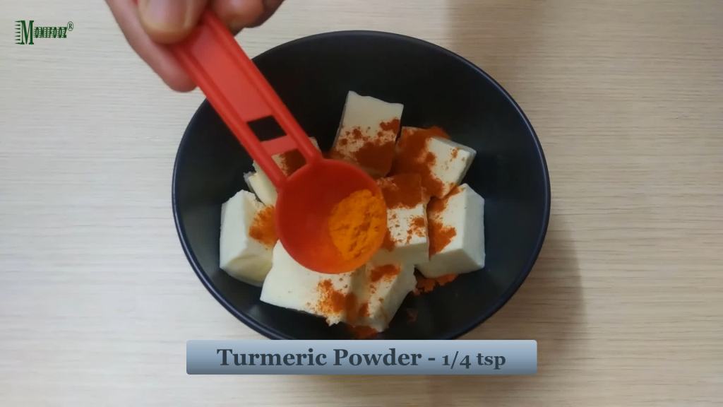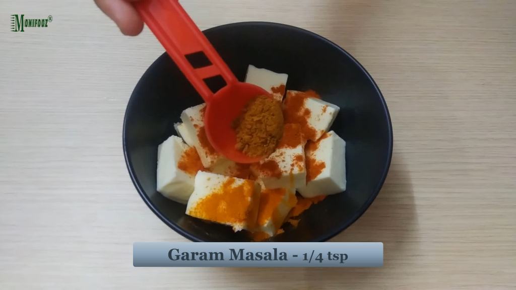 Take 200g of paneer in a bowl and add 1/2 tsp of chilly powder along with 1/4 tsp of turmeric powder. Put 1/4 tsp of garam masala and the required salt as per your preferred taste.